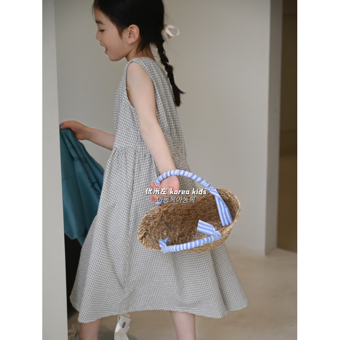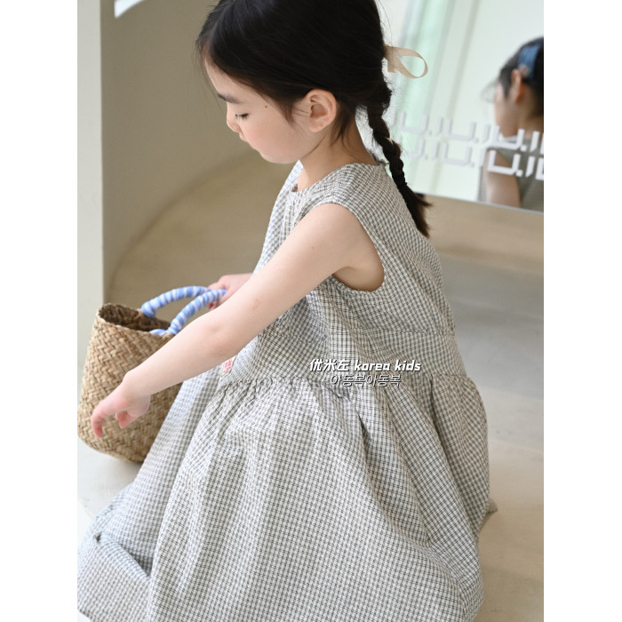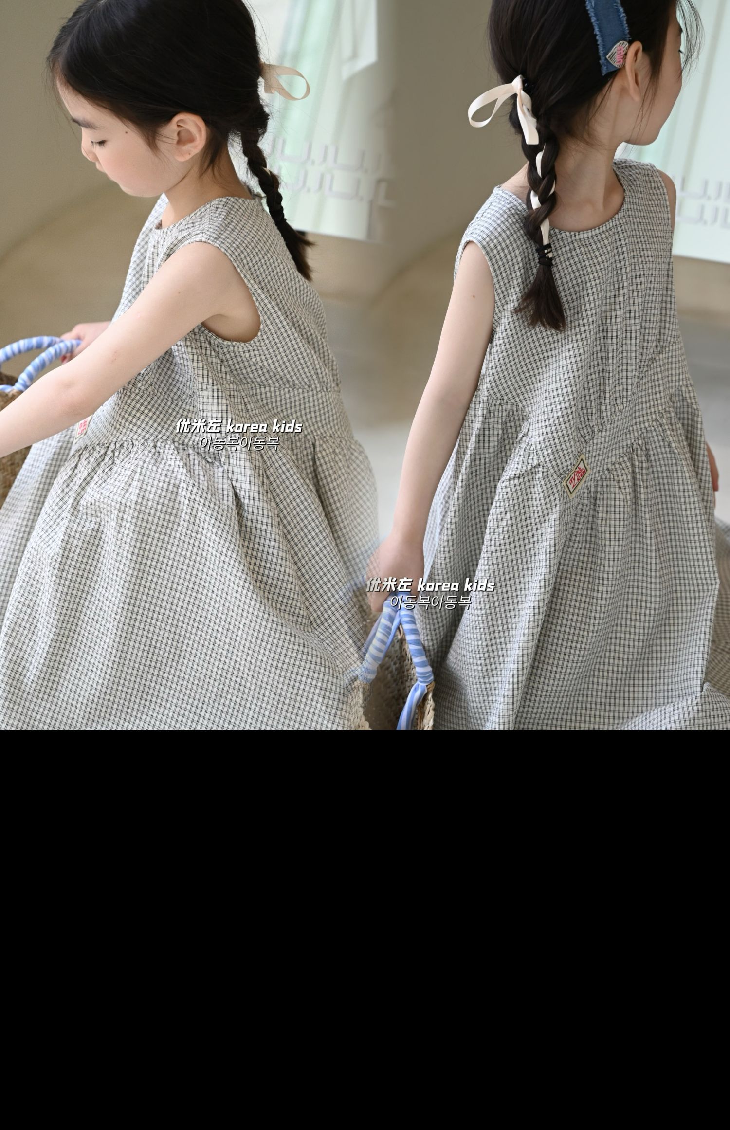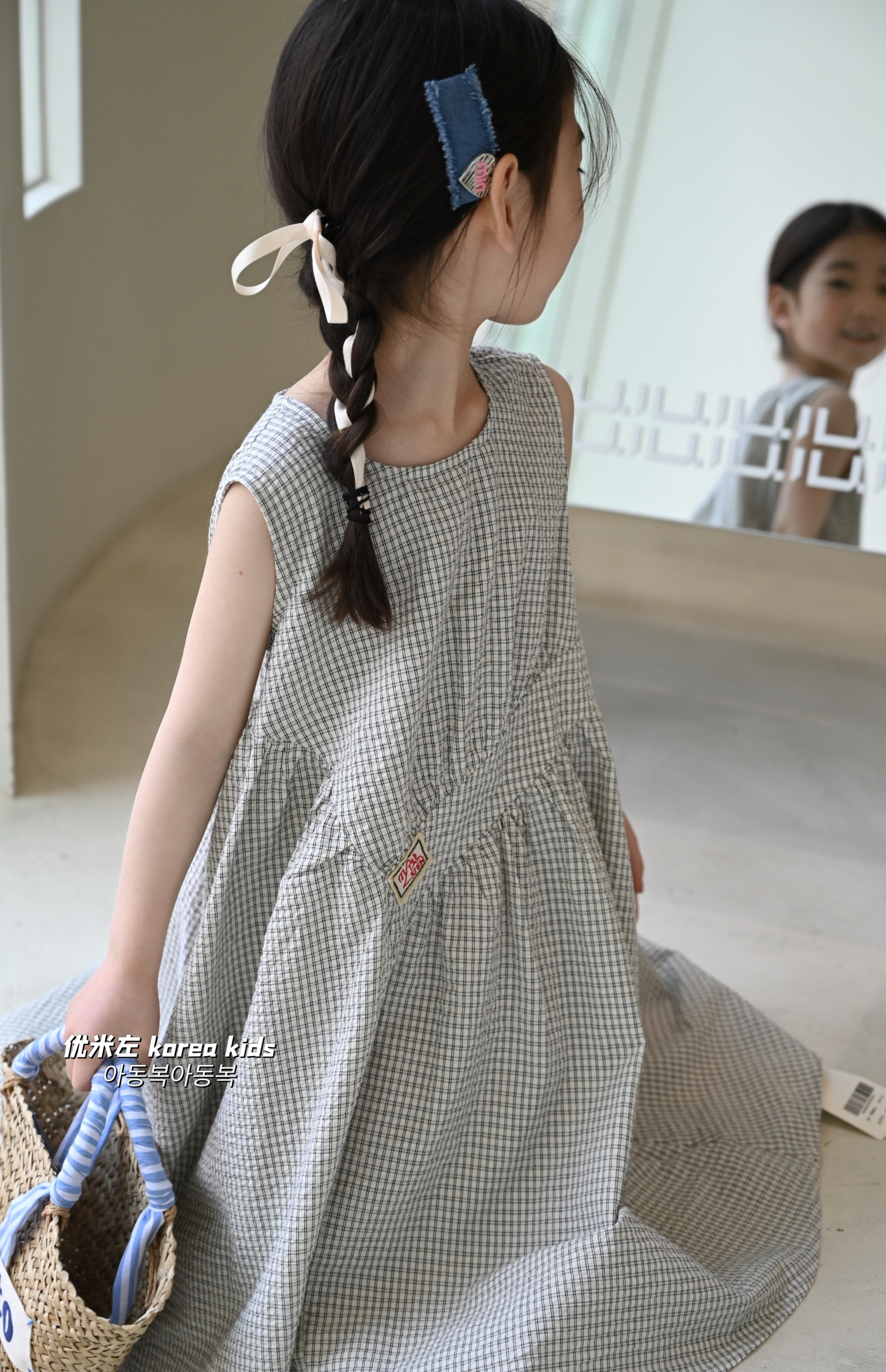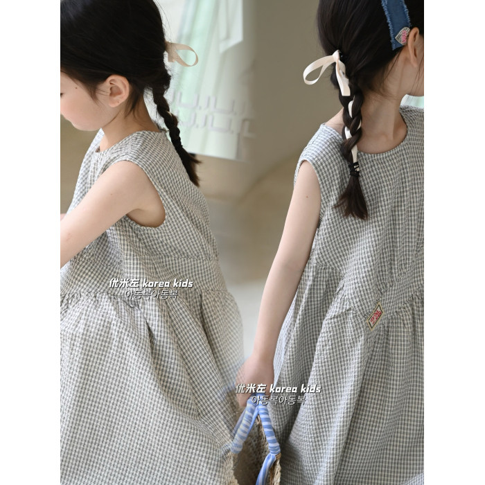 2025夏季新款韓版兒童設計感格子連衣裙女童簡約泡泡棉無袖背心裙