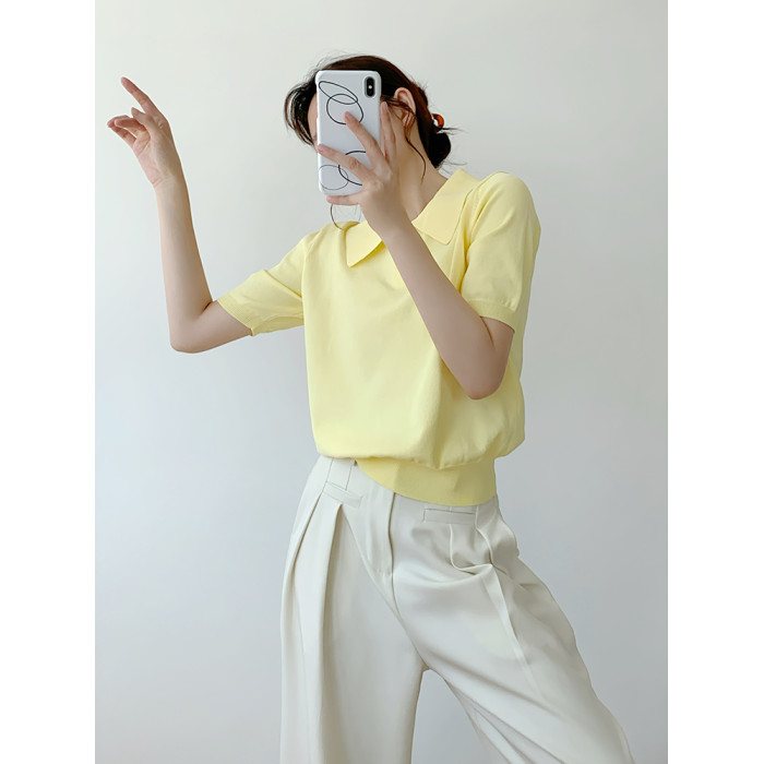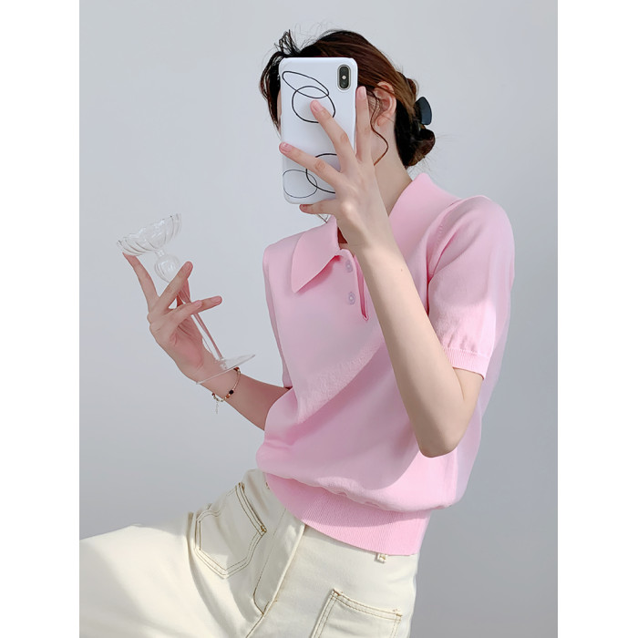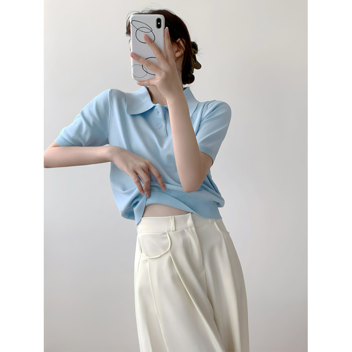 多巴胺奶藍色polo衫女t恤夏季2025新款冰絲針織短袖收腰上衣短款