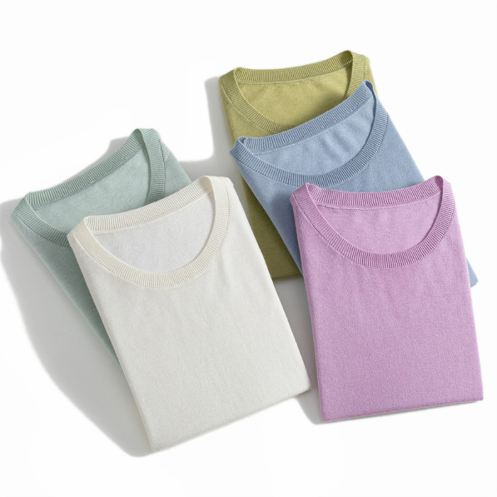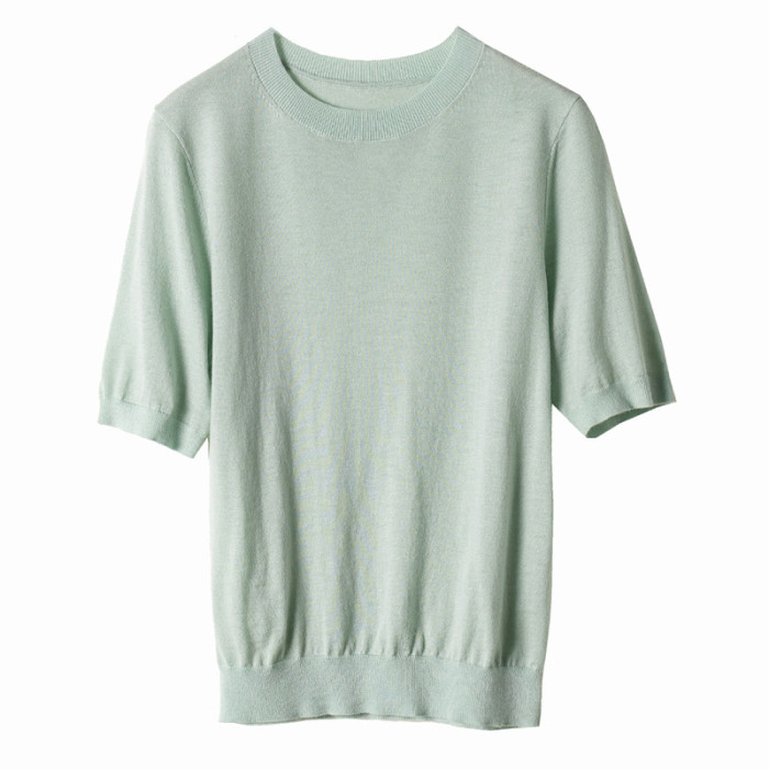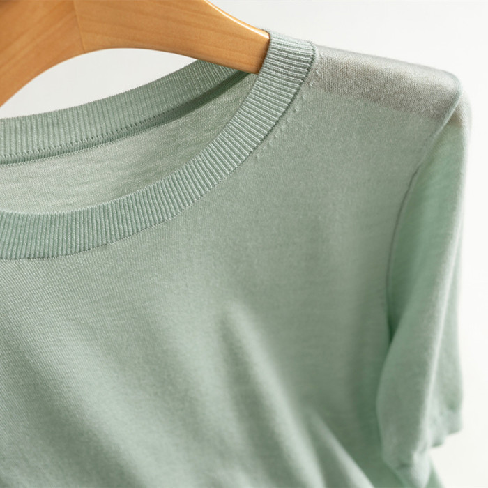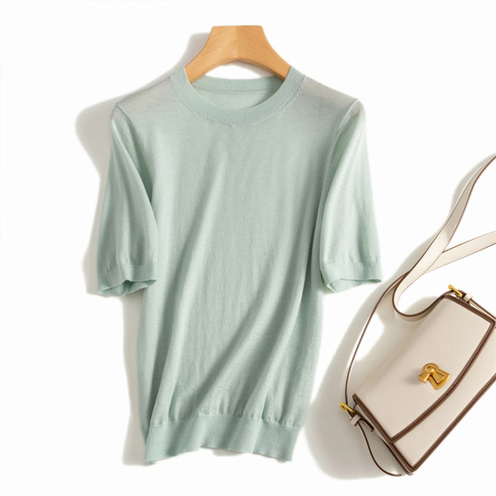 精紡細支100純羊毛針織短袖打底衫女T恤圓領夏季薄毛衣簡約百搭潮