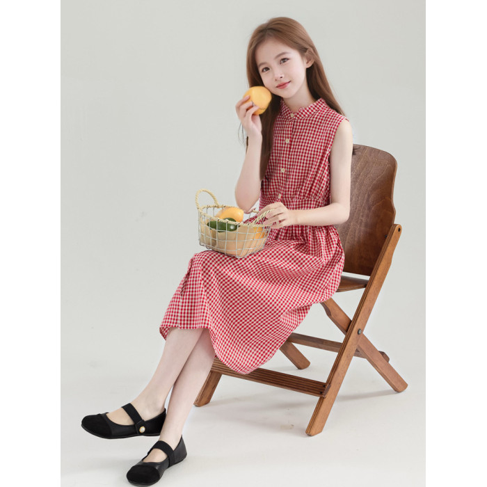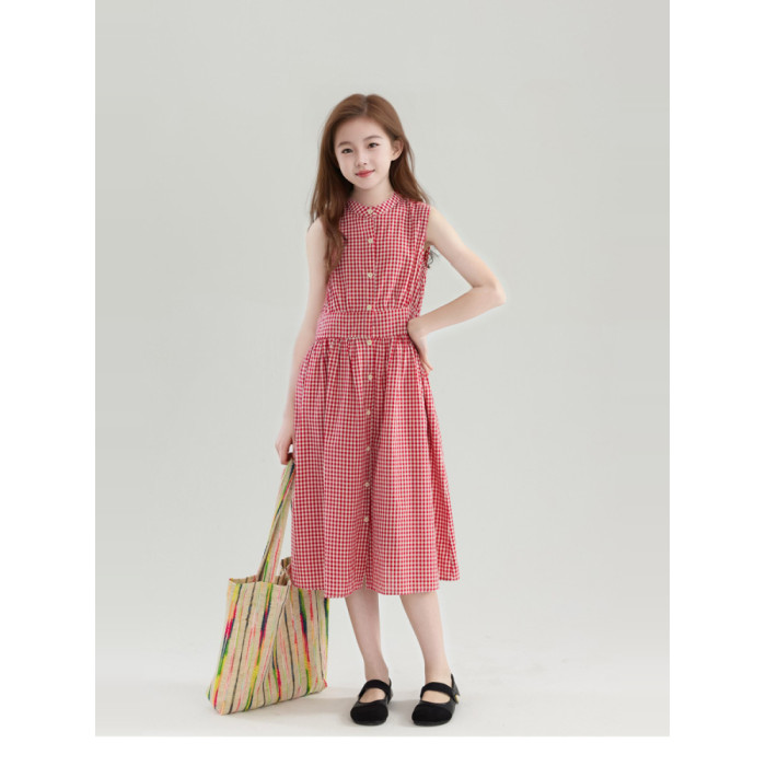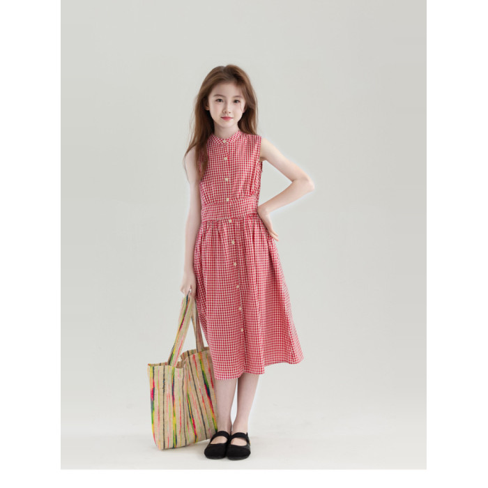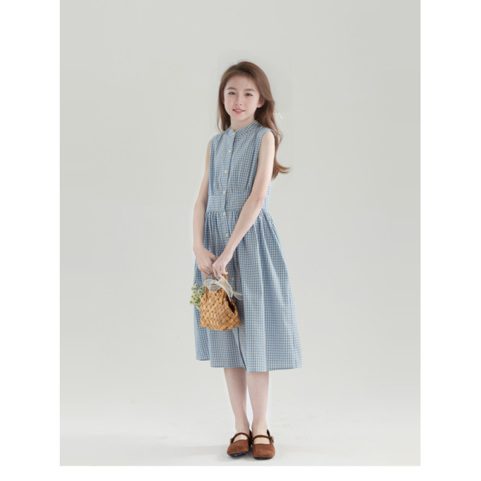 夏季女童經典藍色純棉格子連衣裙 童裝新品純棉無袖裙子 中大兒童