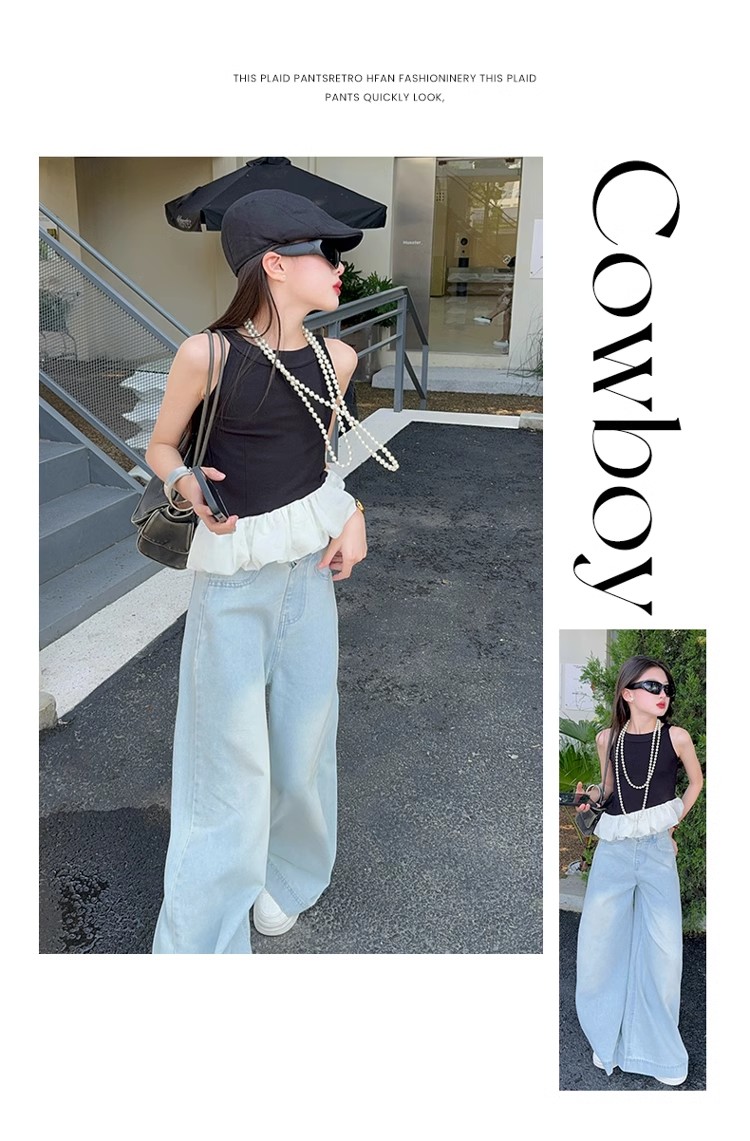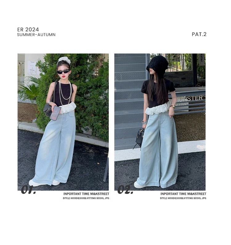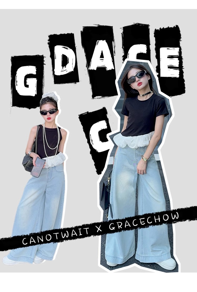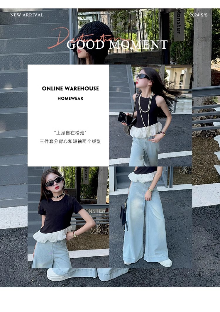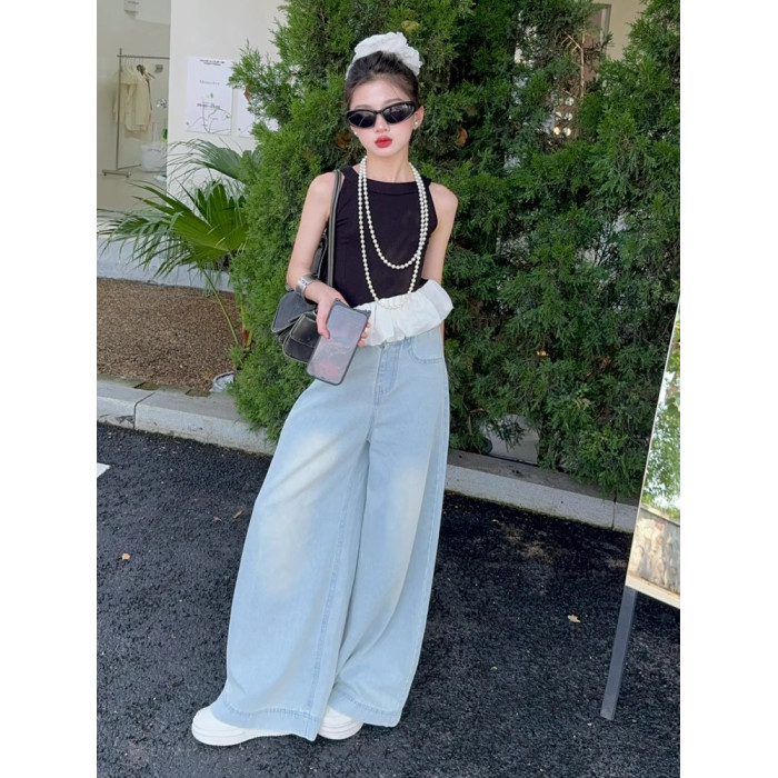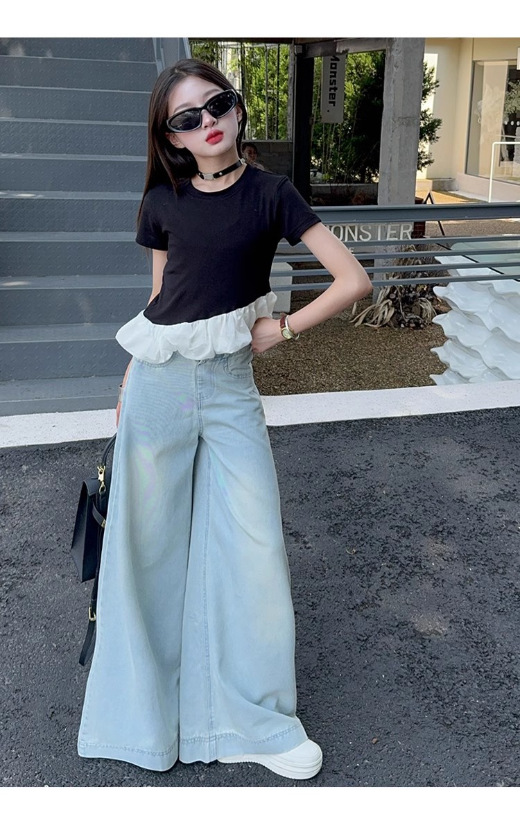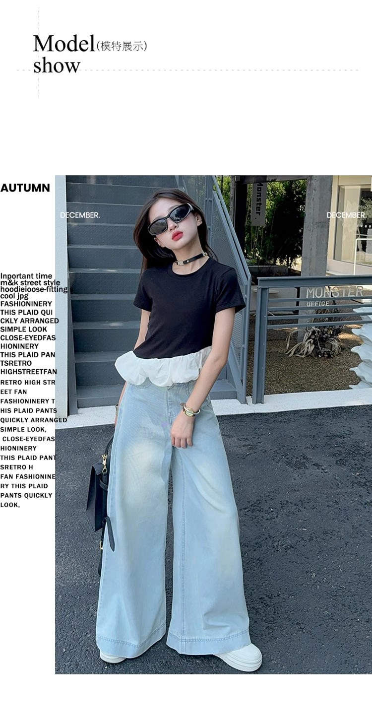 女童短袖T恤2025新款大童女裝輕奢小衆穿搭女孩牛仔濶腿褲夏套裝