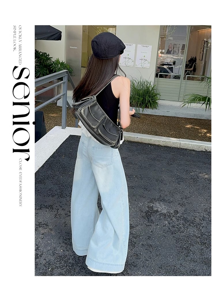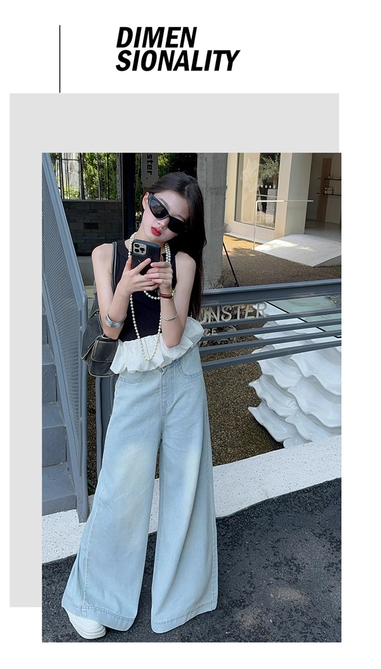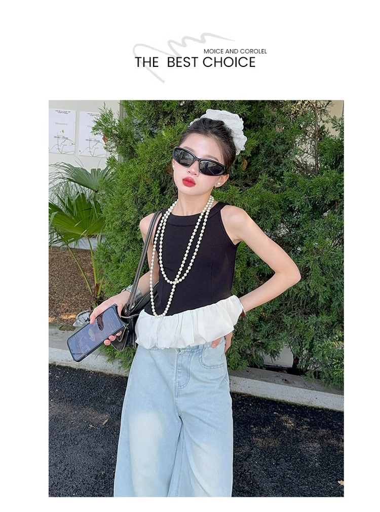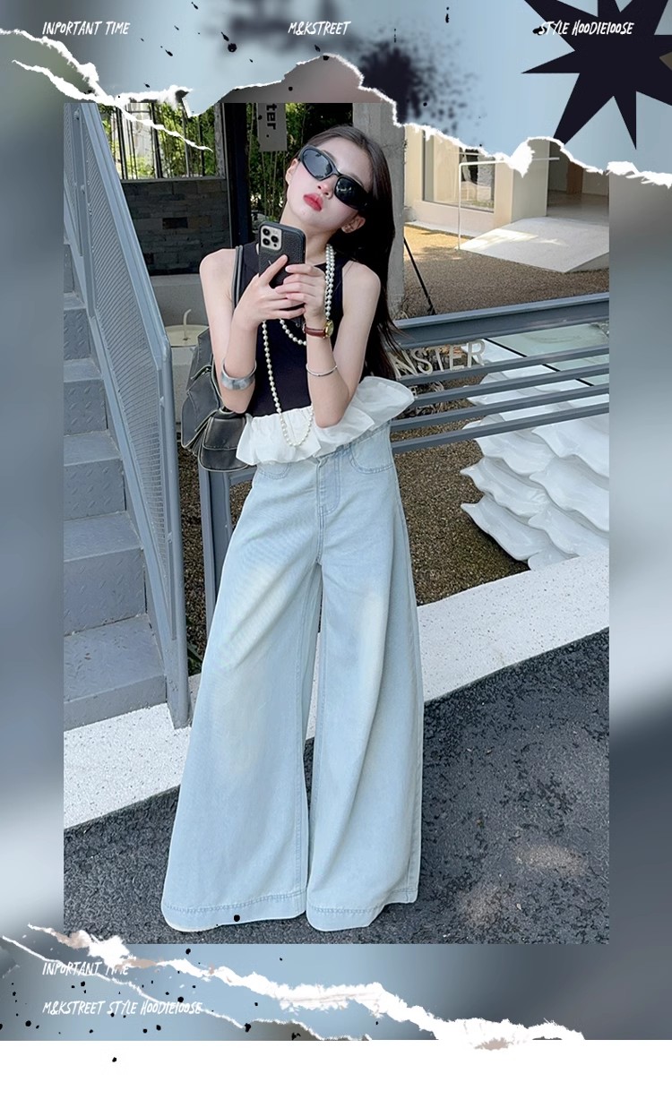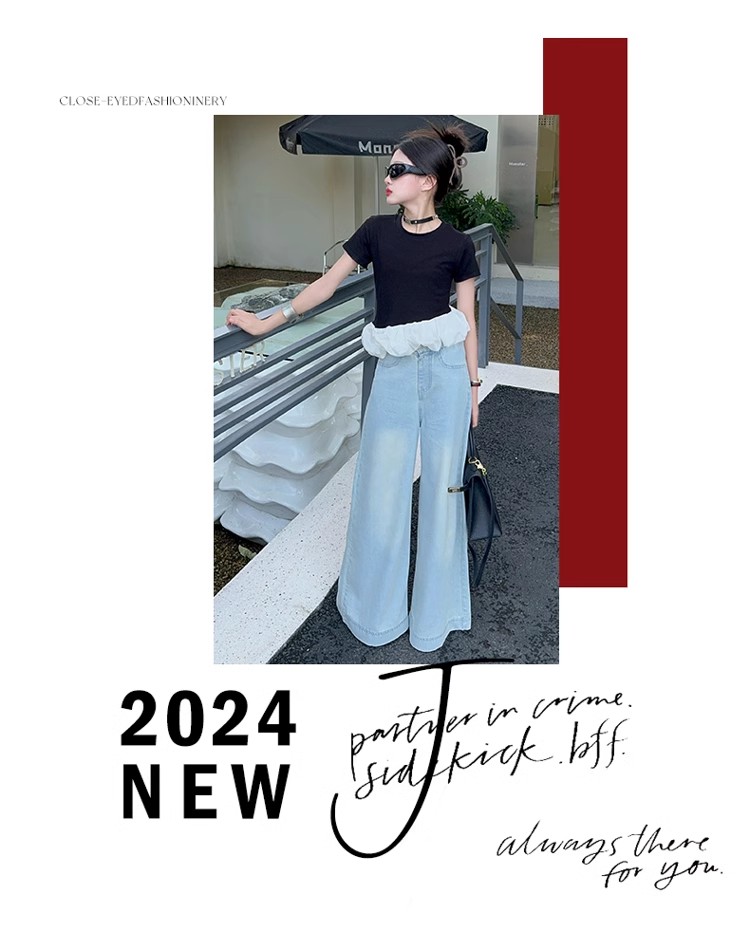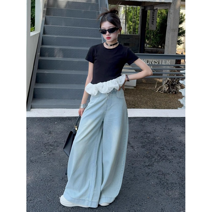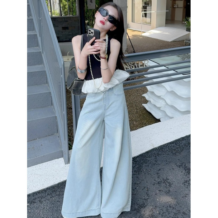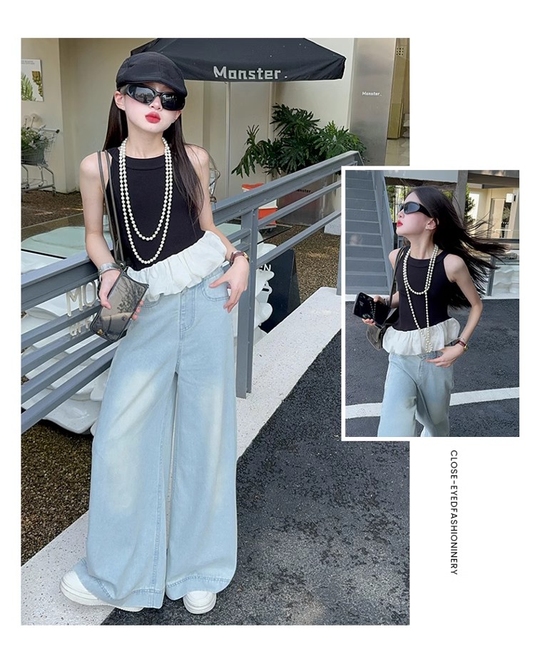 女童短袖T恤2025新款大童女裝輕奢小衆穿搭女孩牛仔濶腿褲夏套裝