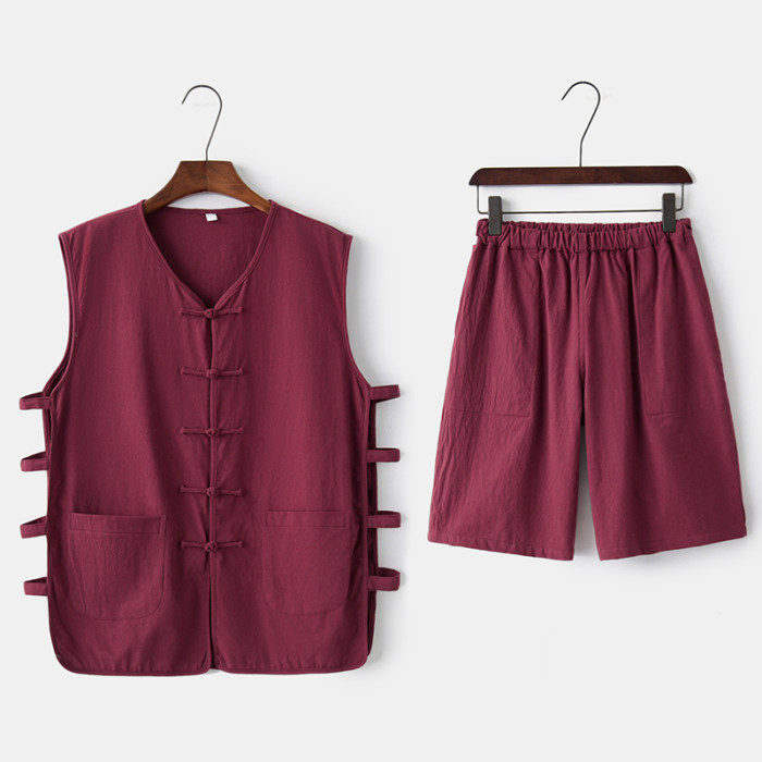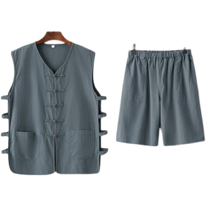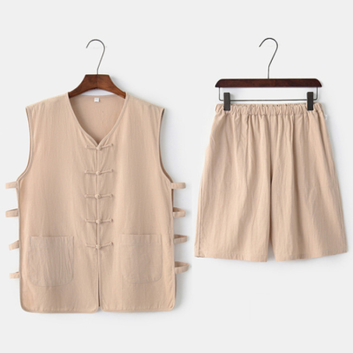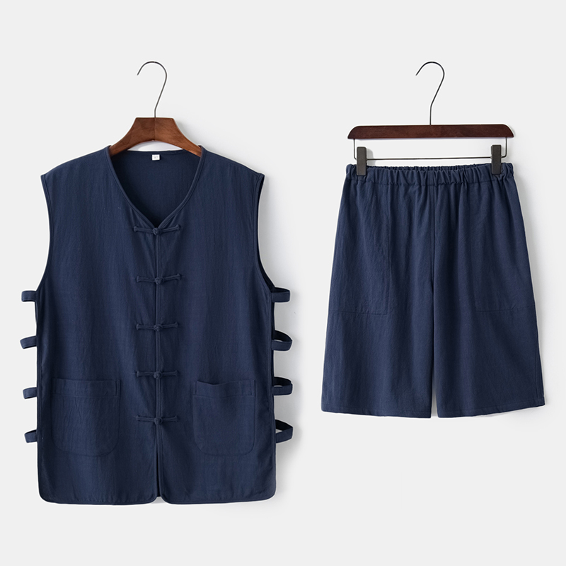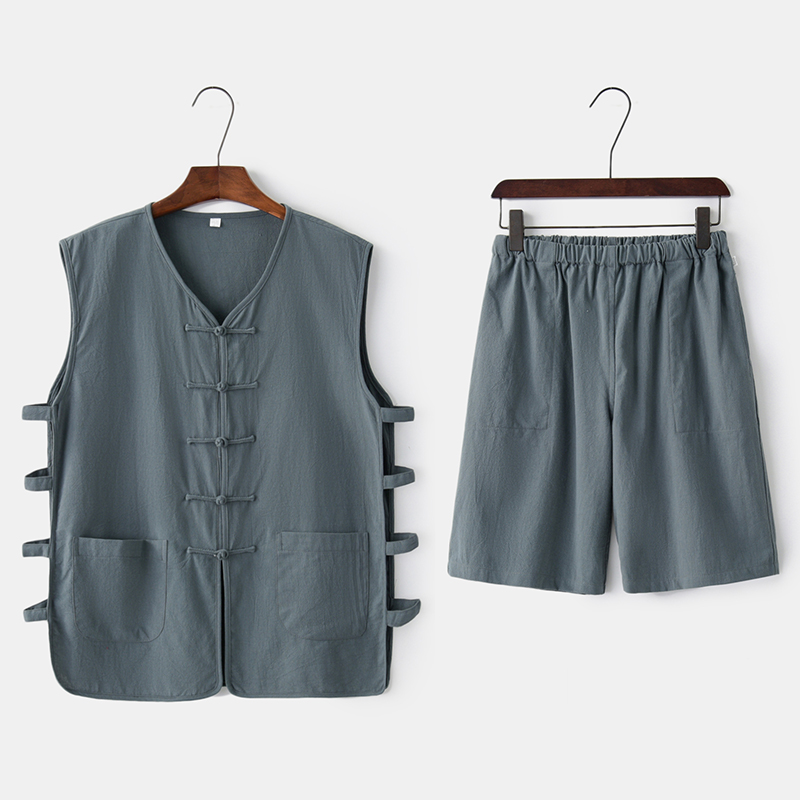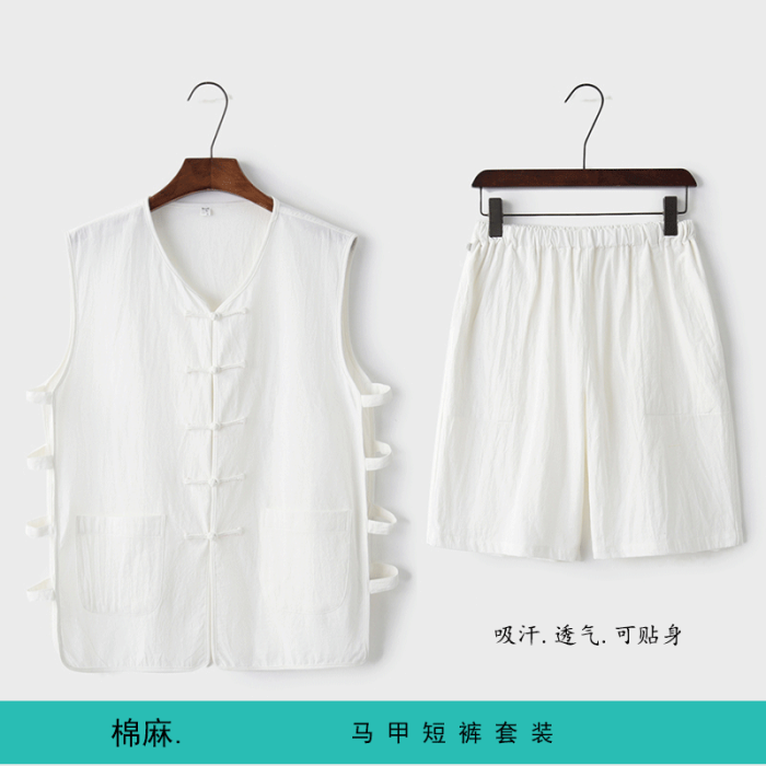 唐裝男夏棉麻汗衫短褲套裝薄款馬褂馬甲風休閒兩件套清涼透氣