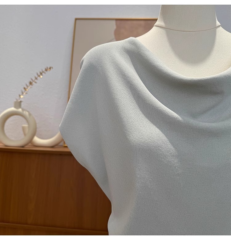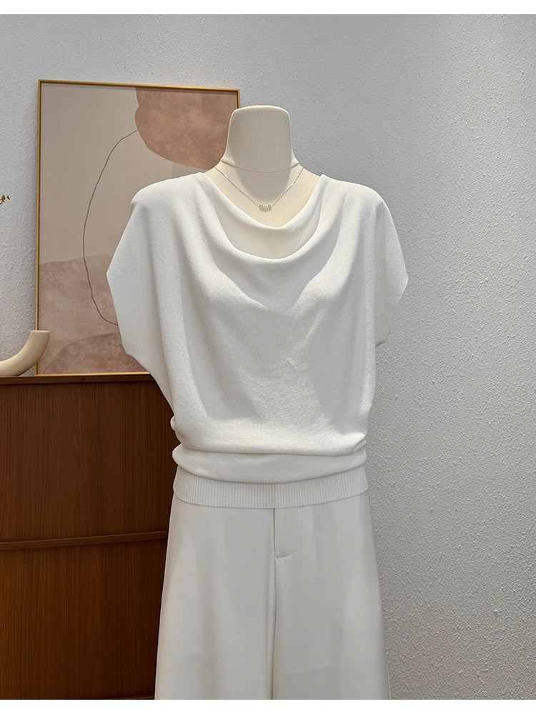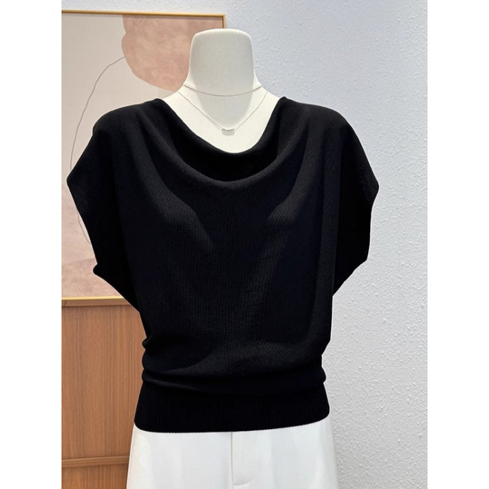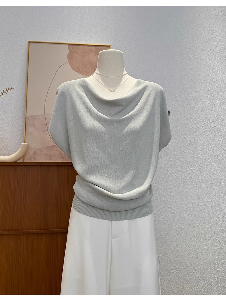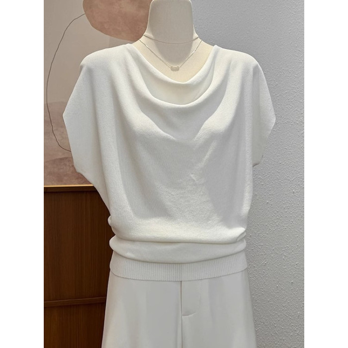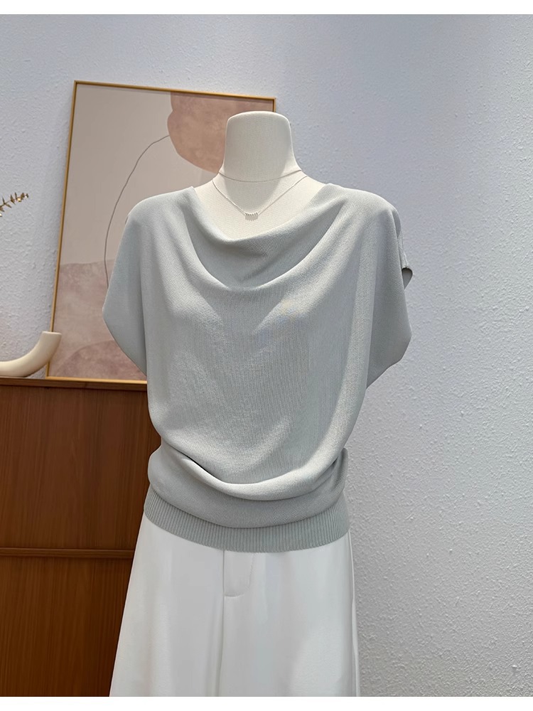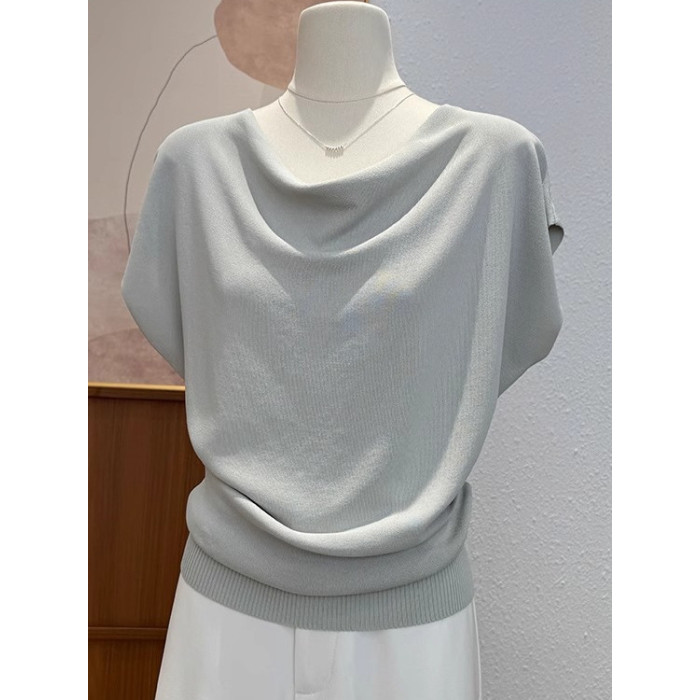 韓系蕩領短袖冰絲針織衫女t恤夏季新款收腰顯瘦一字肩上衣高級感