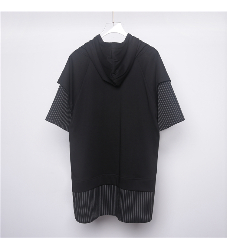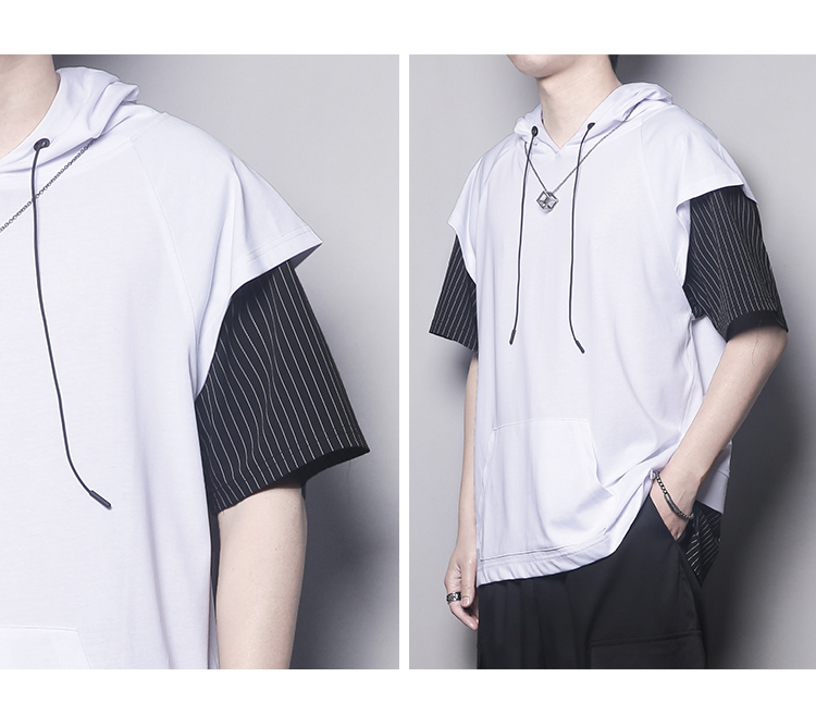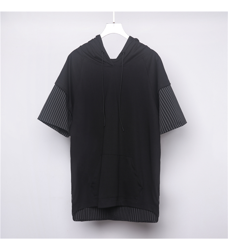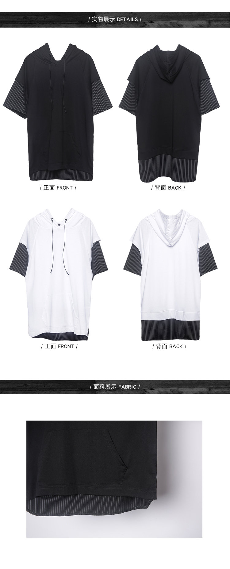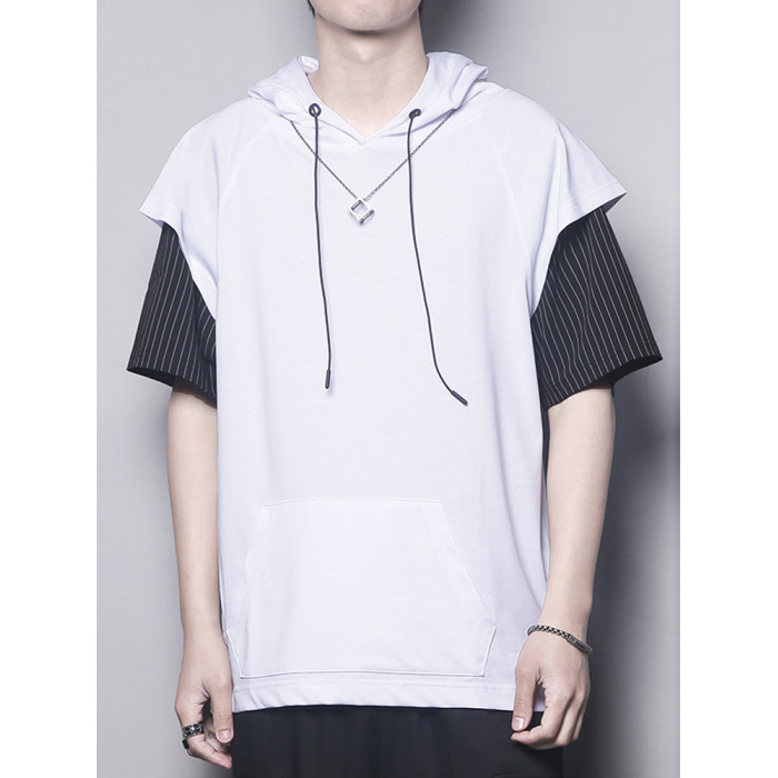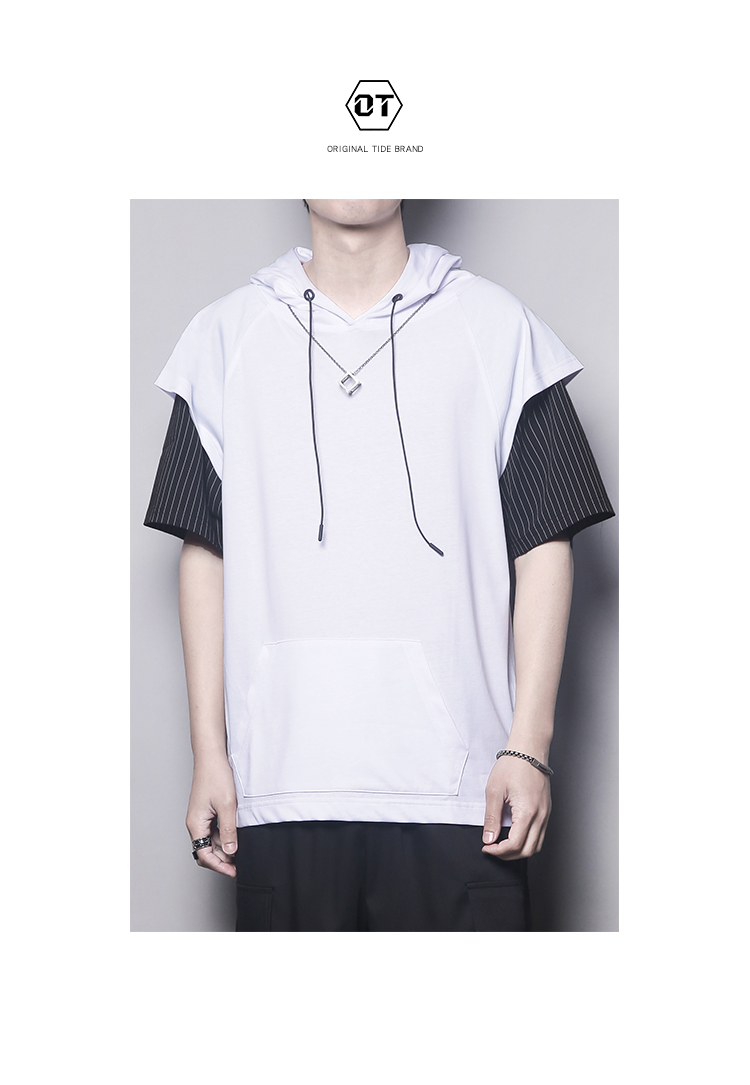 夏日系拼接撞色馬甲假兩件連帽條紋休閒寬松短袖t恤男潮牌打底衫
