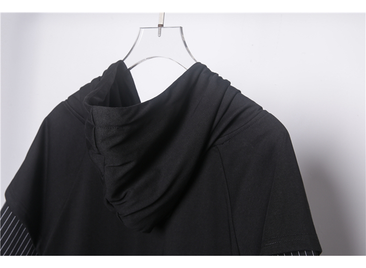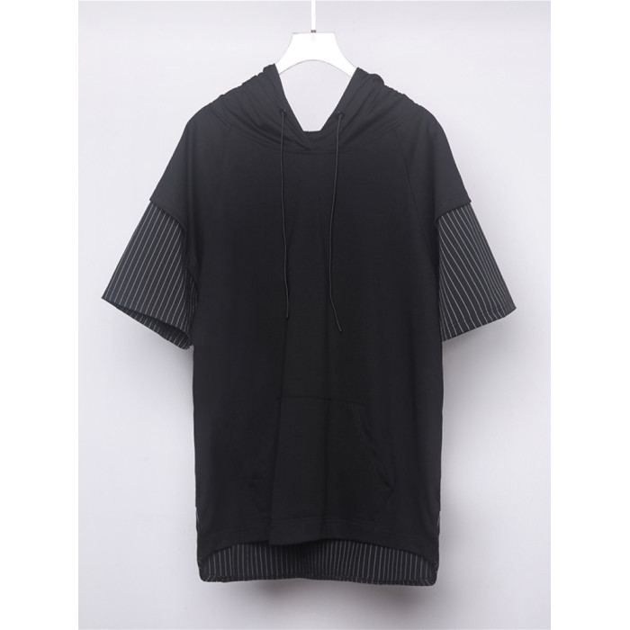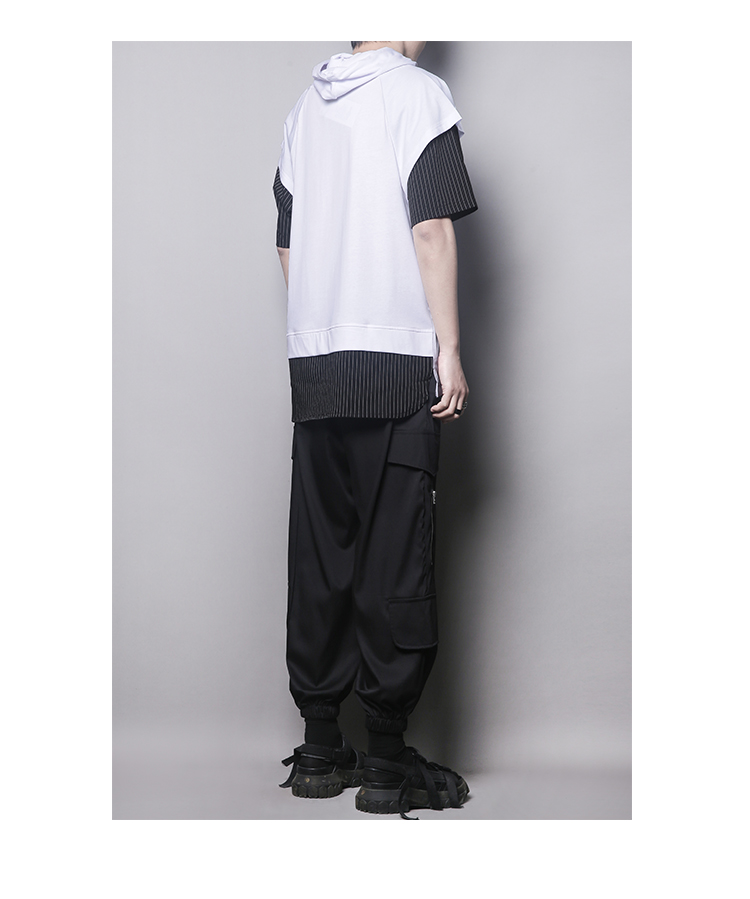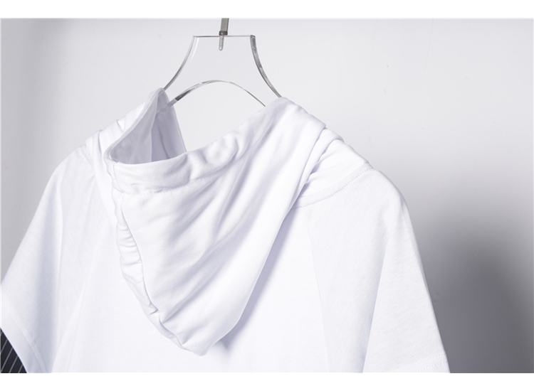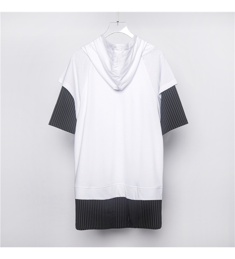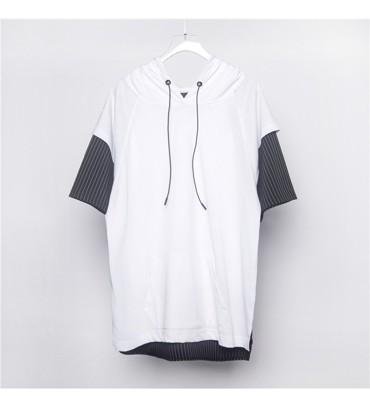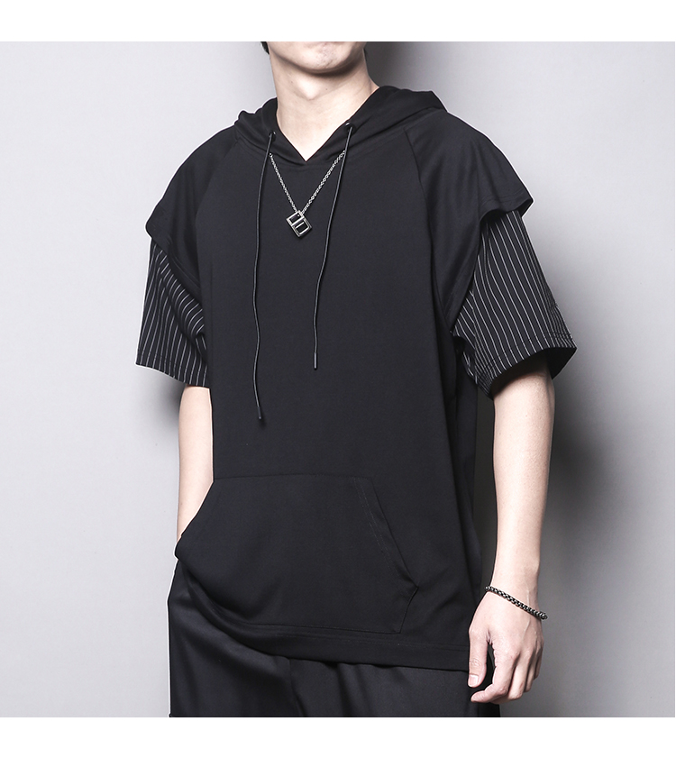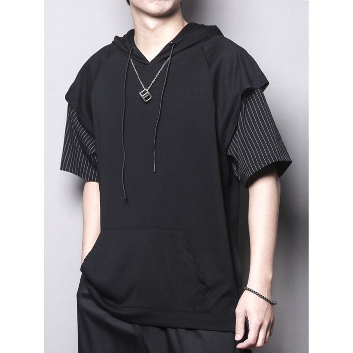 夏日系拼接撞色馬甲假兩件連帽條紋休閒寬松短袖t恤男潮牌打底衫