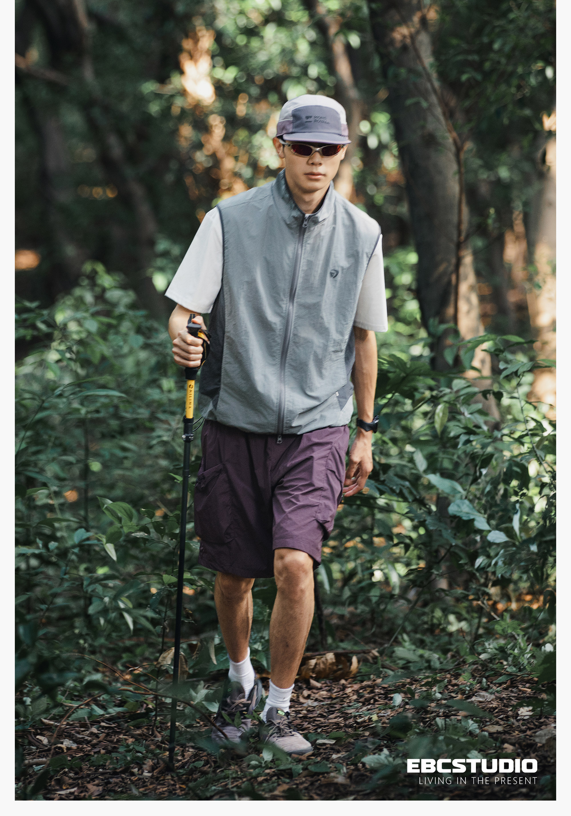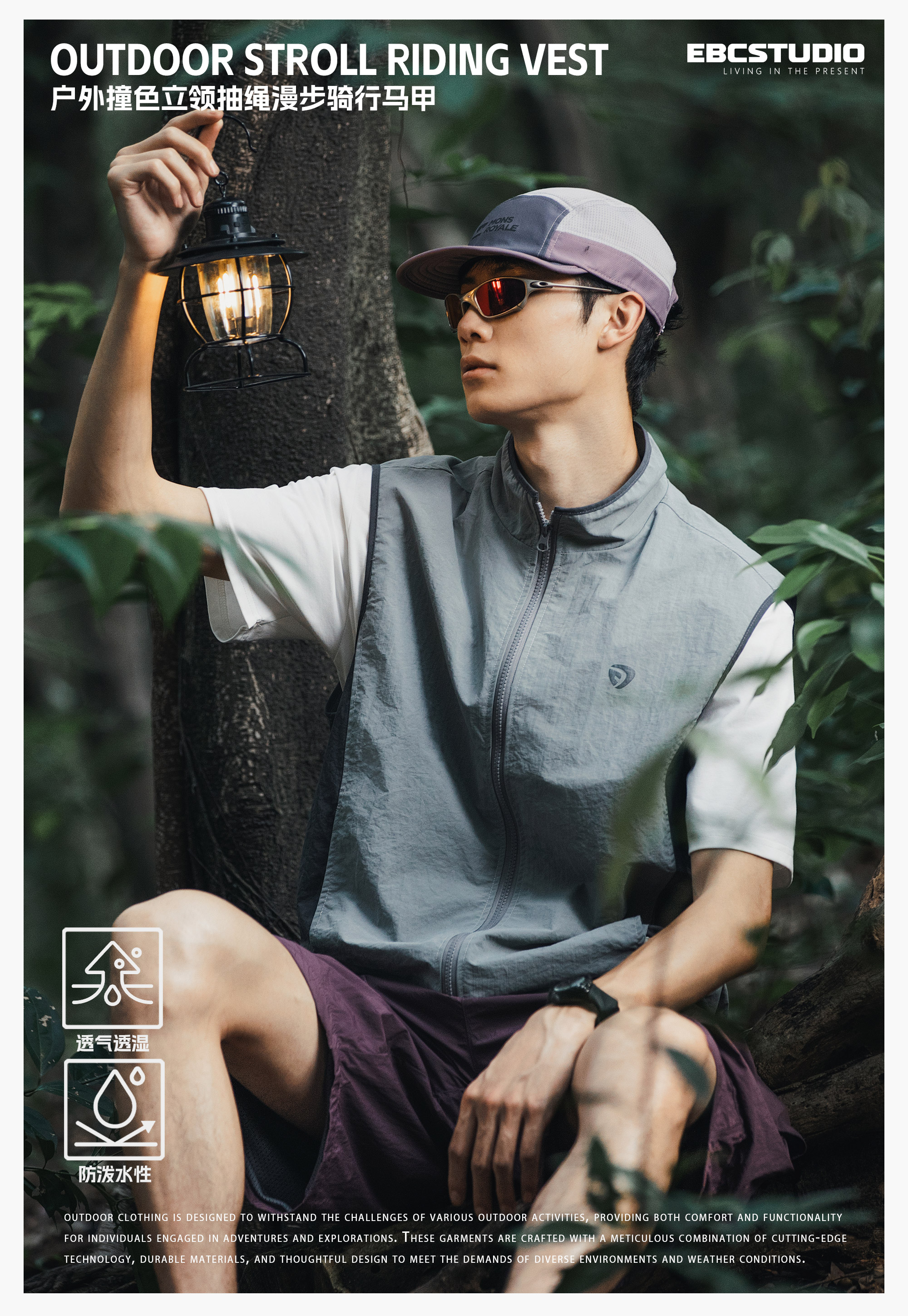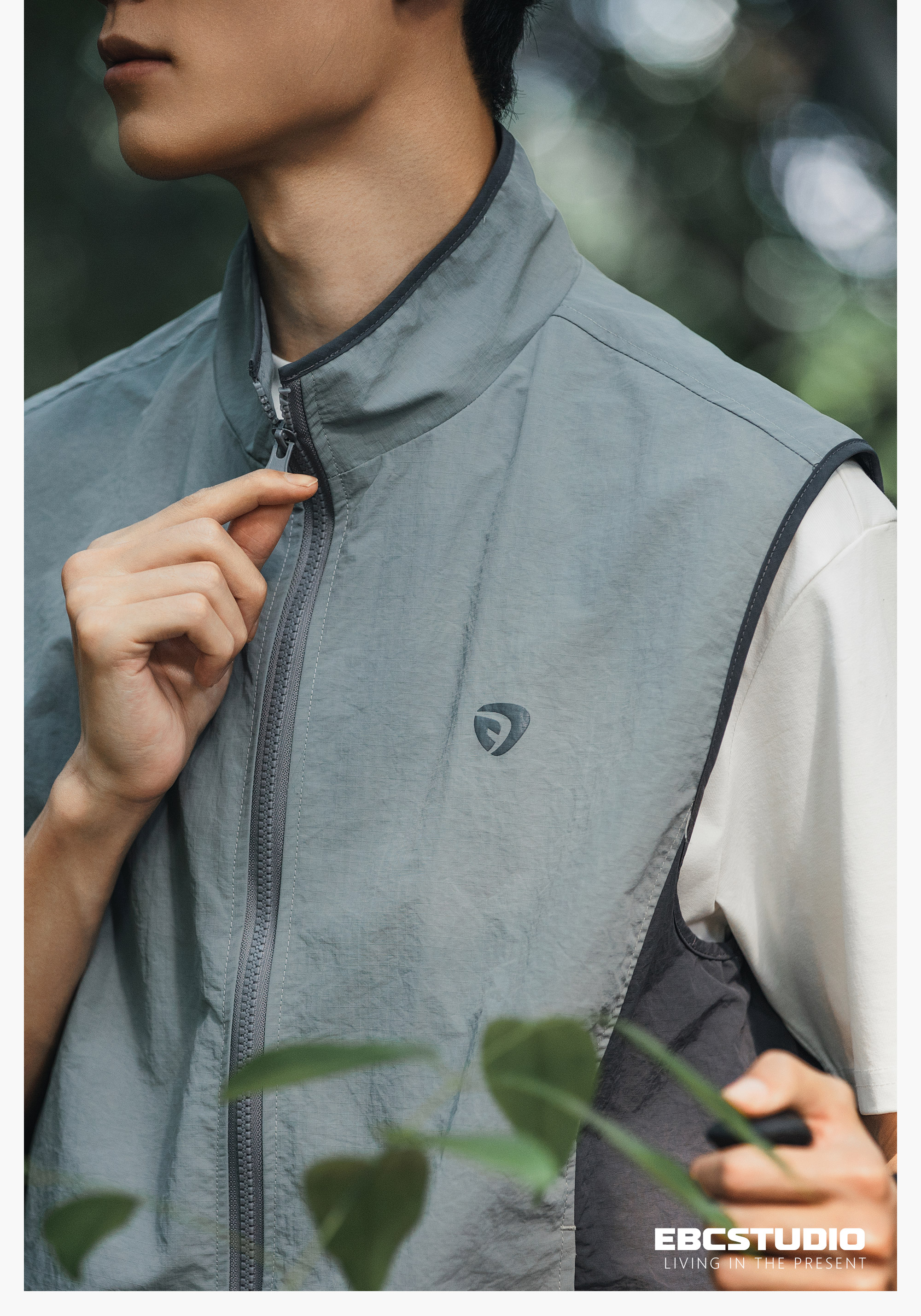 EBC工作室夏季戶外透氣輕薄撞色潮拼接印花款運動寬松立領馬甲男