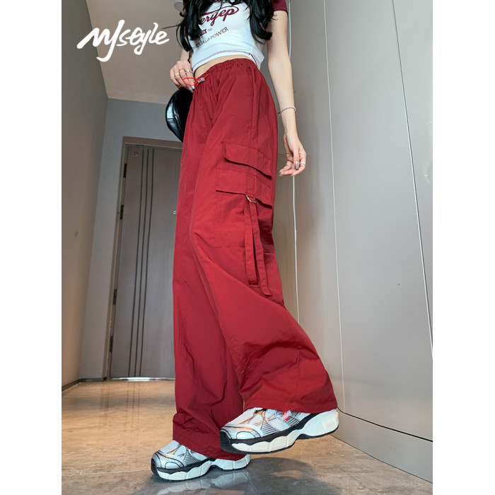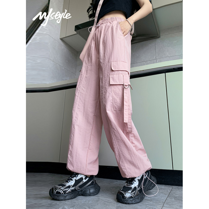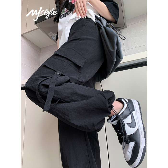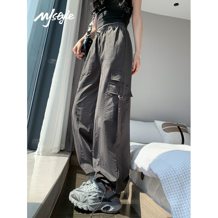 MJ STYLE高腰工裝褲繖兵女生2025夏季薄款速乾休閒百搭直筒濶腿褲