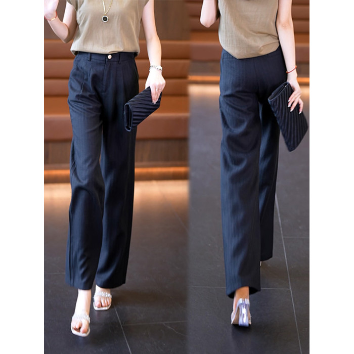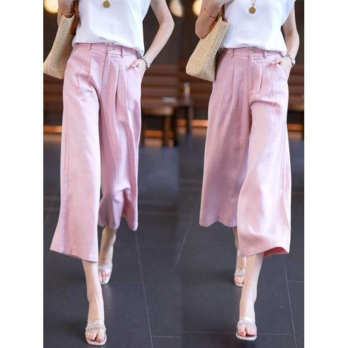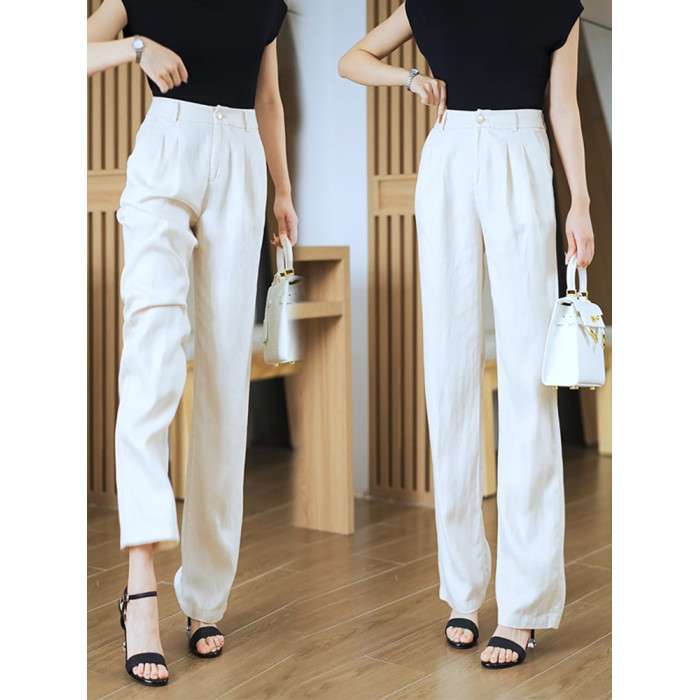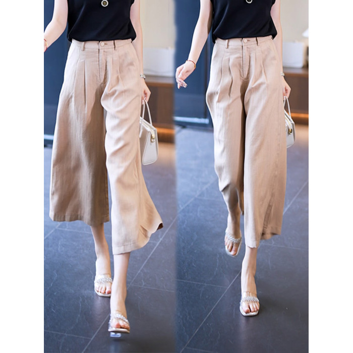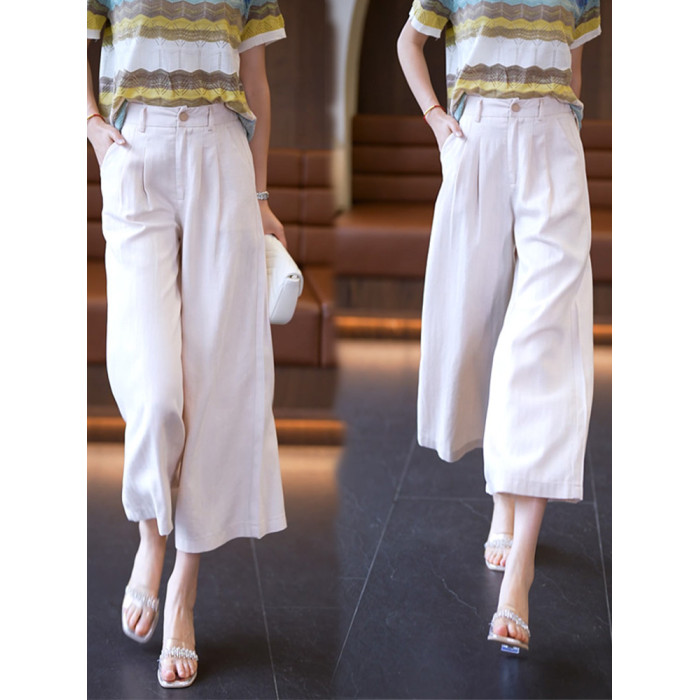 萊賽爾天絲亞麻八分濶腿褲女2024年夏季新款高腰寬松薄款直筒長褲