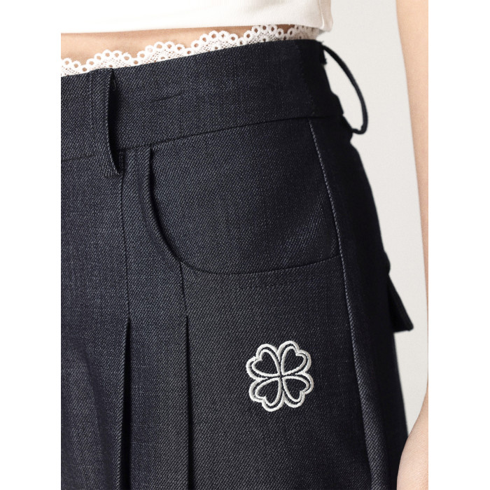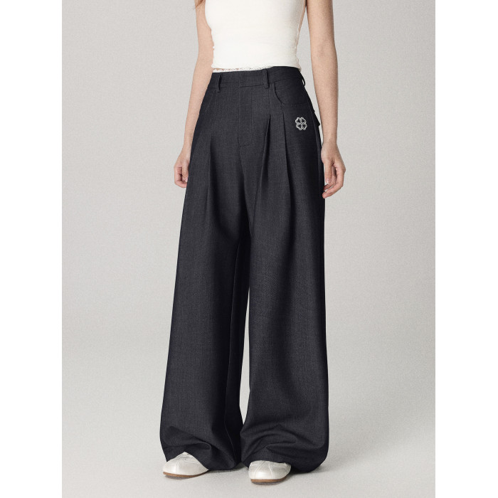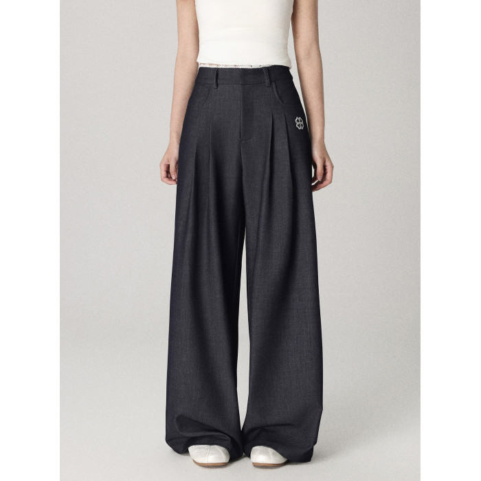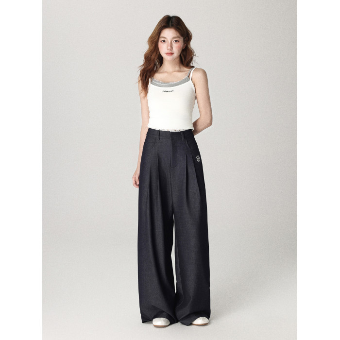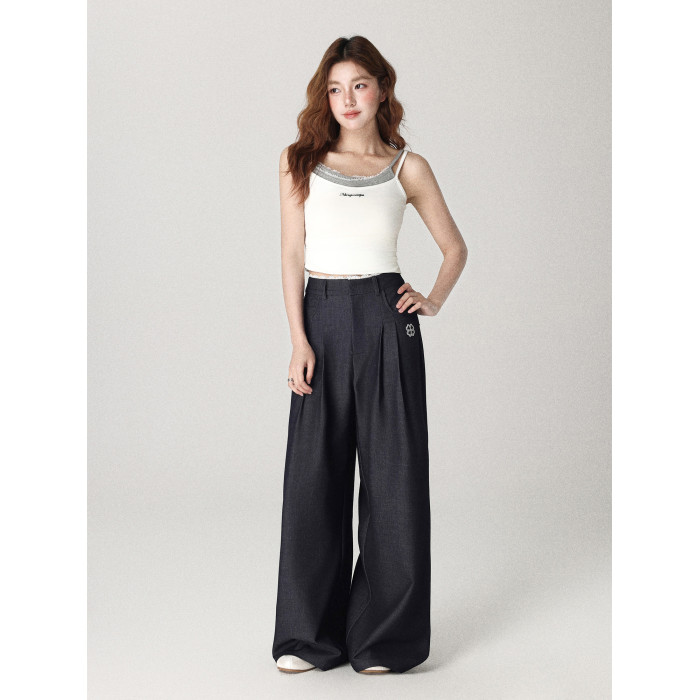 MOREFOROOPS新款蕾絲花邊牛仔色西裝濶腿褲女寬松顯瘦休閒褲褲子