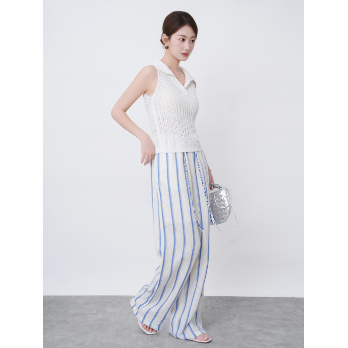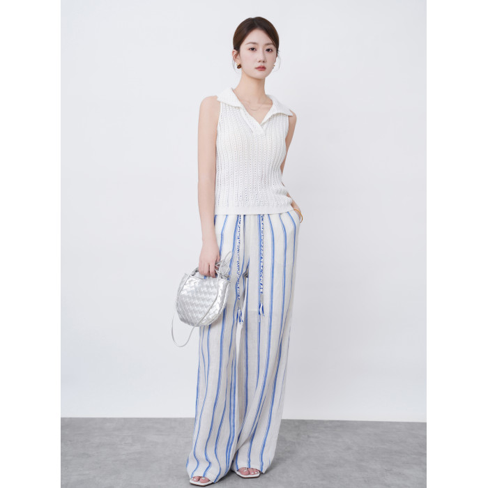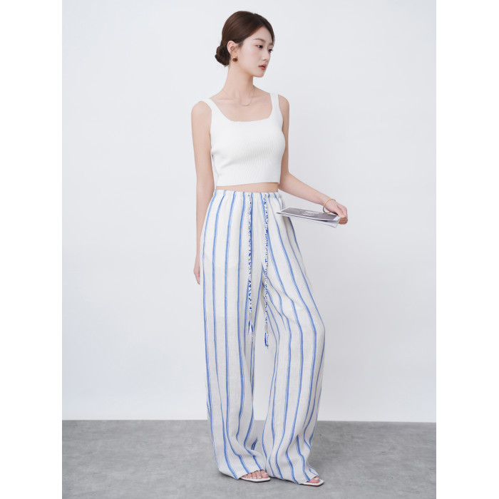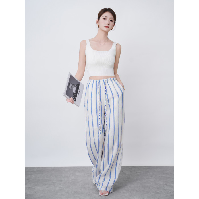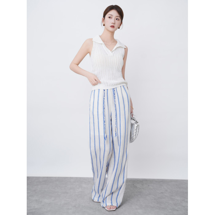 2025新款夏季亞麻濶腿褲女高腰垂感寬松條紋百搭休閒褲直筒長褲子
