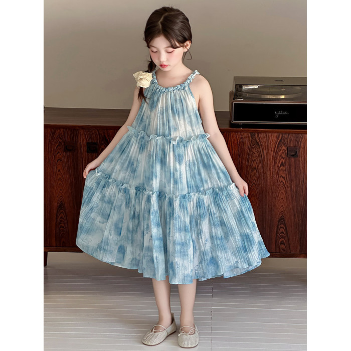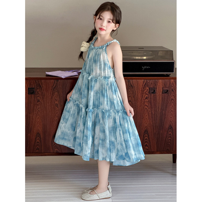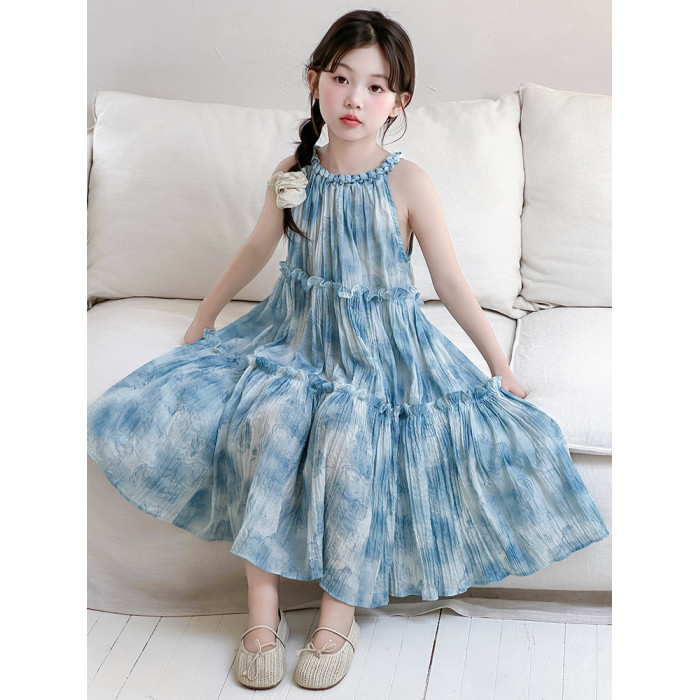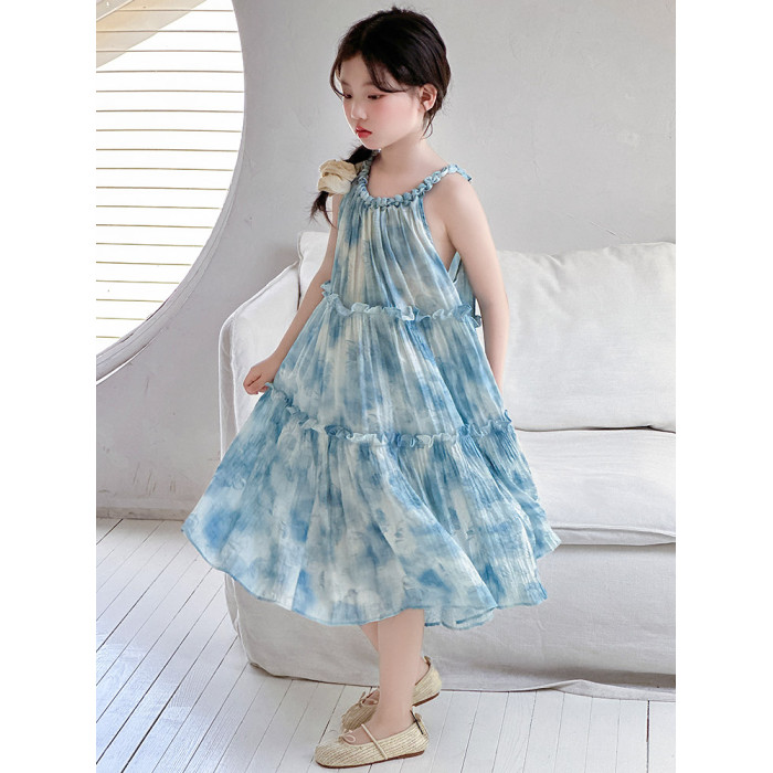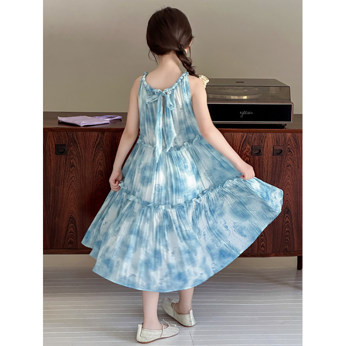 女童夏季無袖連衣裙中大童女孩夏日時尚韓範紥染吊帶蛋糕裙公主裙