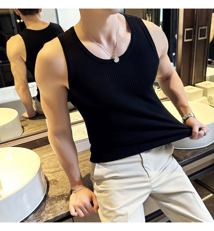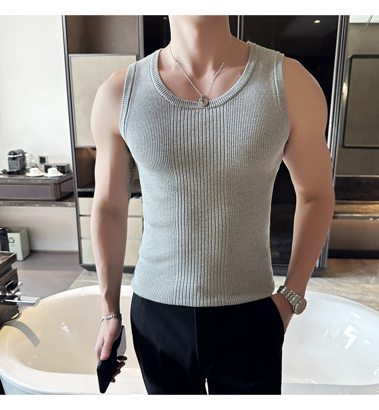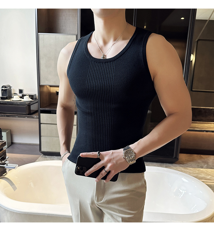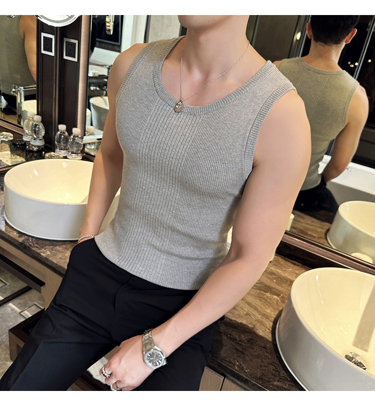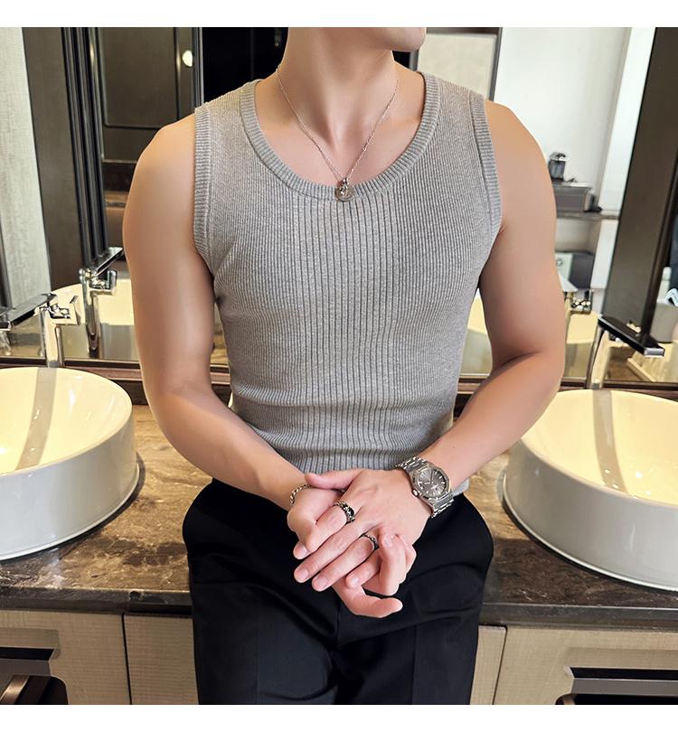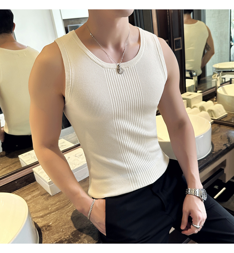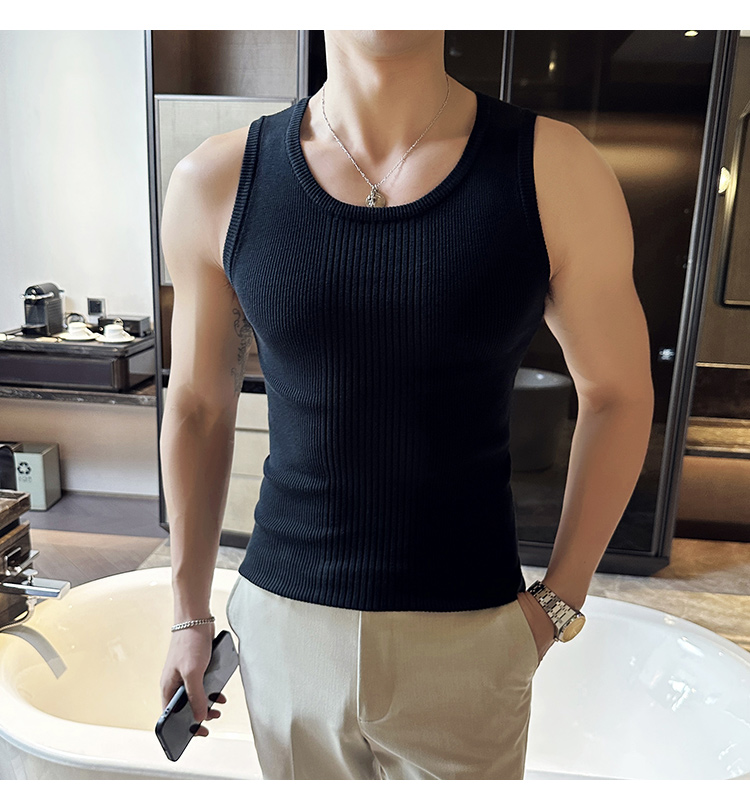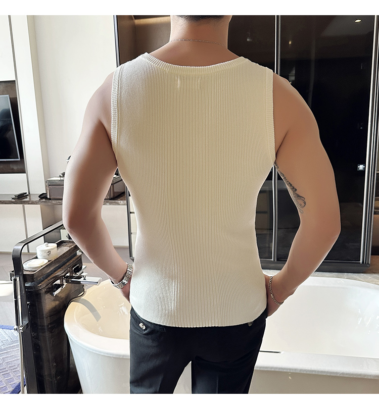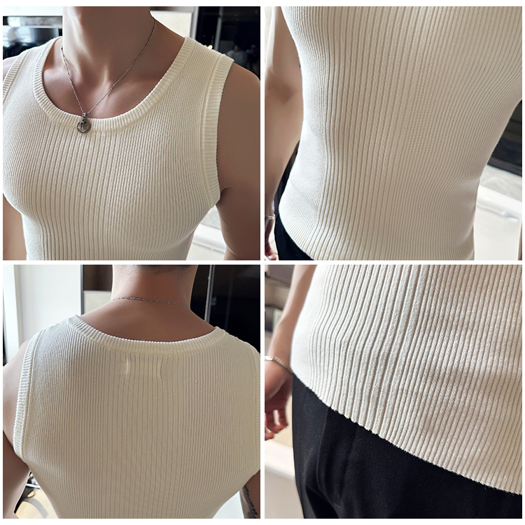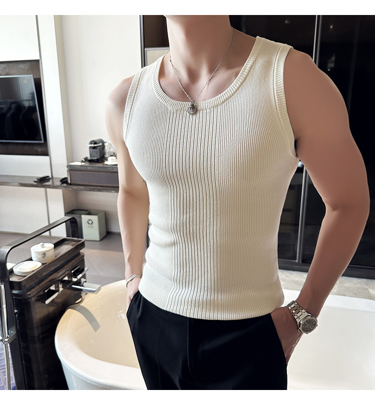 針織條紋背心男士夏季新款運動健身潮流坎肩緊身打底無袖t恤男款