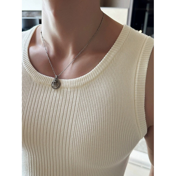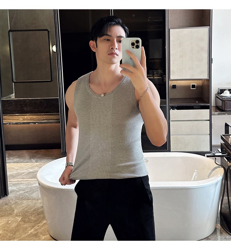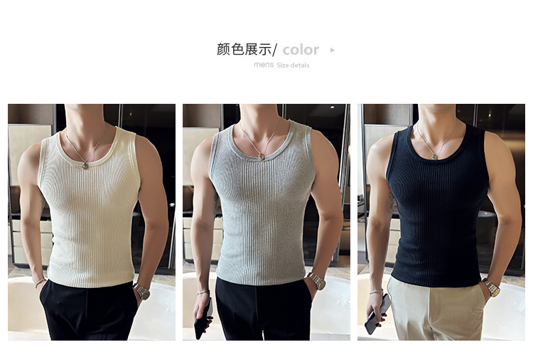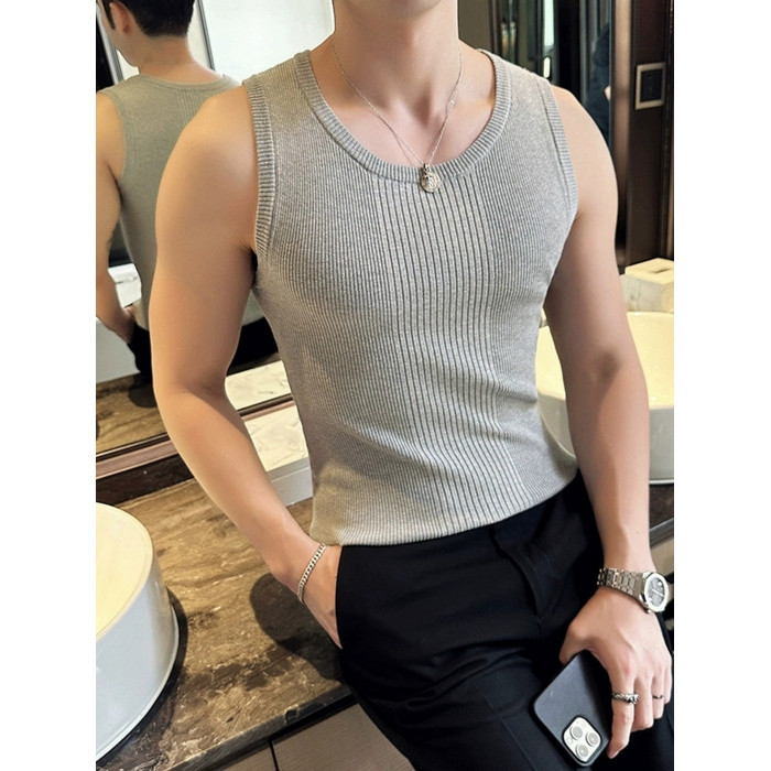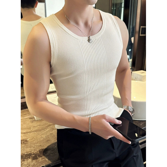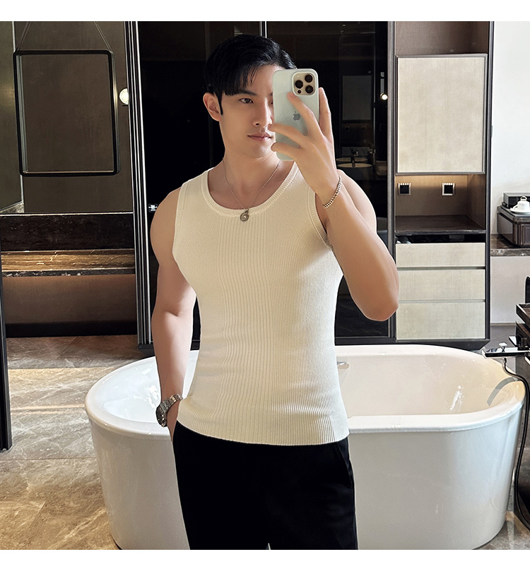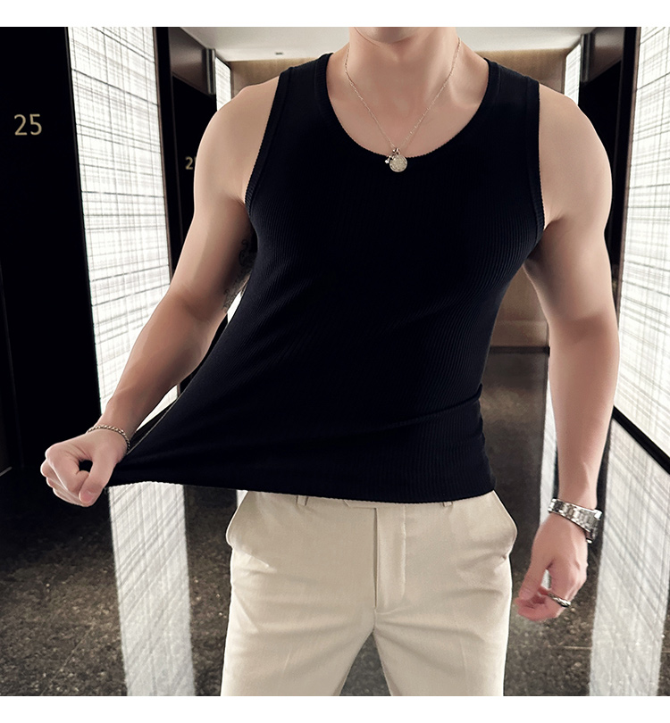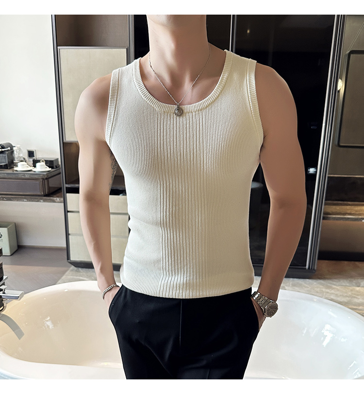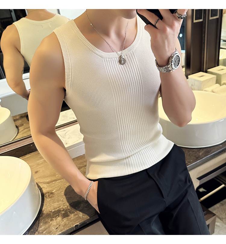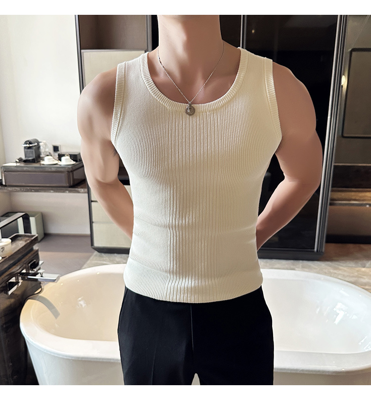 針織條紋背心男士夏季新款運動健身潮流坎肩緊身打底無袖t恤男款