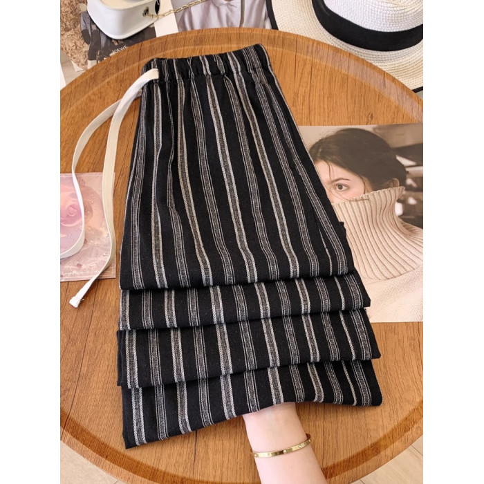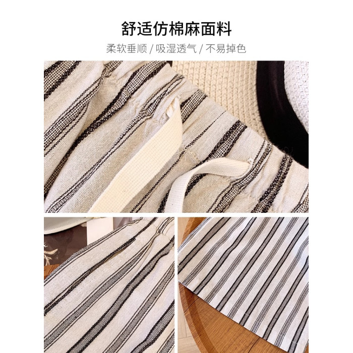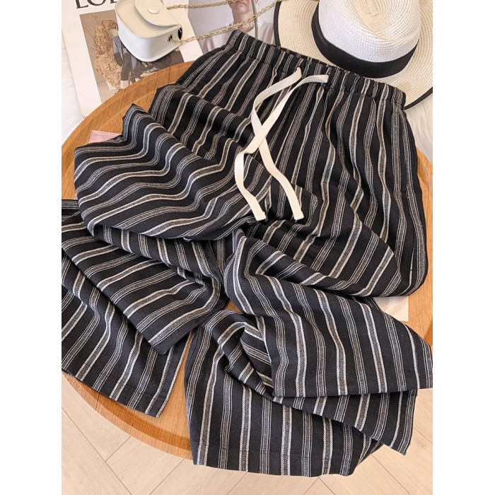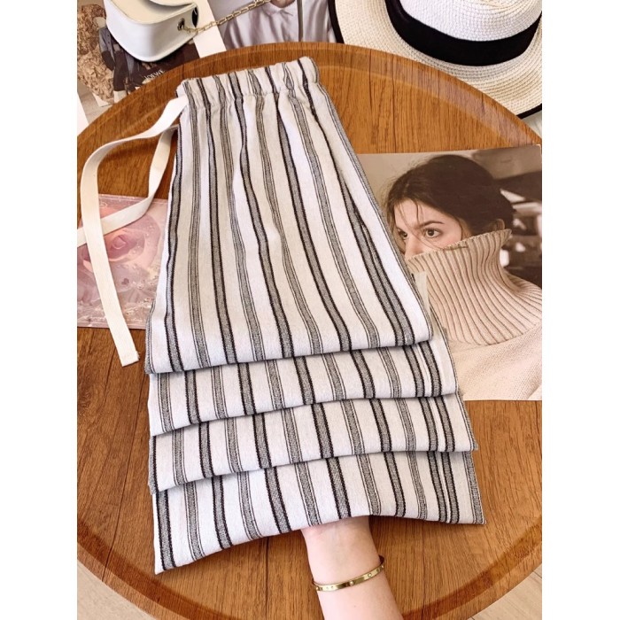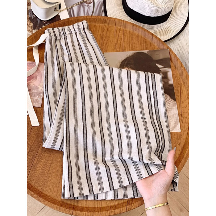 高級棉麻直筒褲夏季薄款2025新款條紋拖地褲防曬褲天絲亞麻濶腿褲
