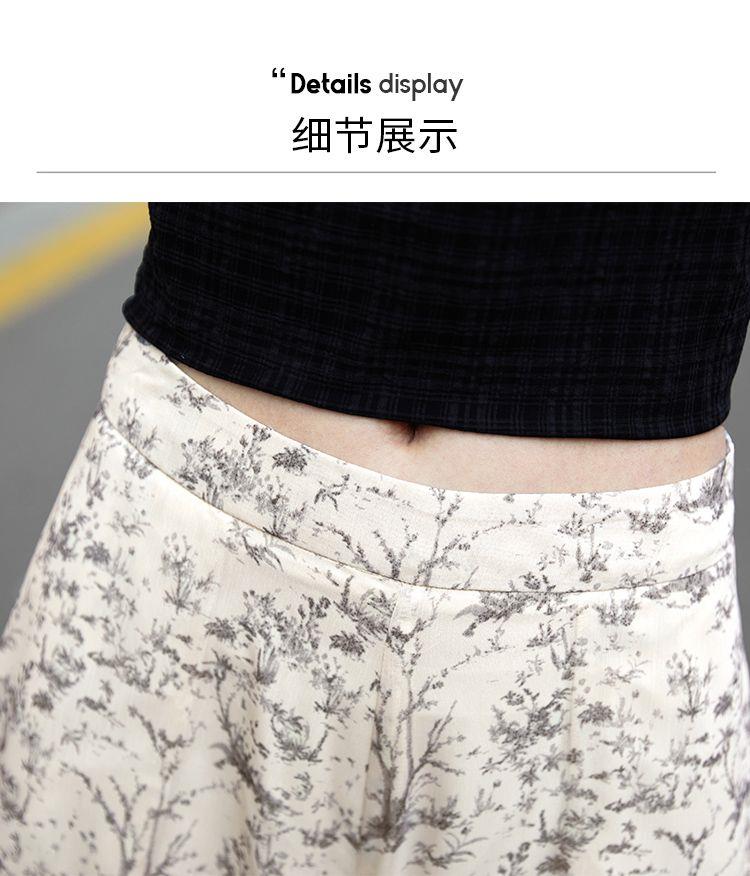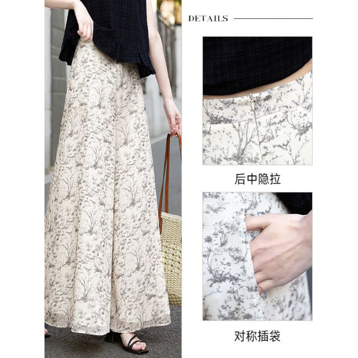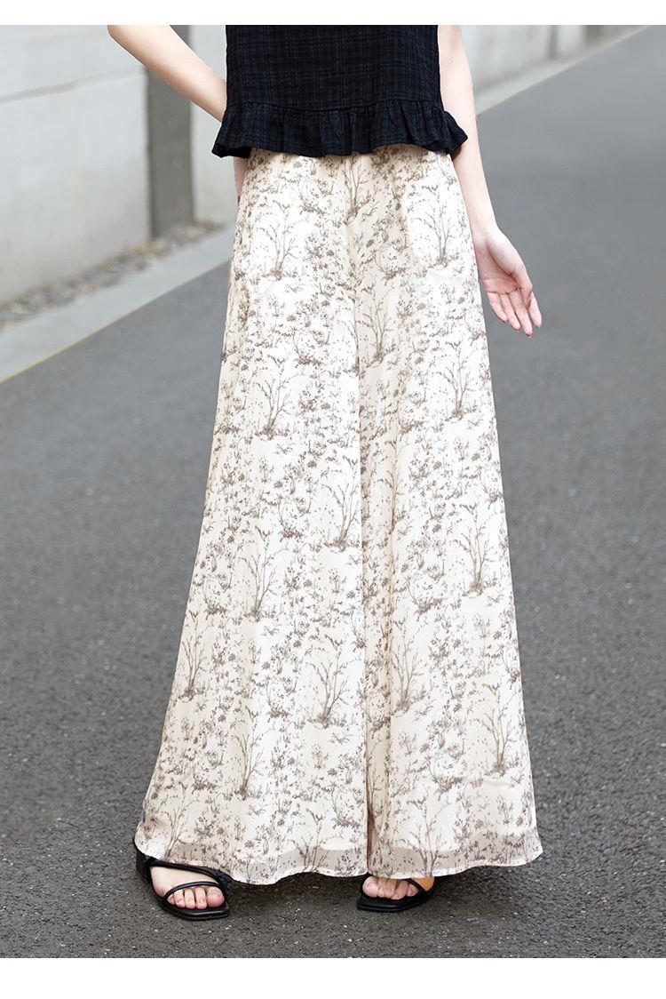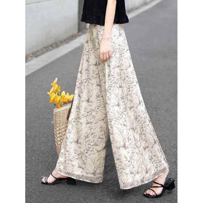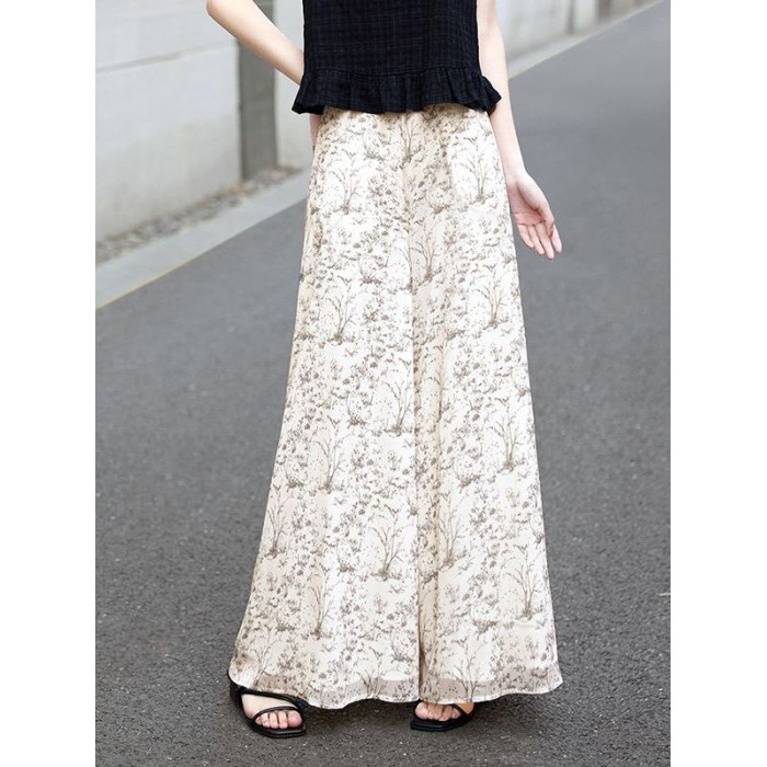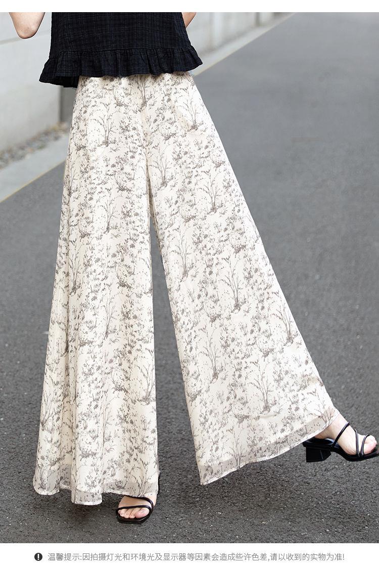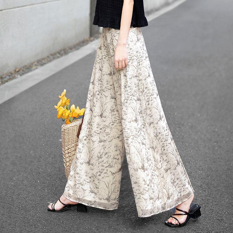 日系輕奢桑蠶絲高腰濶腿褲夏季新款時尚寬松碎花垂感長款甩腿裙褲