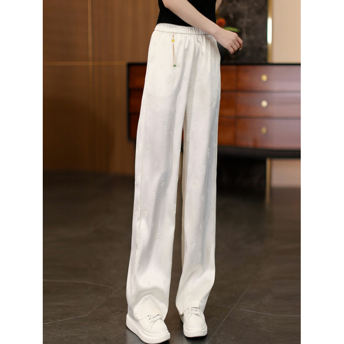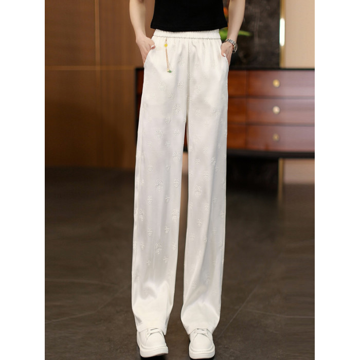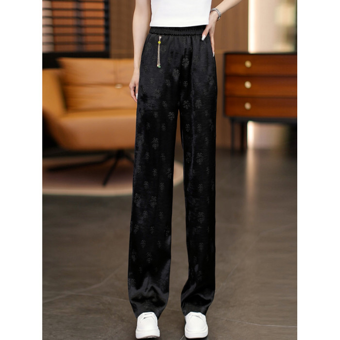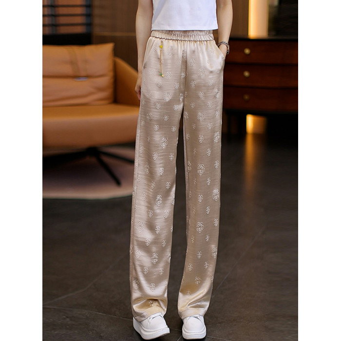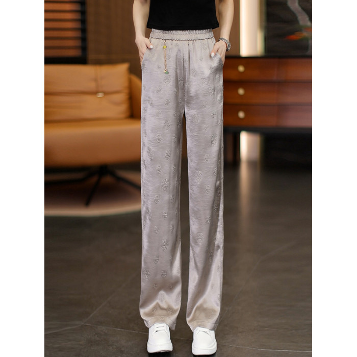 颯擼/夏季新中式緞面氣質濶腿褲女款垂墜感直筒褲寬松百搭休閒褲