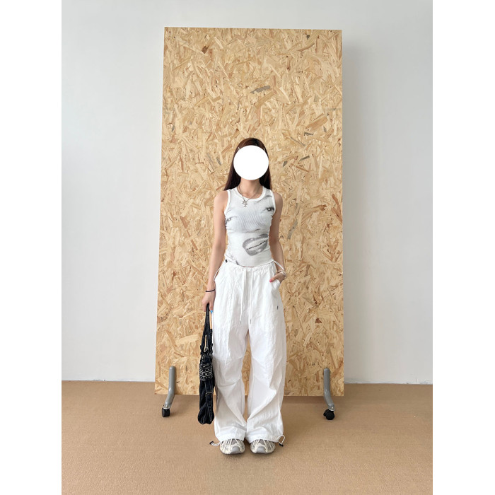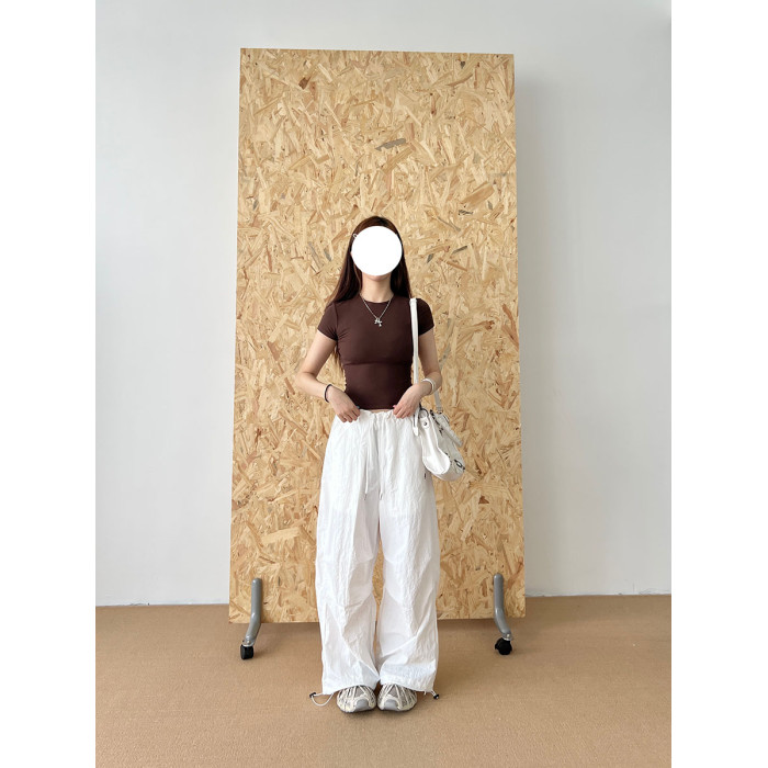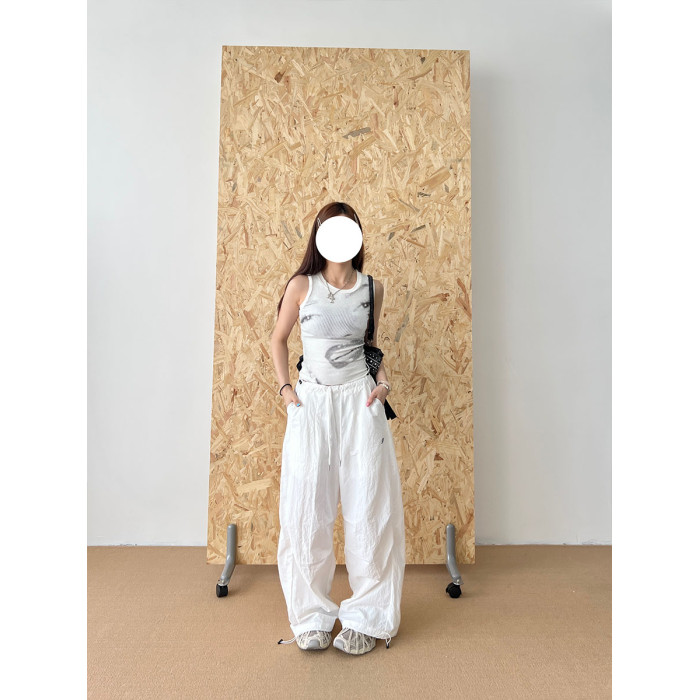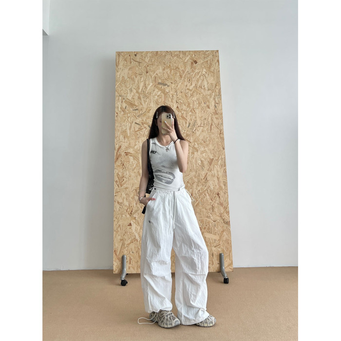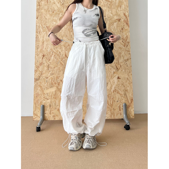 美式高腰降落繖工裝褲子女抽繩濶腿褲子肌理感設計休閒長褲ins潮