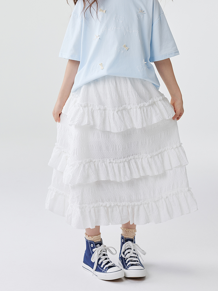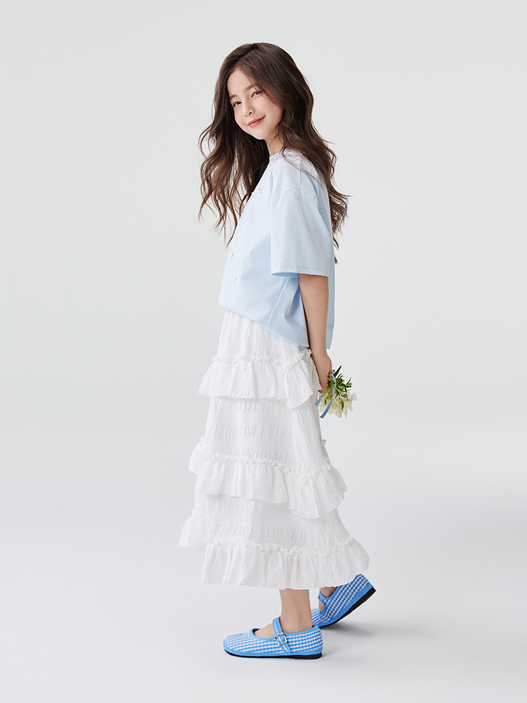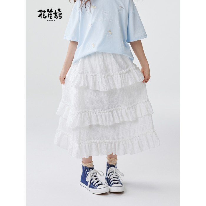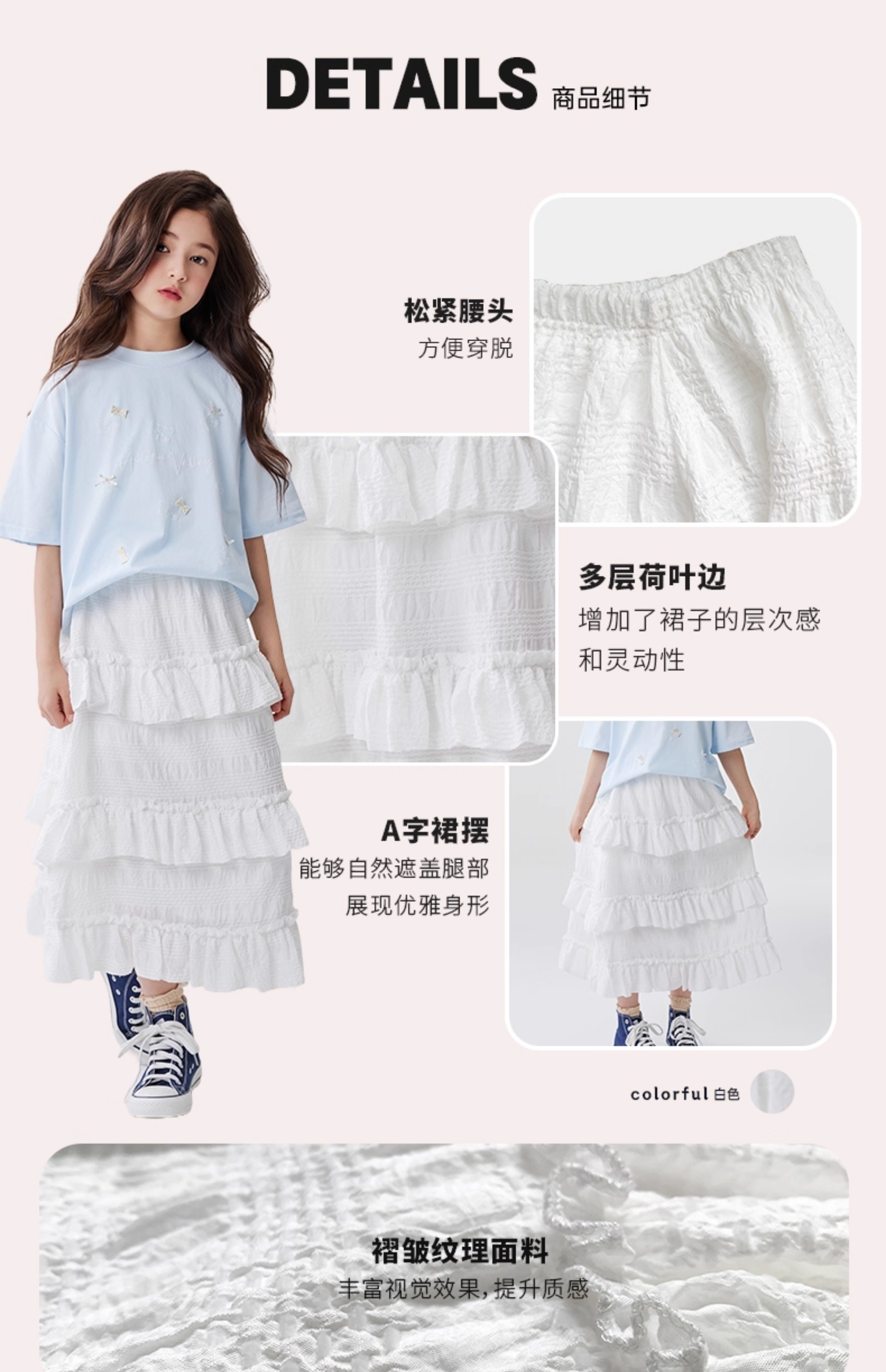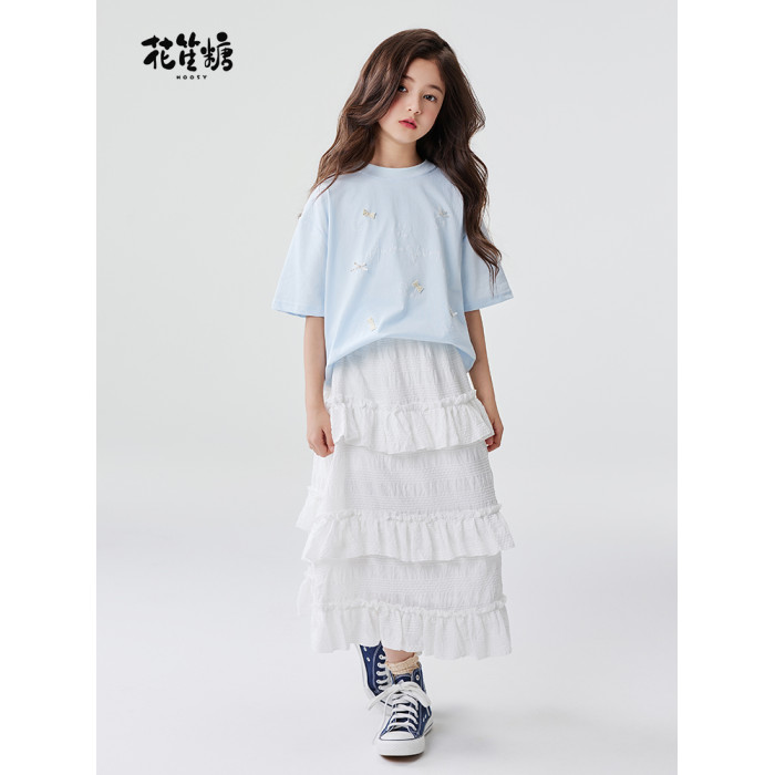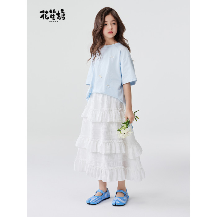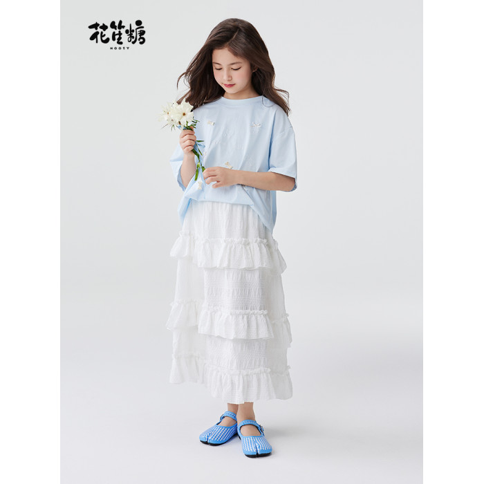 花笙糖女童夏季半身裙小女孩白色長裙大童時尚百搭荷葉邊裙子童裝