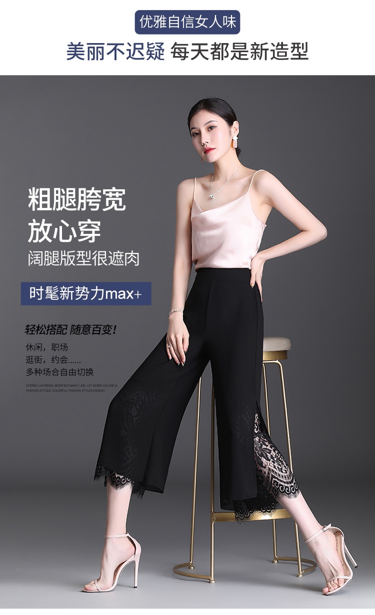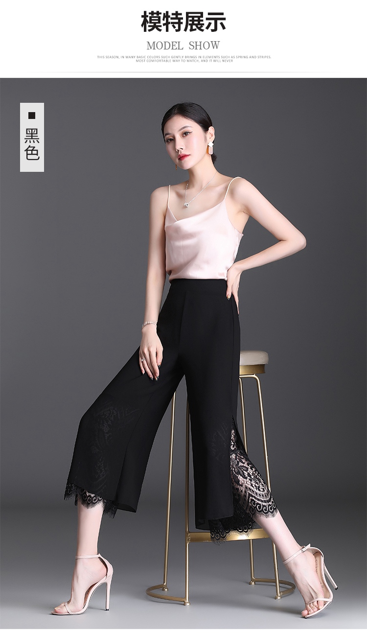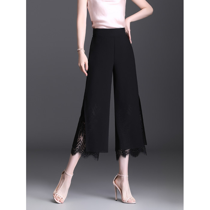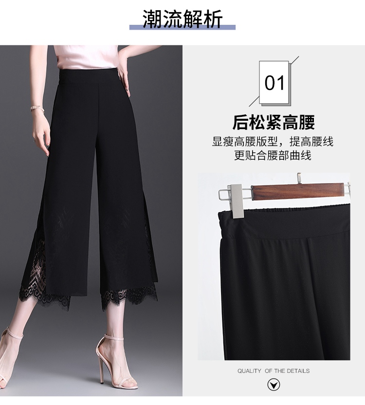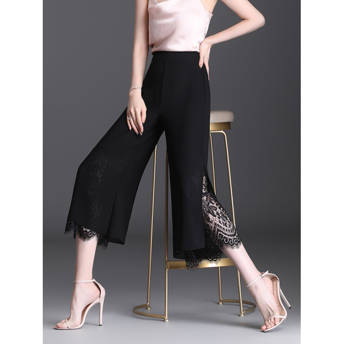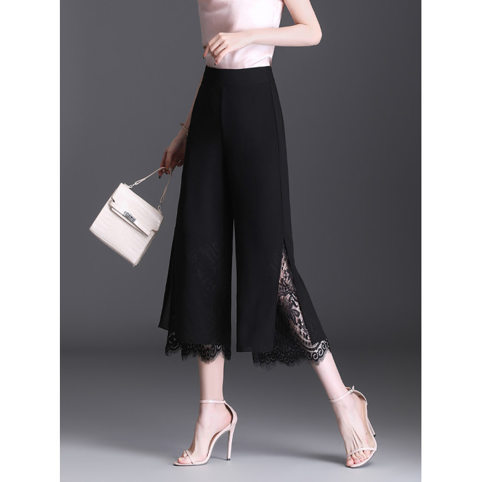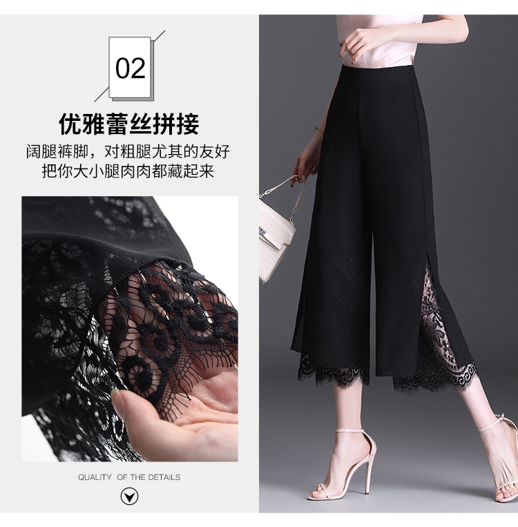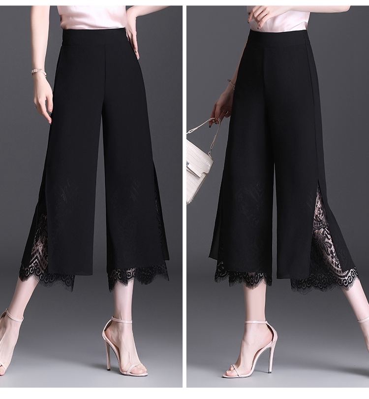 隅見丨八分褲女小個子夏薄款開叉蕾絲高腰寬松顯瘦七分雪紡濶腿褲