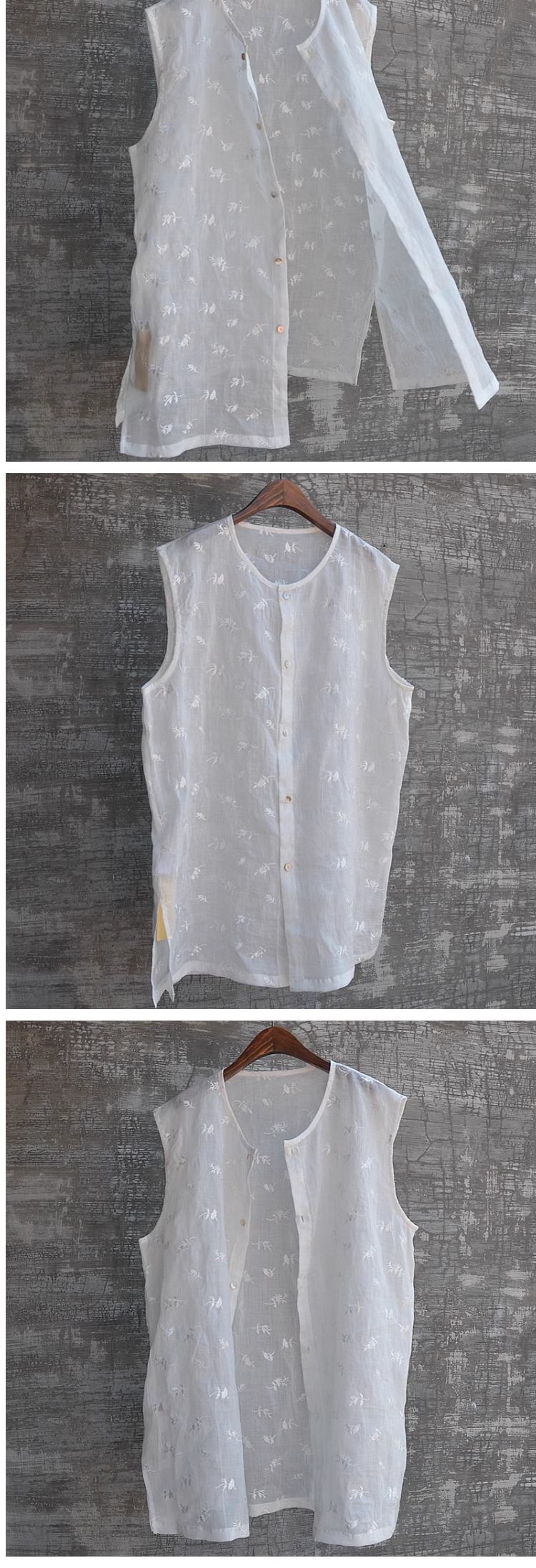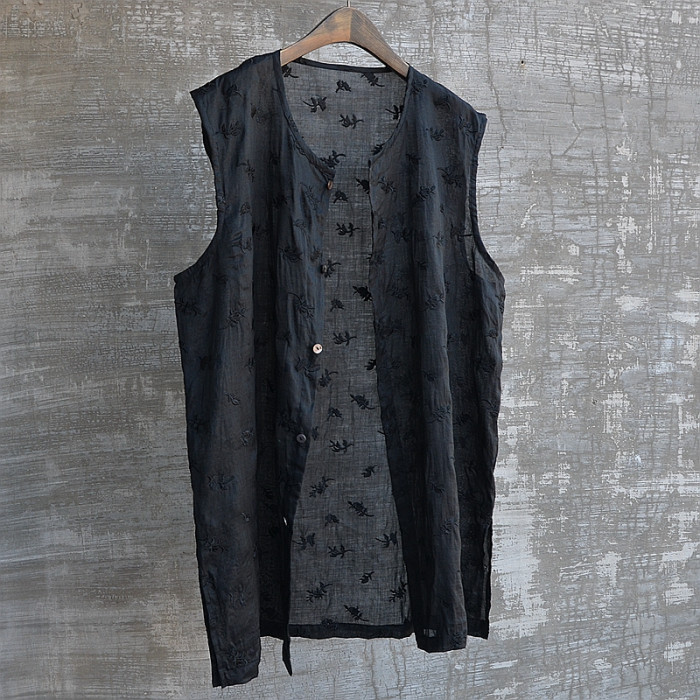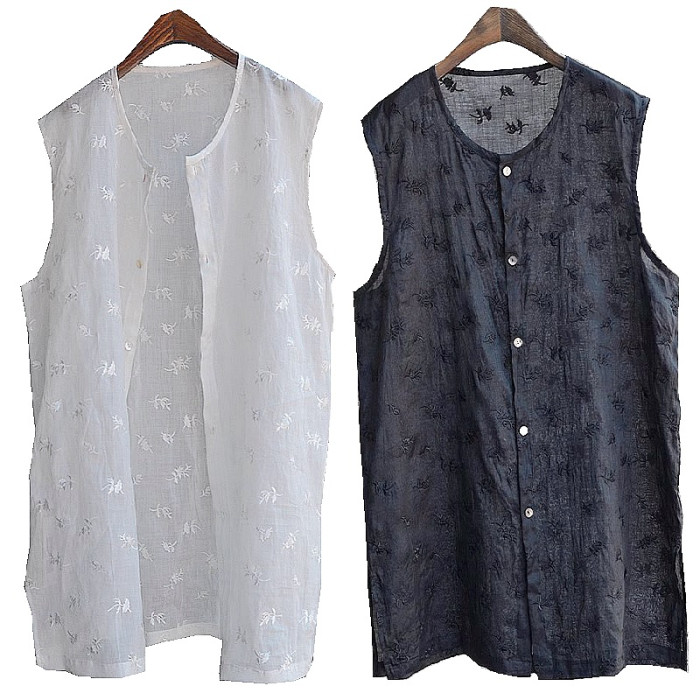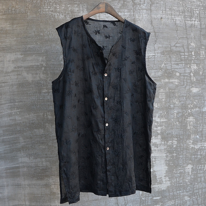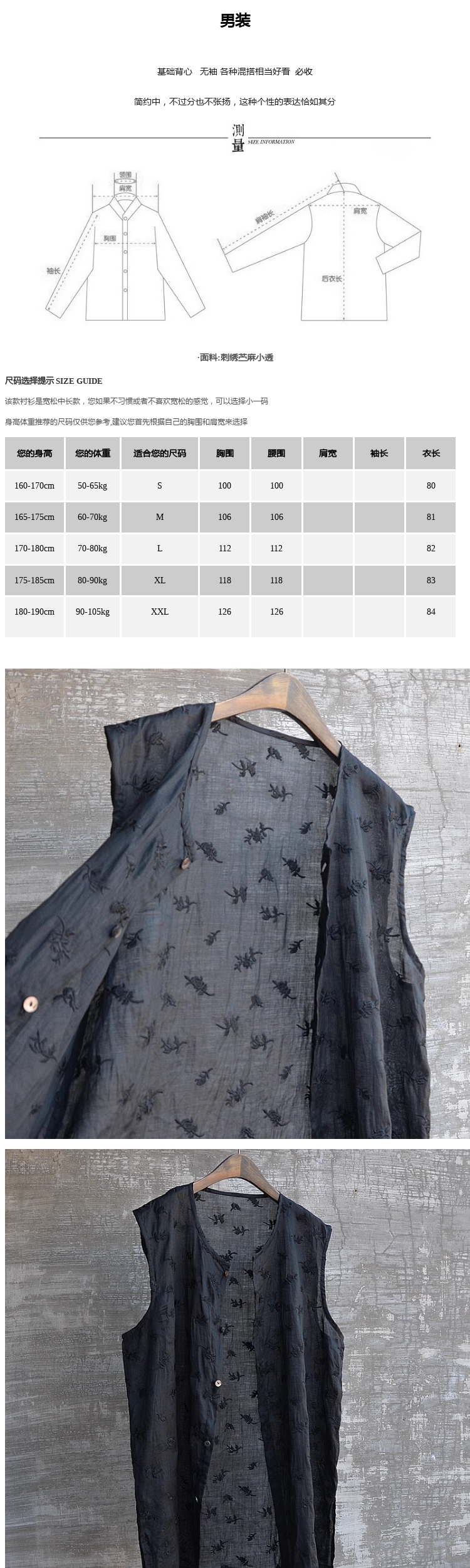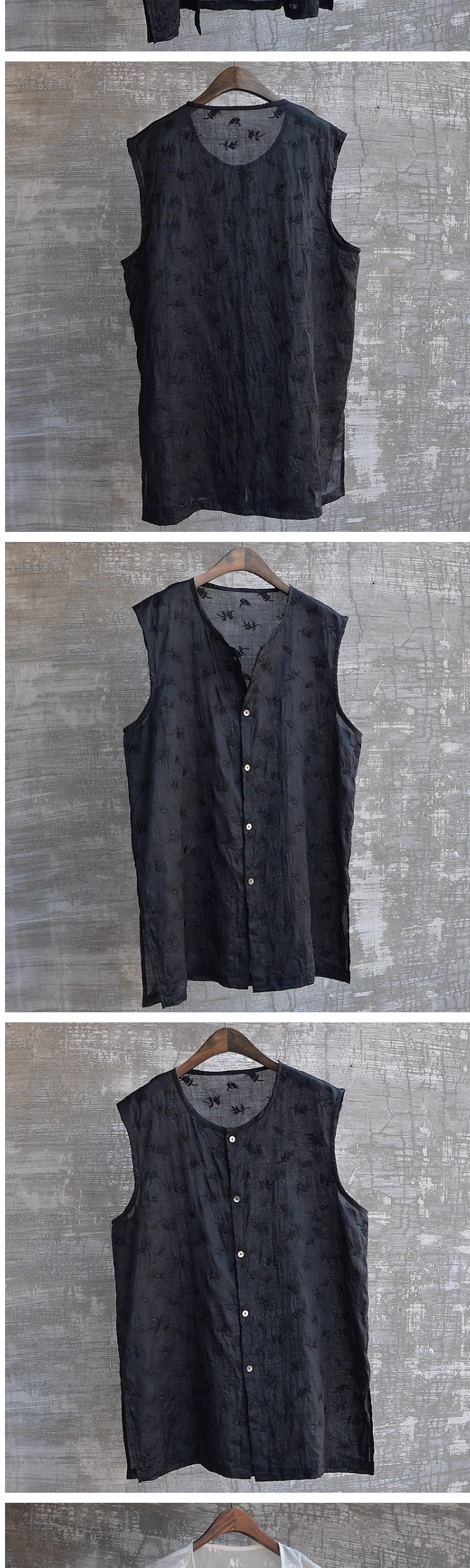 夏季男士背心t恤汗衫無袖寬松風刺綉苧麻中長混搭時尚流行帥
