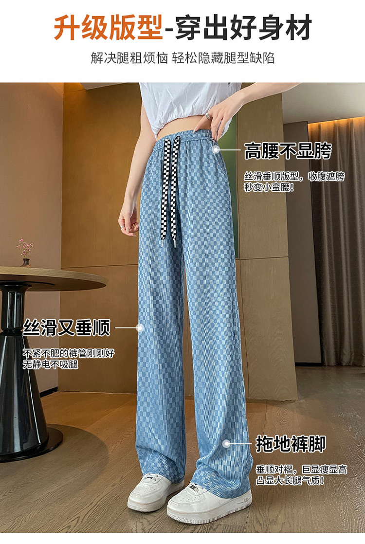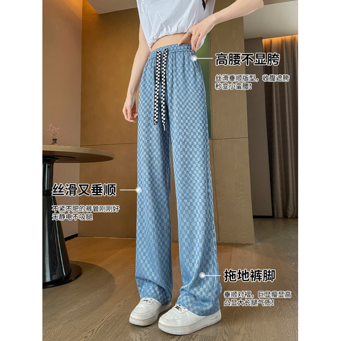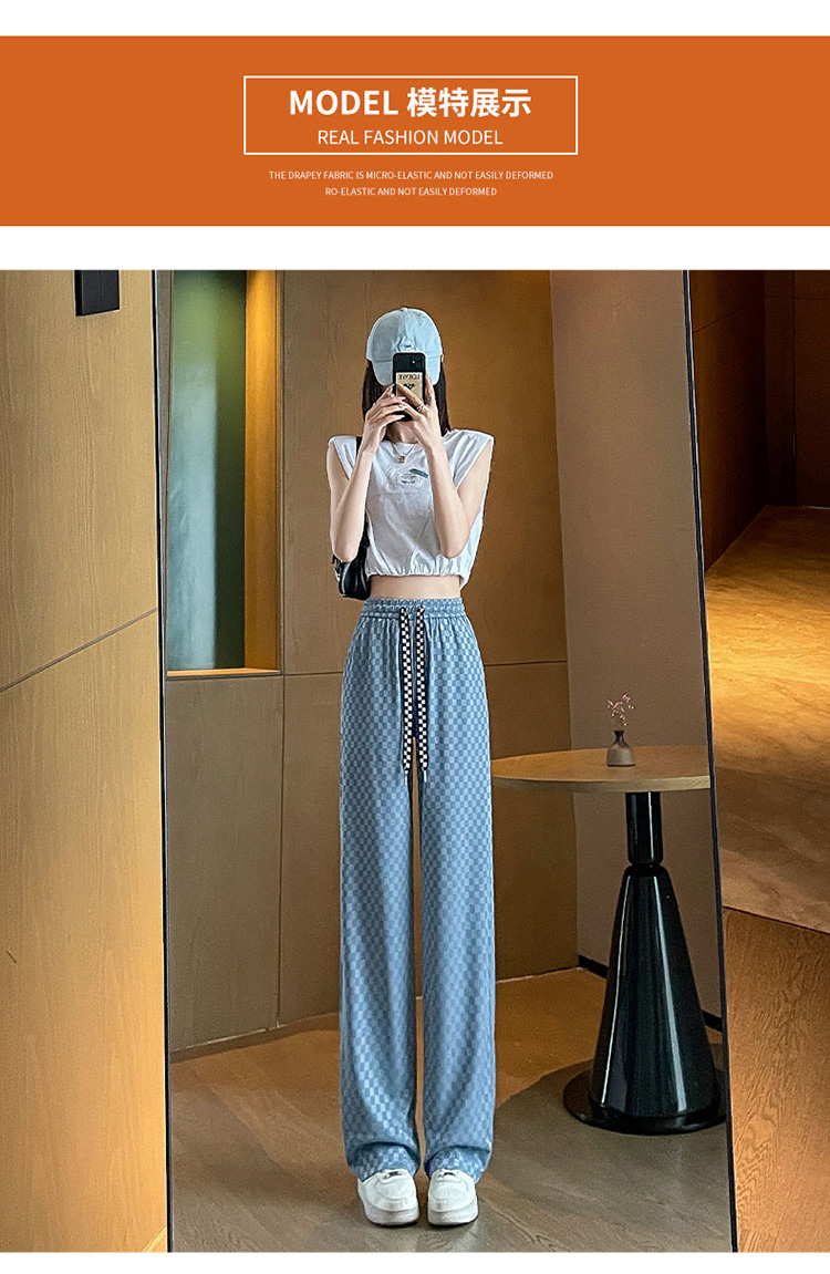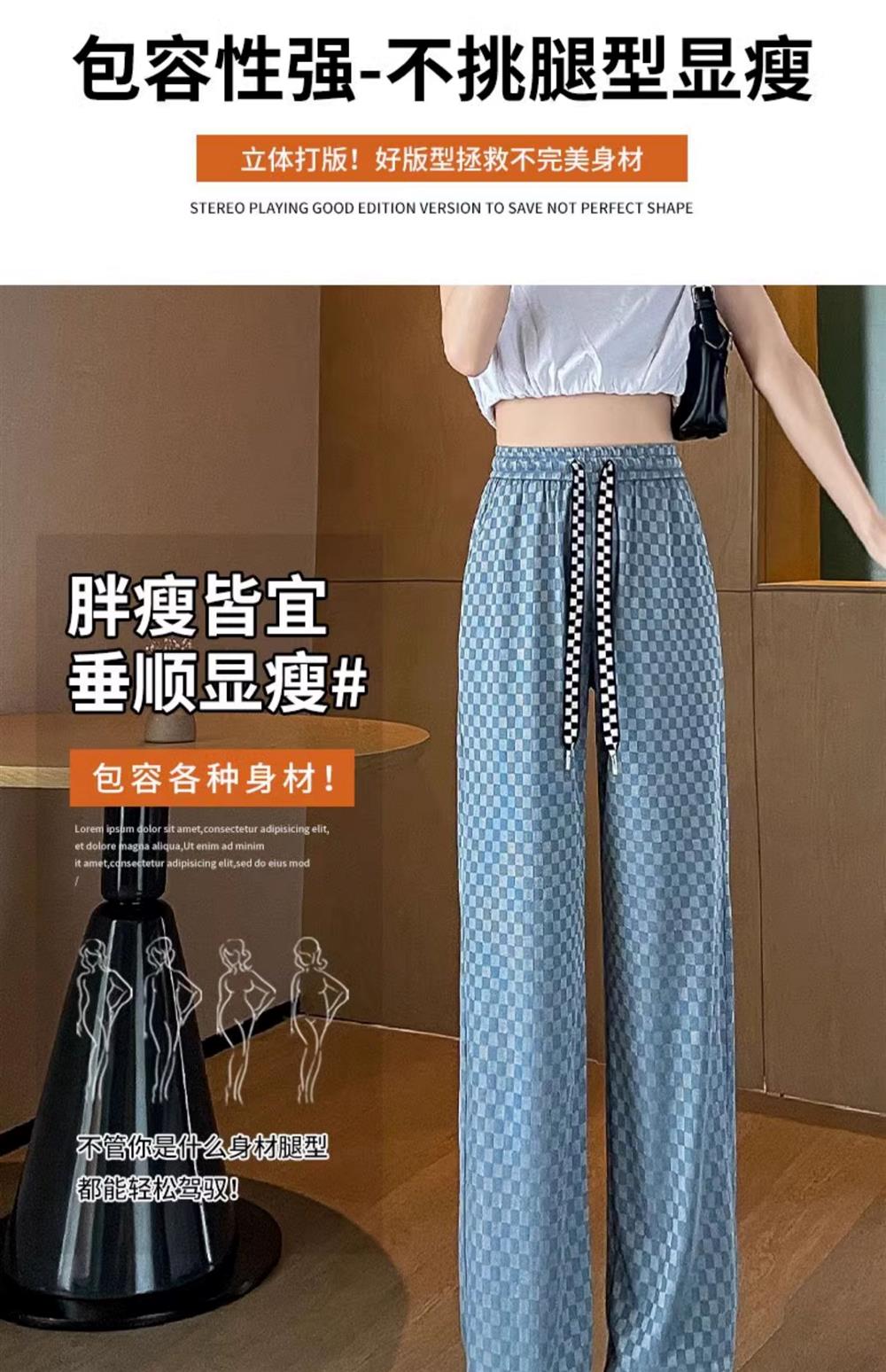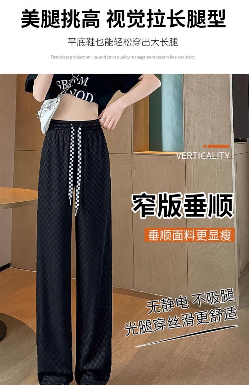 隅見丨冰絲濶腿褲女夏季薄款高腰直筒窄版休閒棋盤格黑色拖地長褲