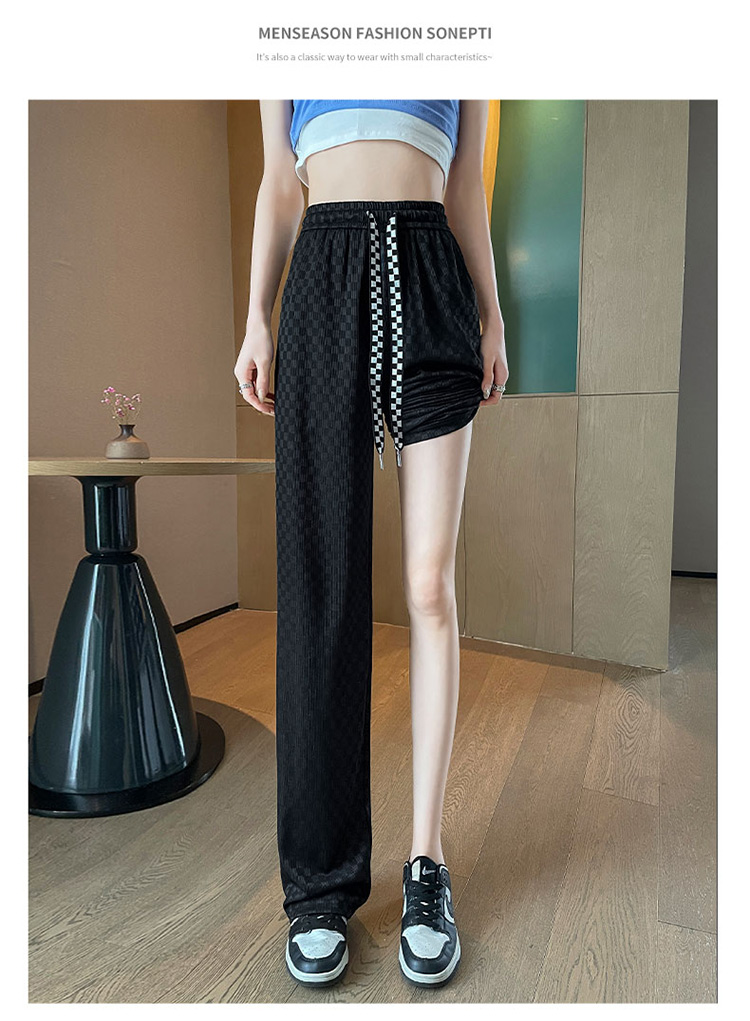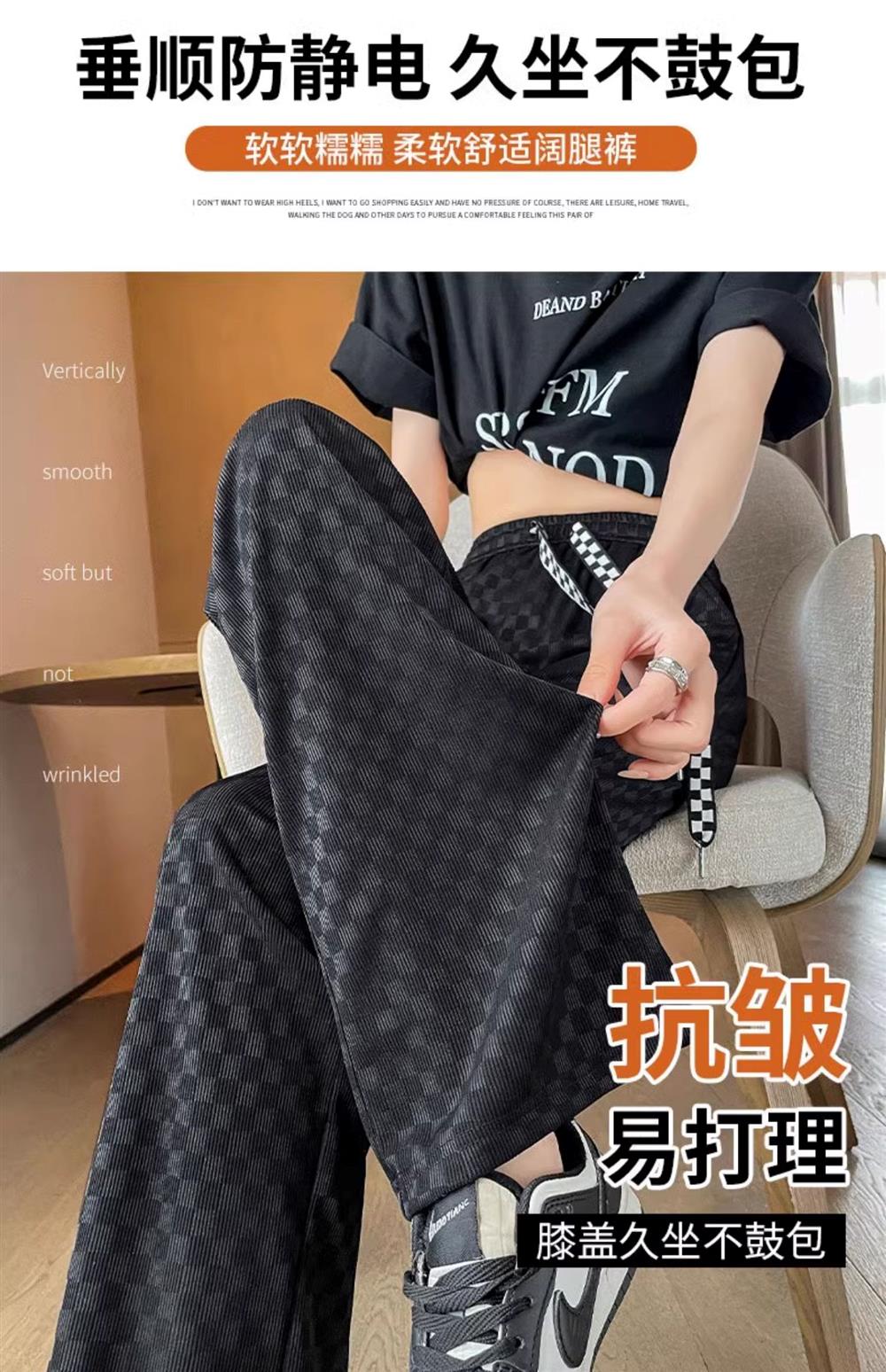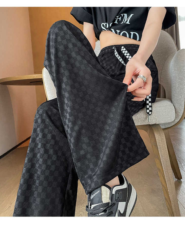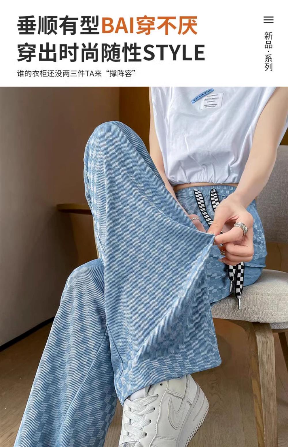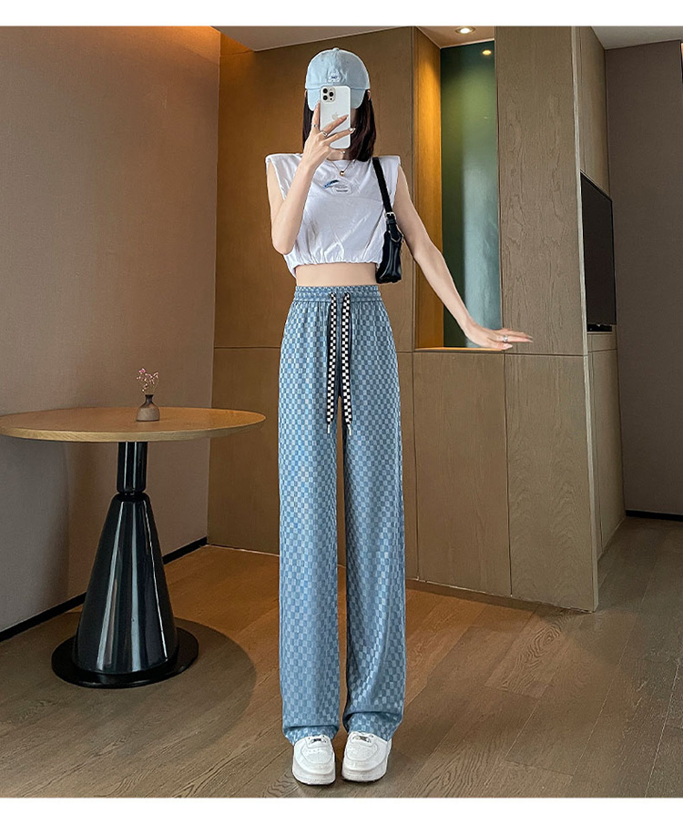 隅見丨冰絲濶腿褲女夏季薄款高腰直筒窄版休閒棋盤格黑色拖地長褲