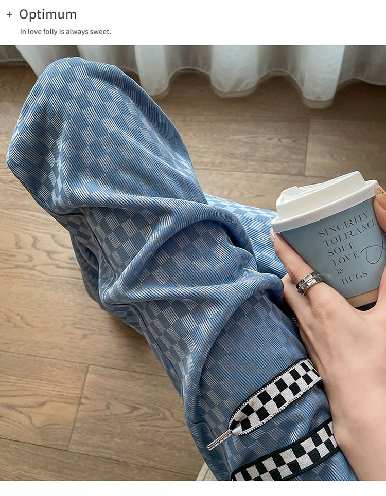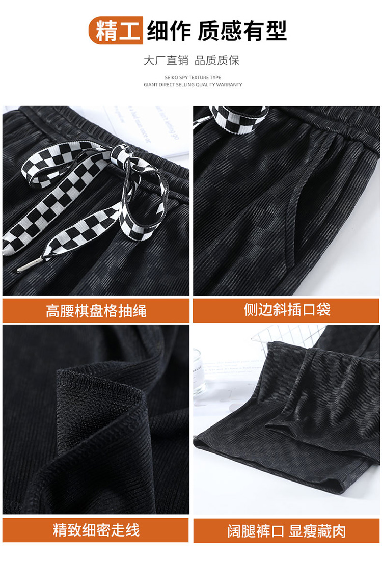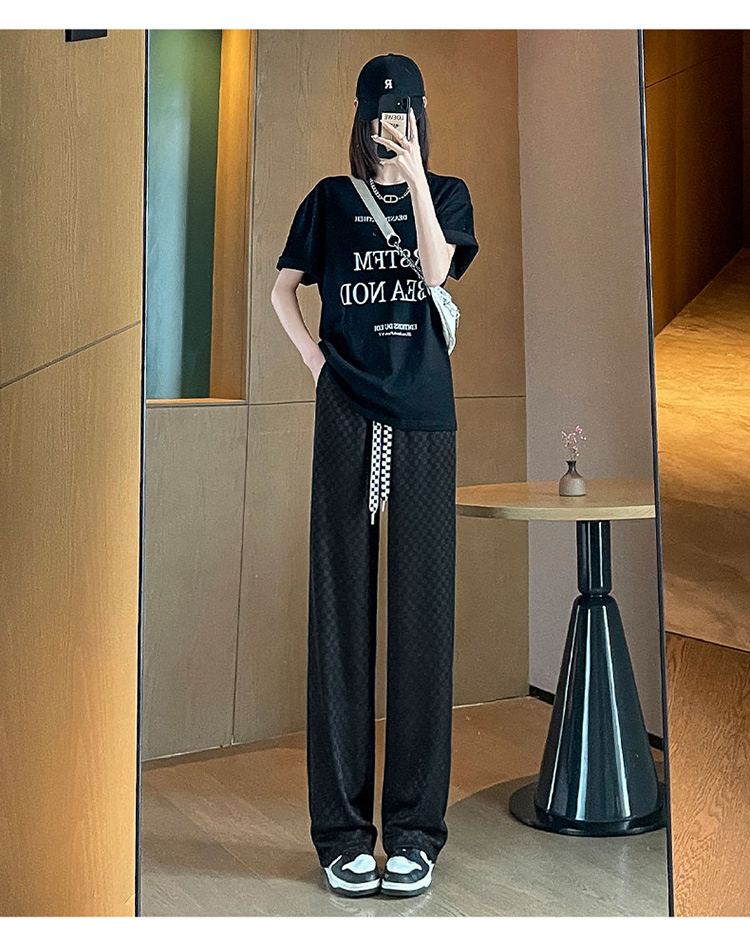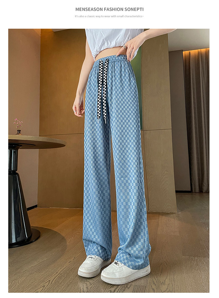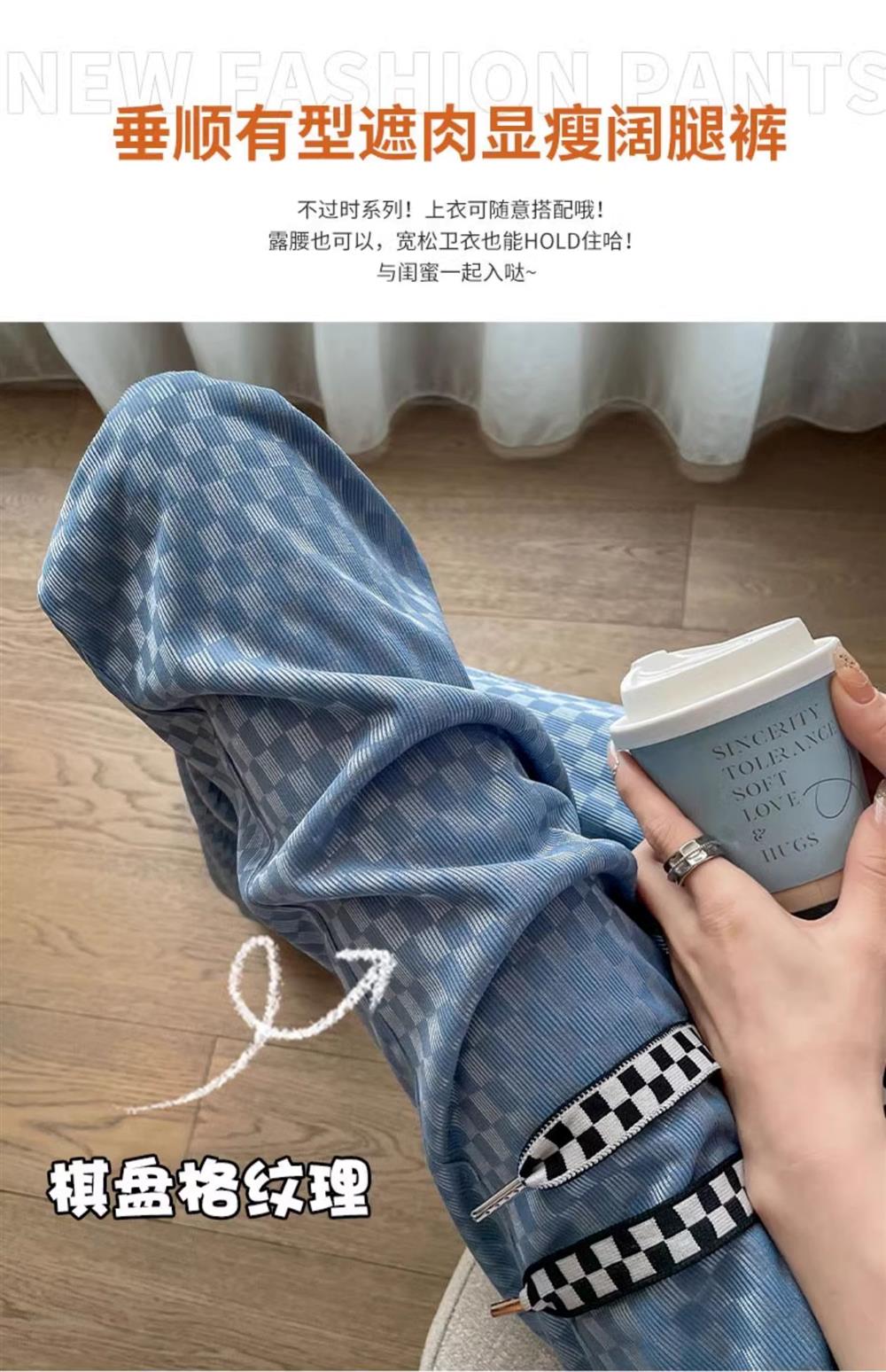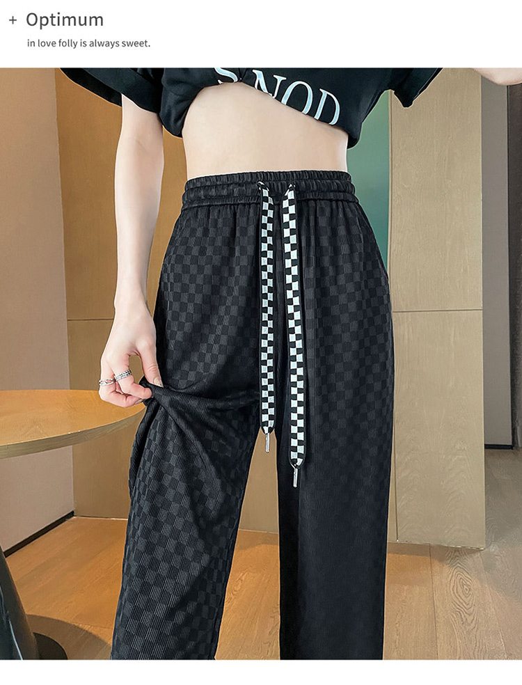 隅見丨冰絲濶腿褲女夏季薄款高腰直筒窄版休閒棋盤格黑色拖地長褲