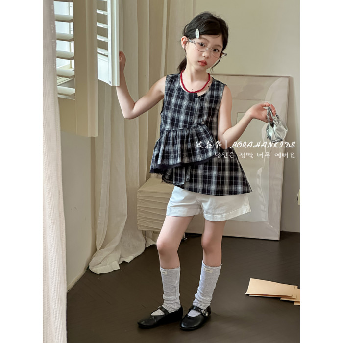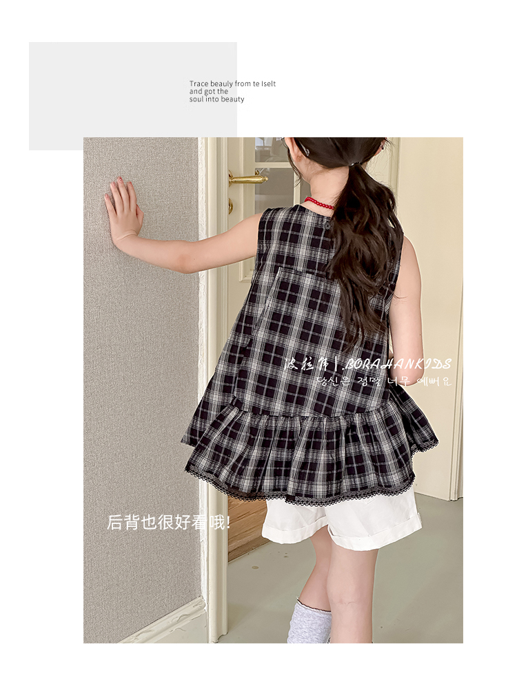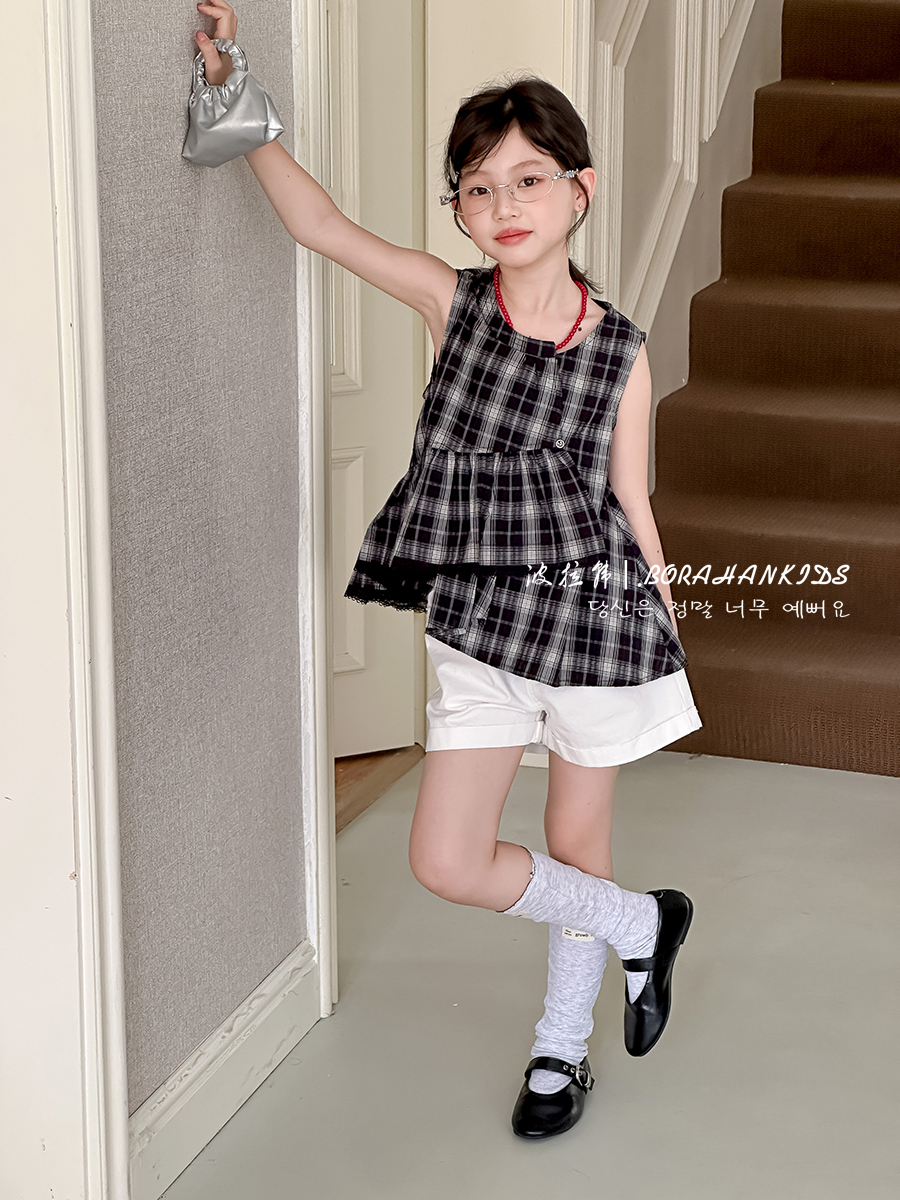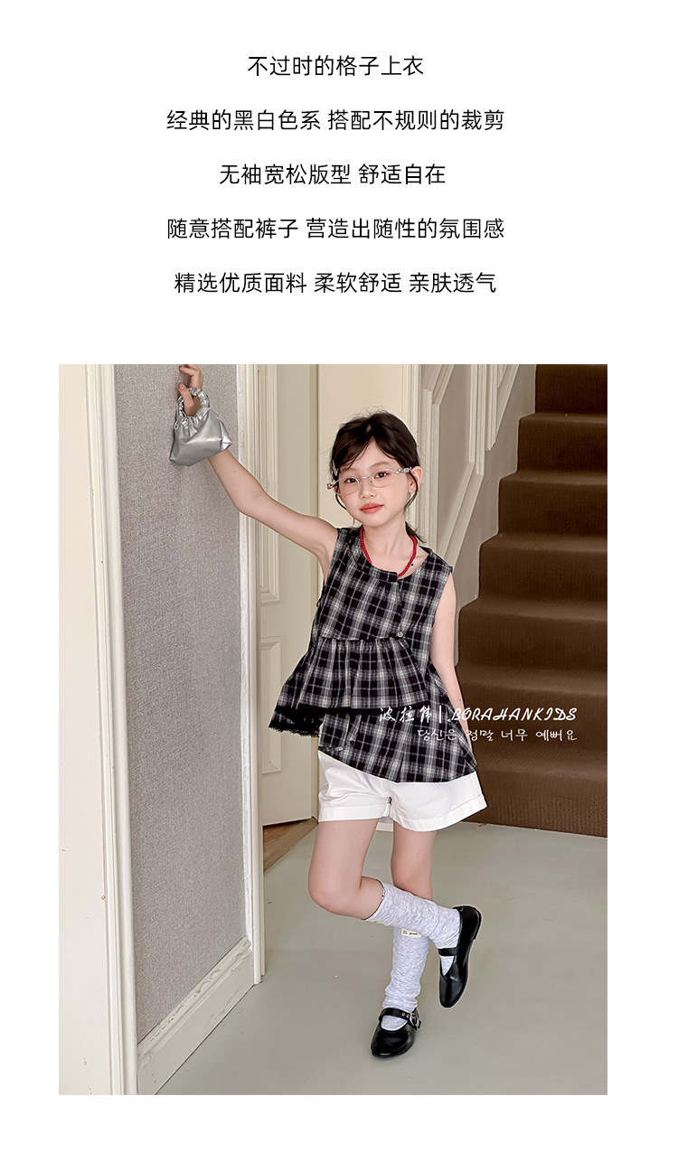 波拉韓女童無袖背心夏季兒童格子上衣2025新款小女孩襯衣韓系襯衫