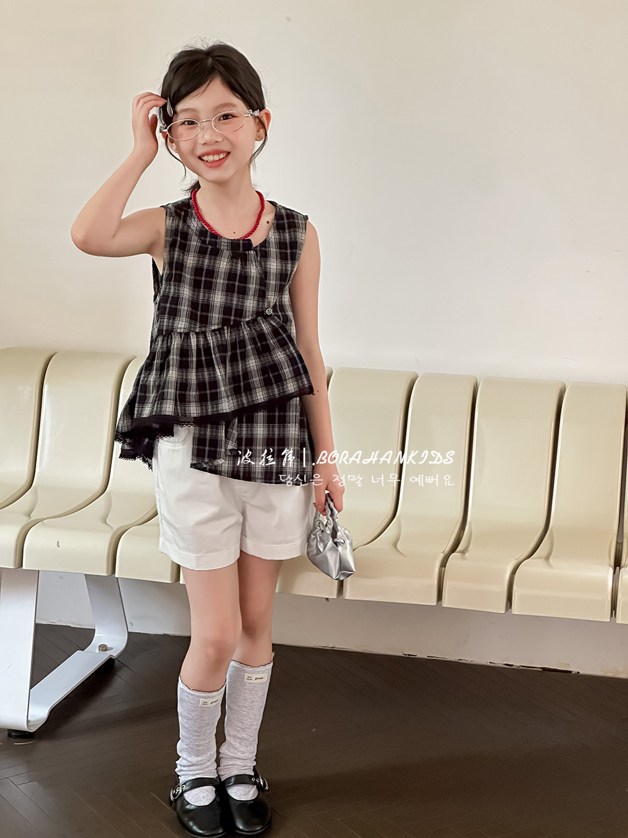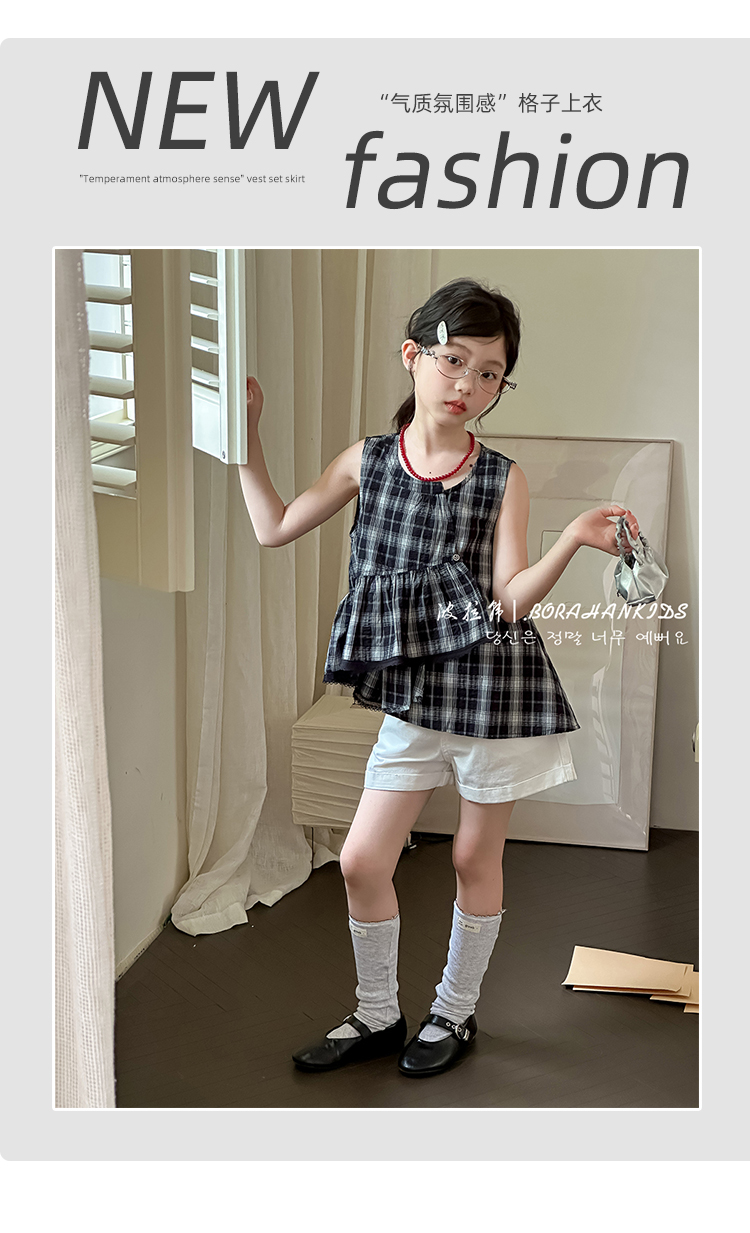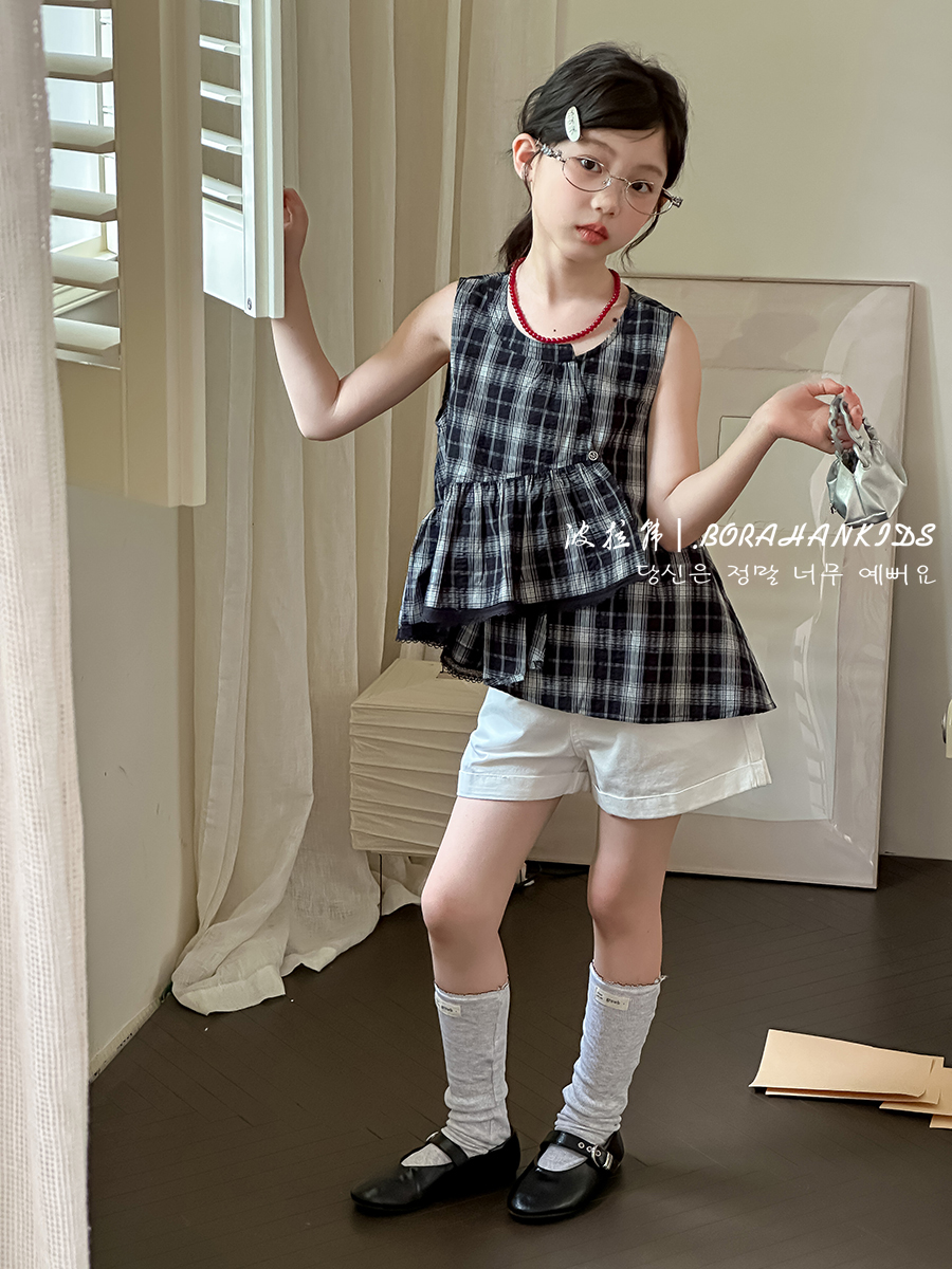 波拉韓女童無袖背心夏季兒童格子上衣2025新款小女孩襯衣韓系襯衫