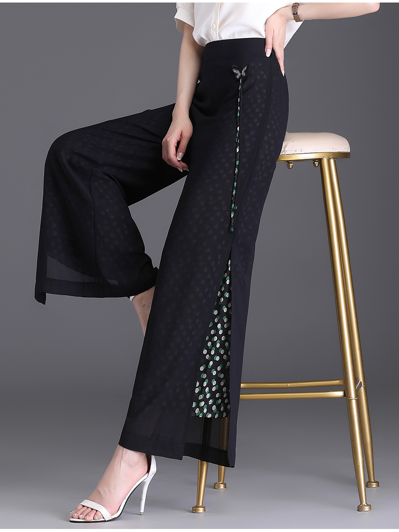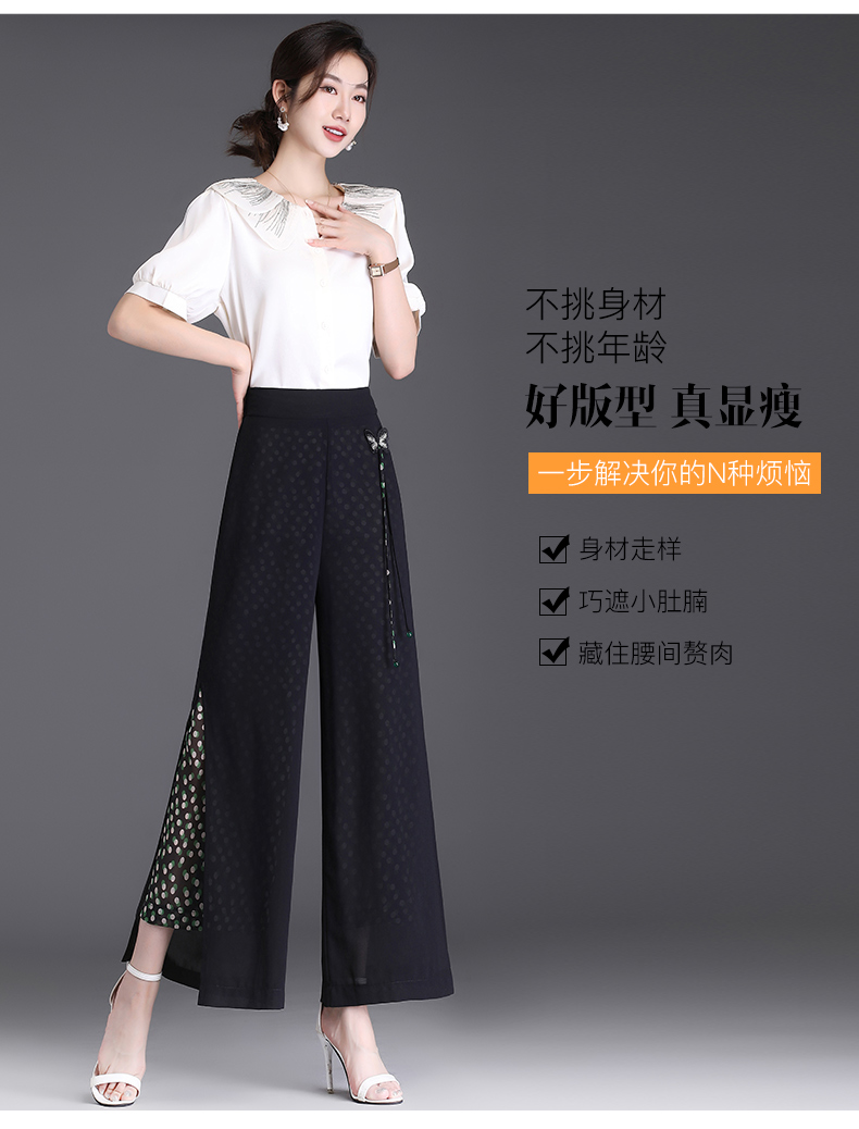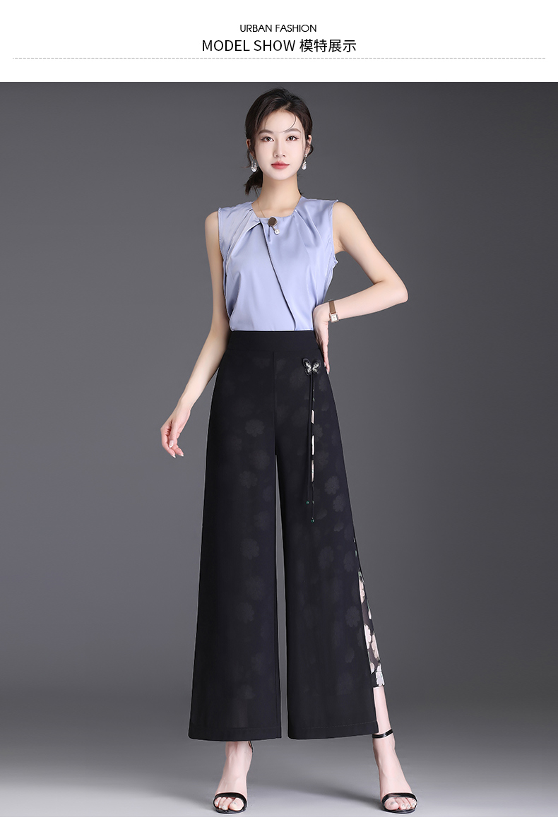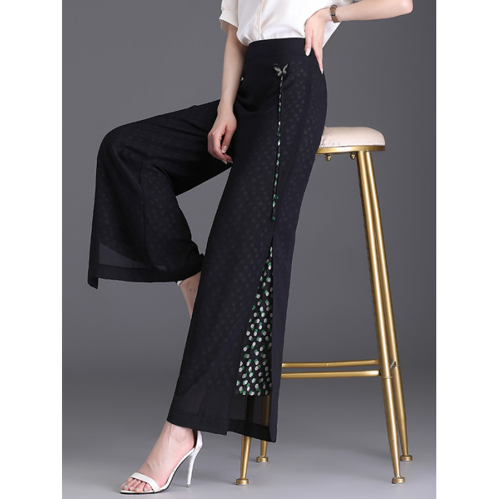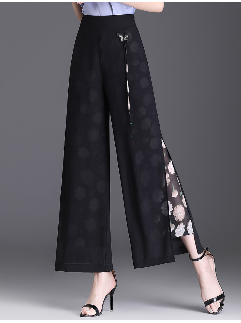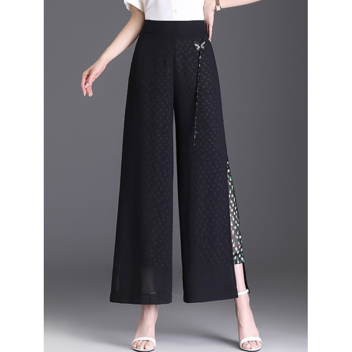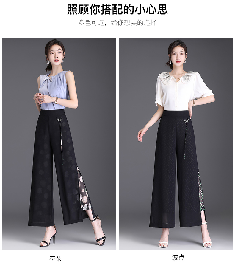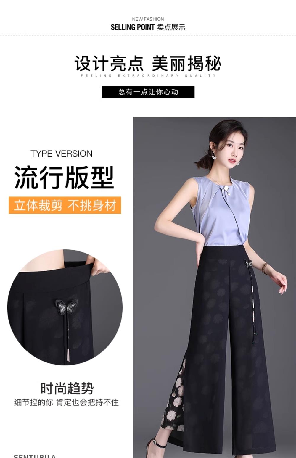 雪紡九分褲女夏季薄款裙褲國風印花直筒中老年媽媽褲子開叉濶腿褲