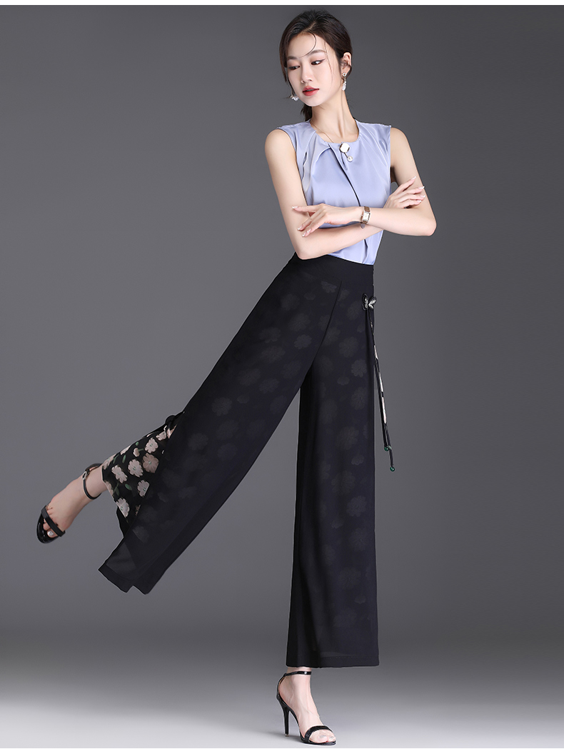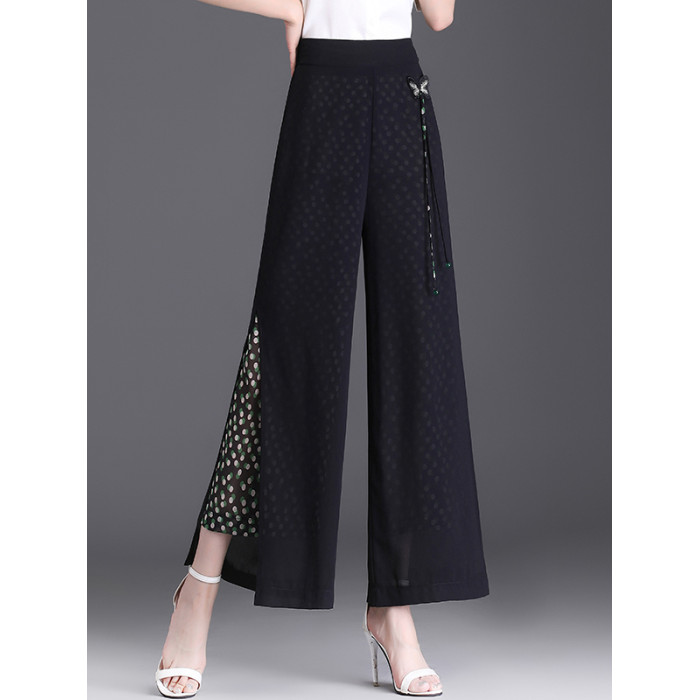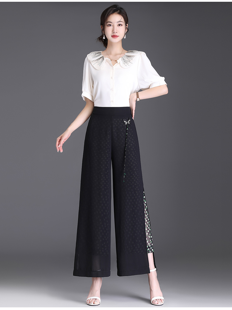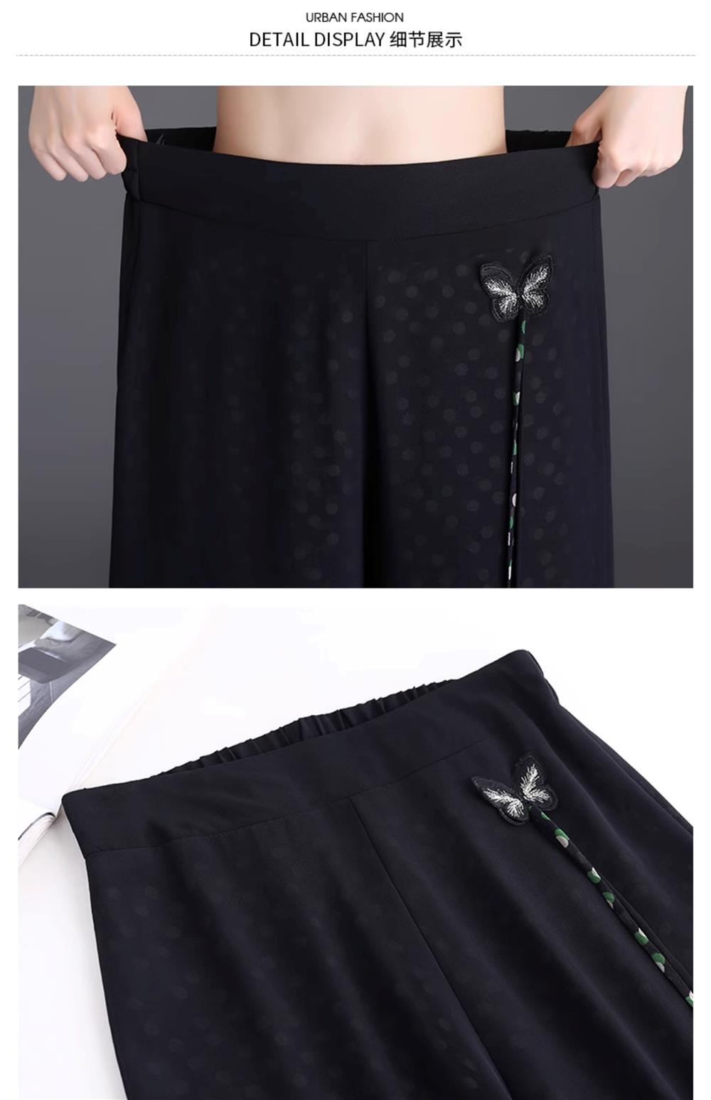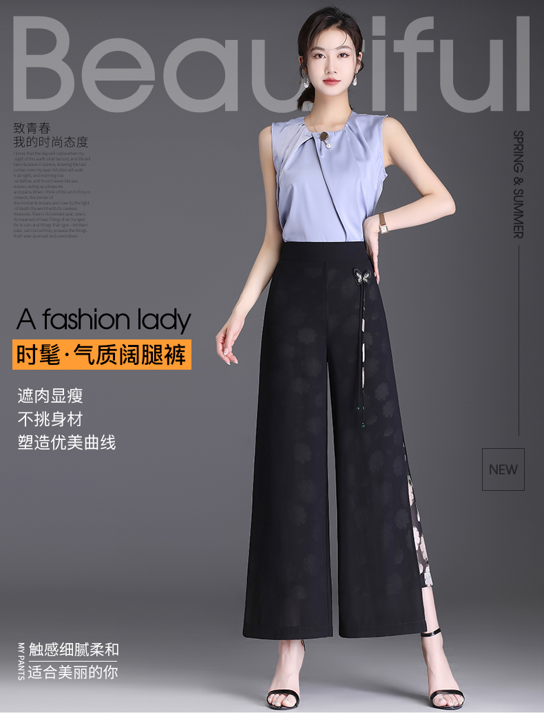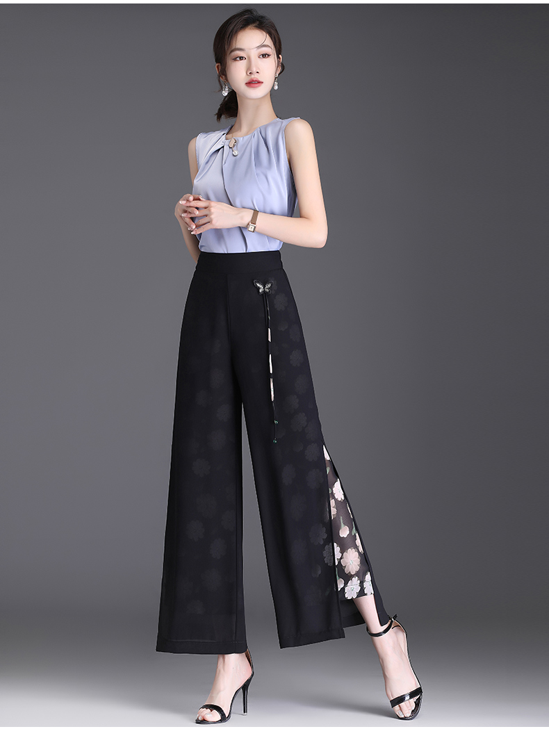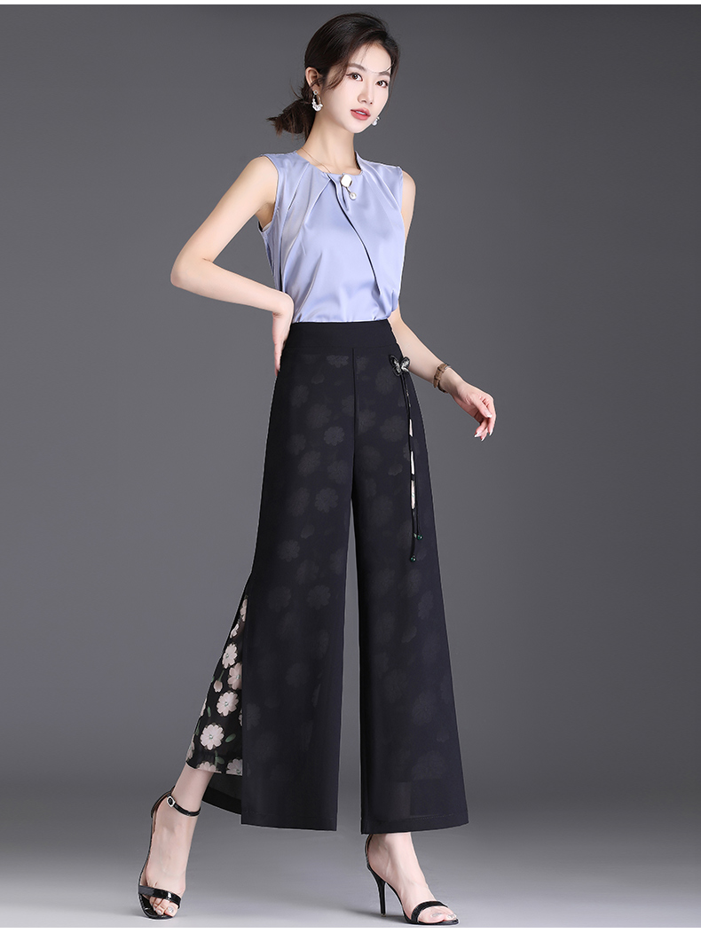 雪紡九分褲女夏季薄款裙褲國風印花直筒中老年媽媽褲子開叉濶腿褲