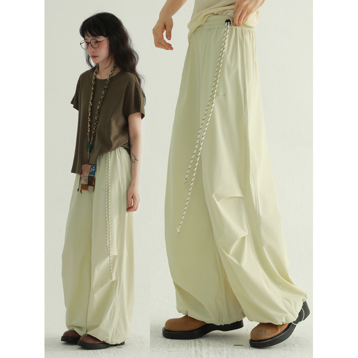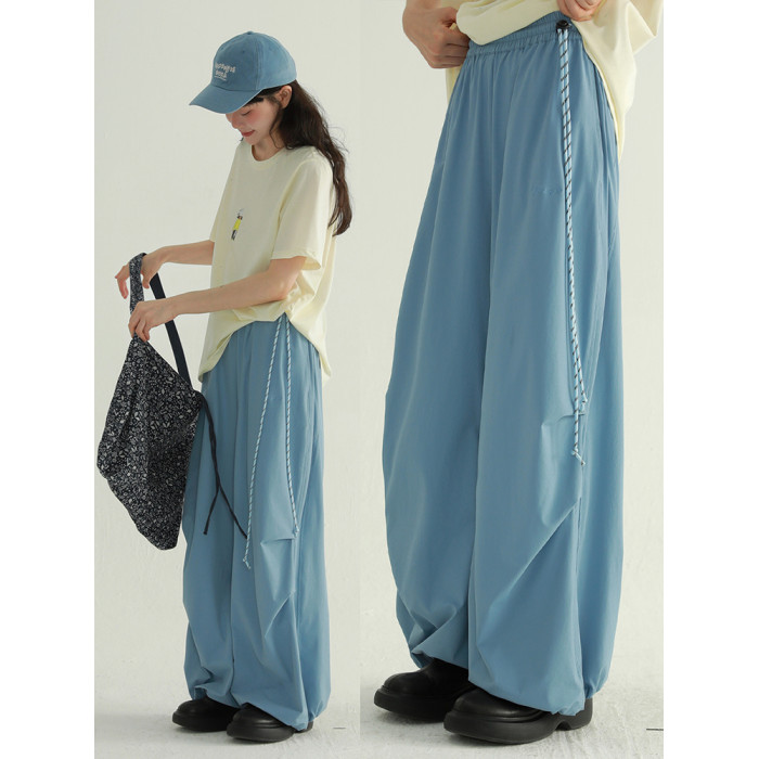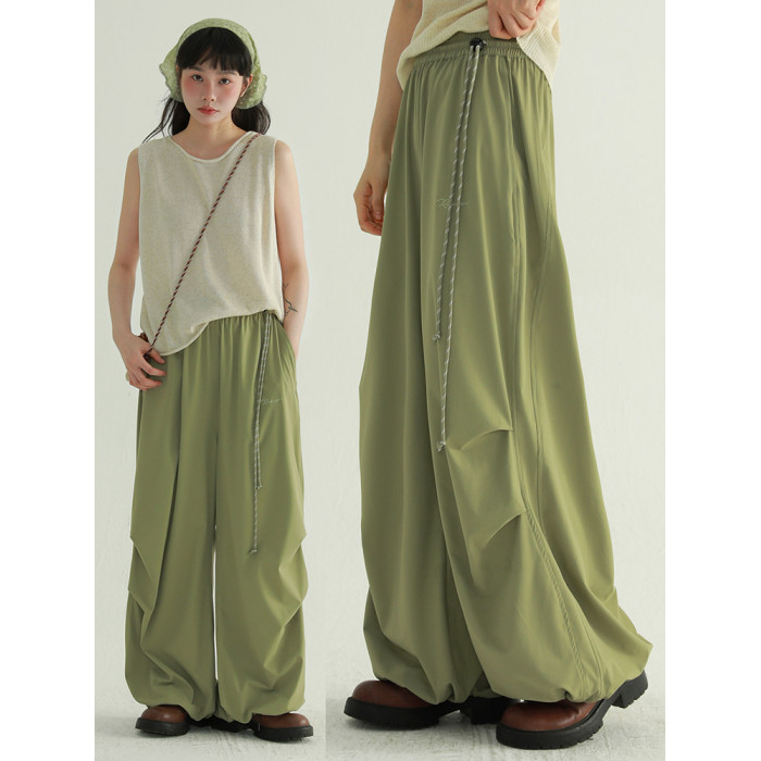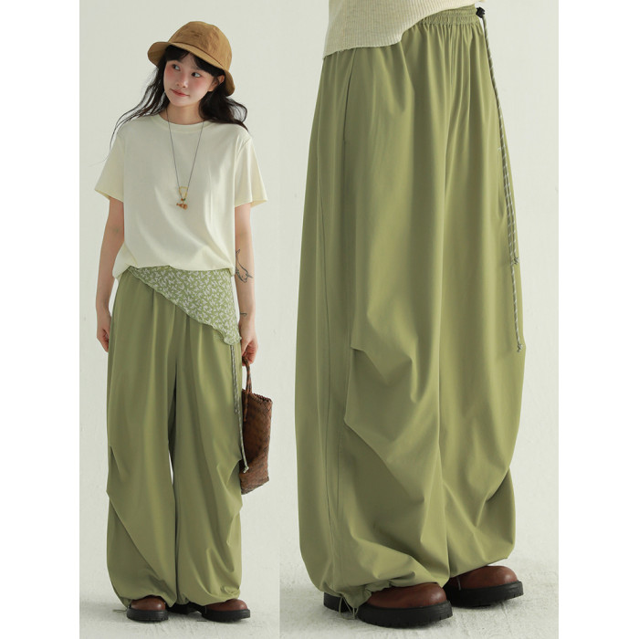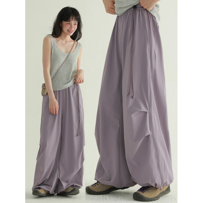 夏季莫蘭迪色系垂感沖鋒褲女休閒簡約百搭褶皺直筒束腳濶腿褲長褲