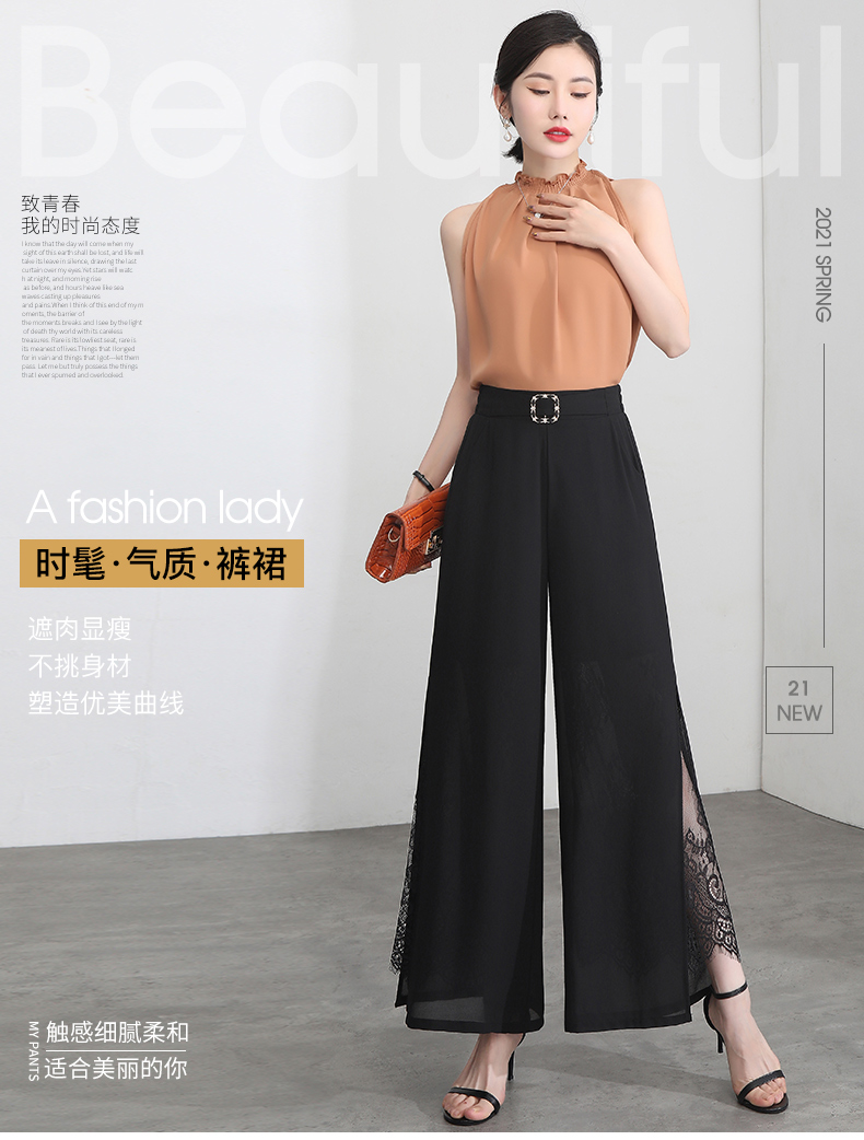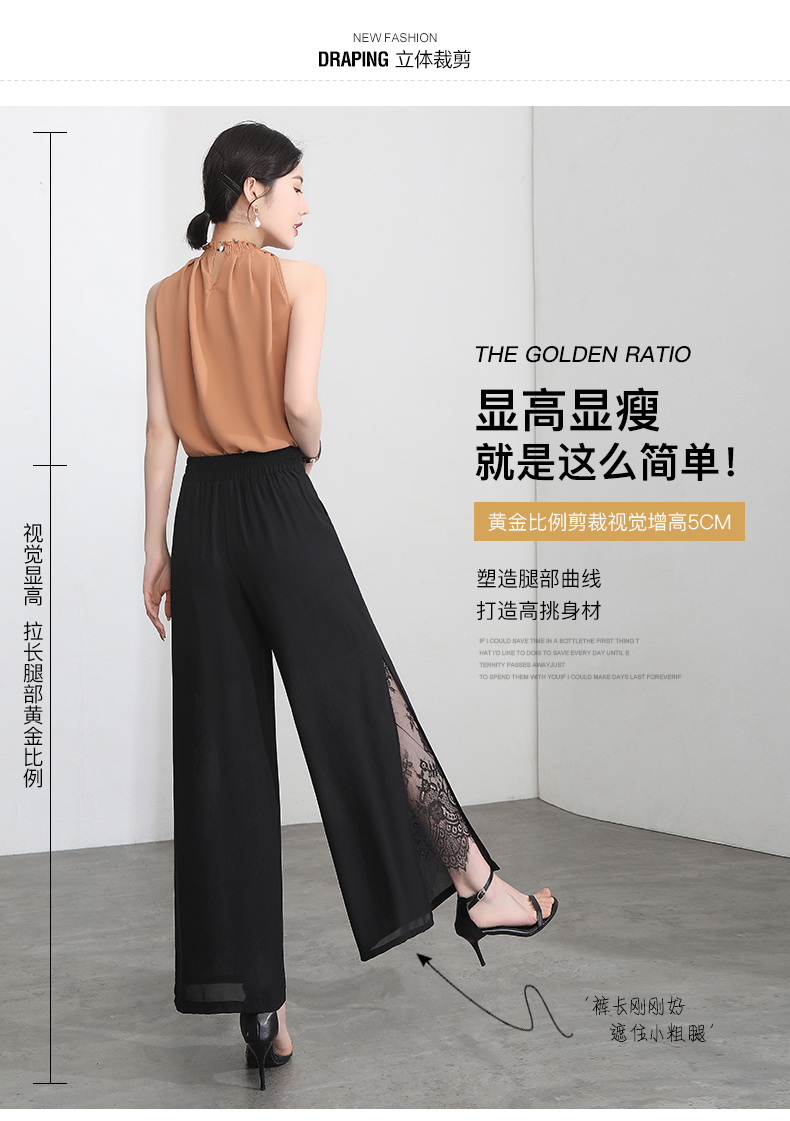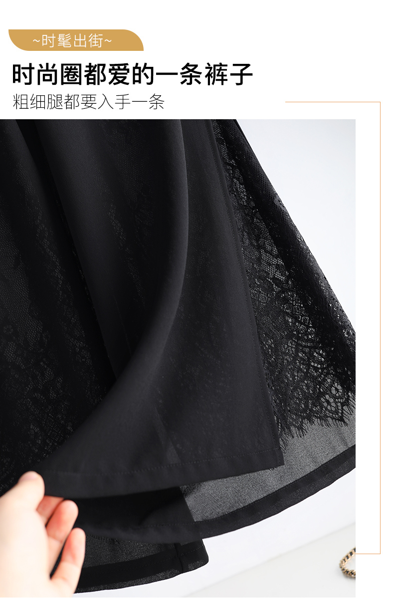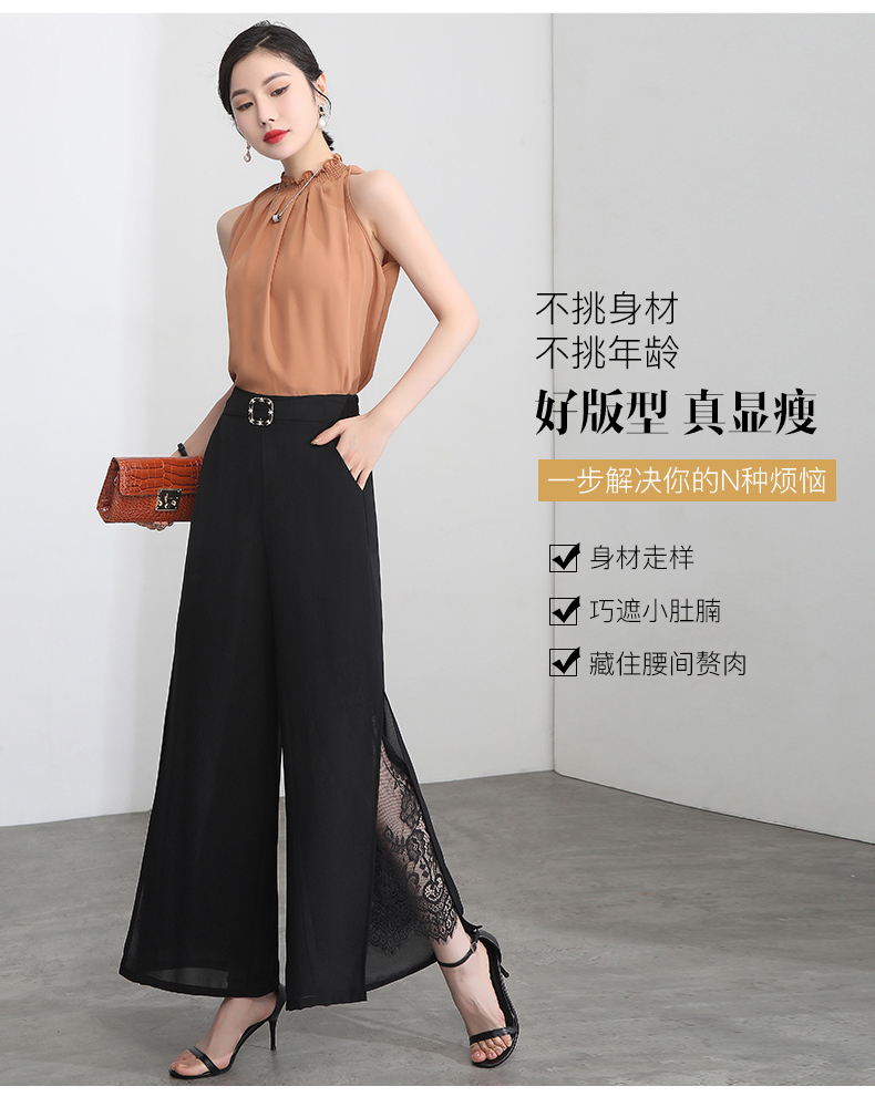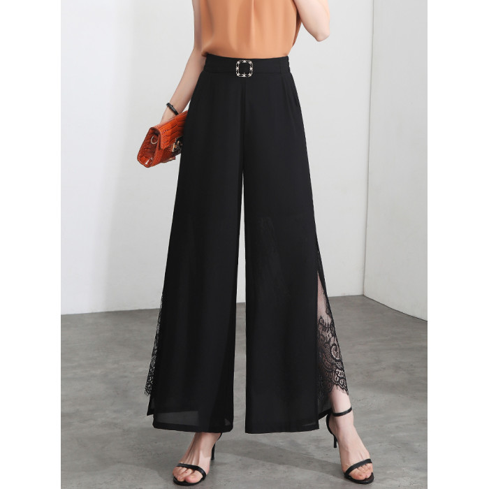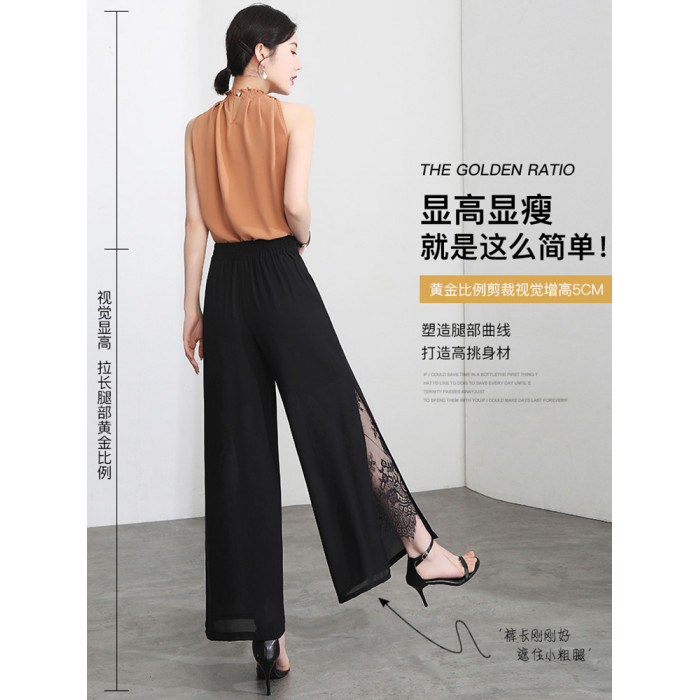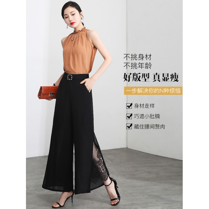 九分褲蕾絲拼接開叉雪紡裙褲女夏季薄款時尚高腰寬松濶腿褲媽媽褲