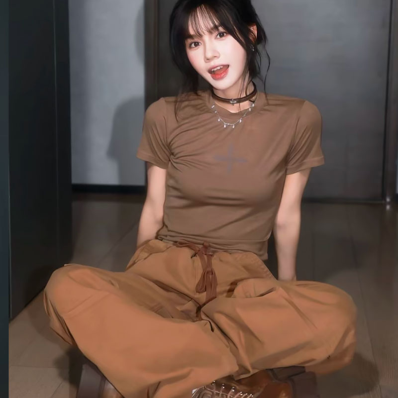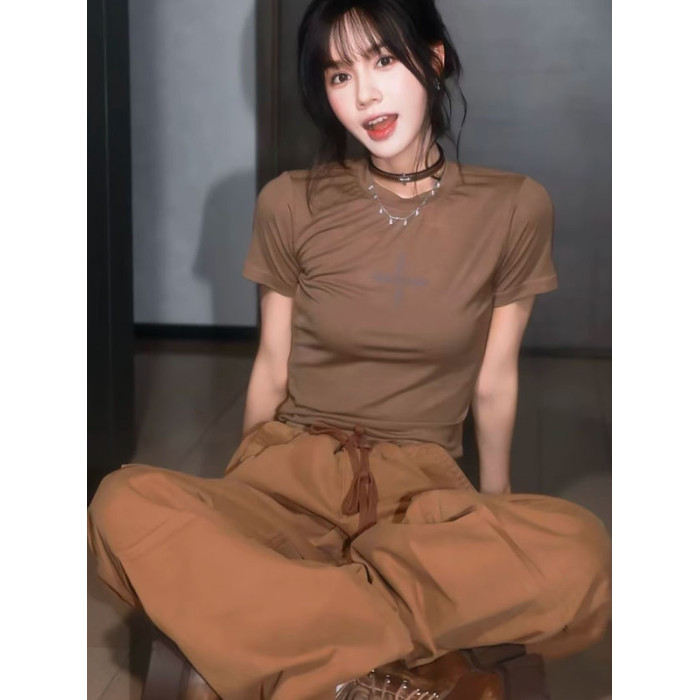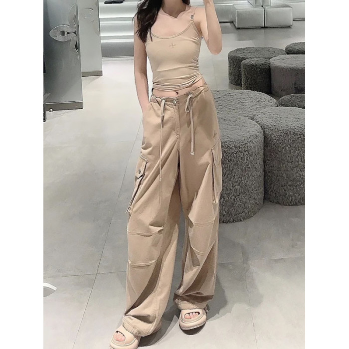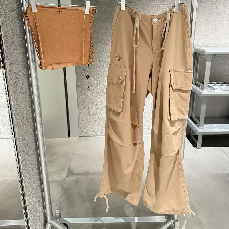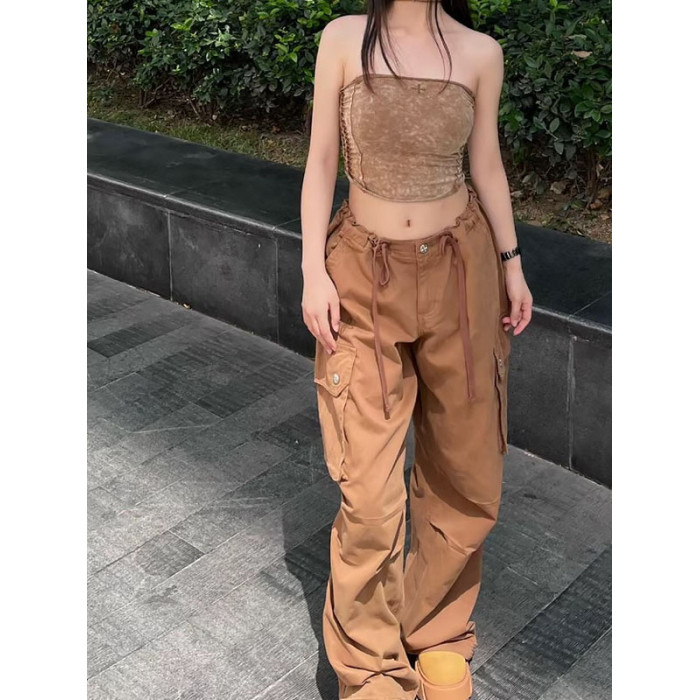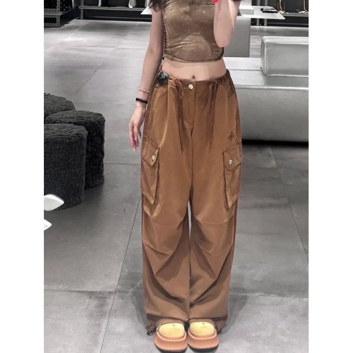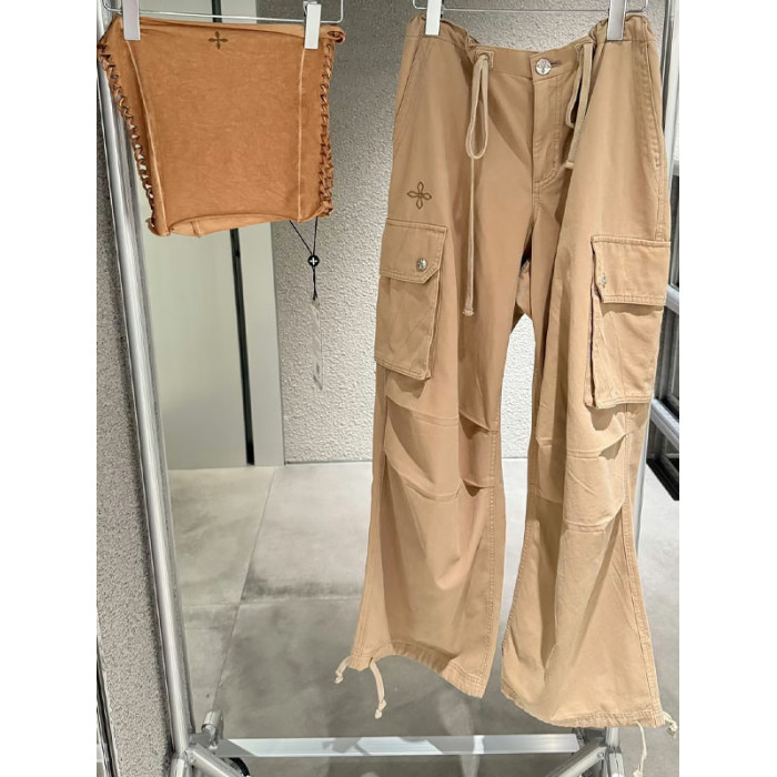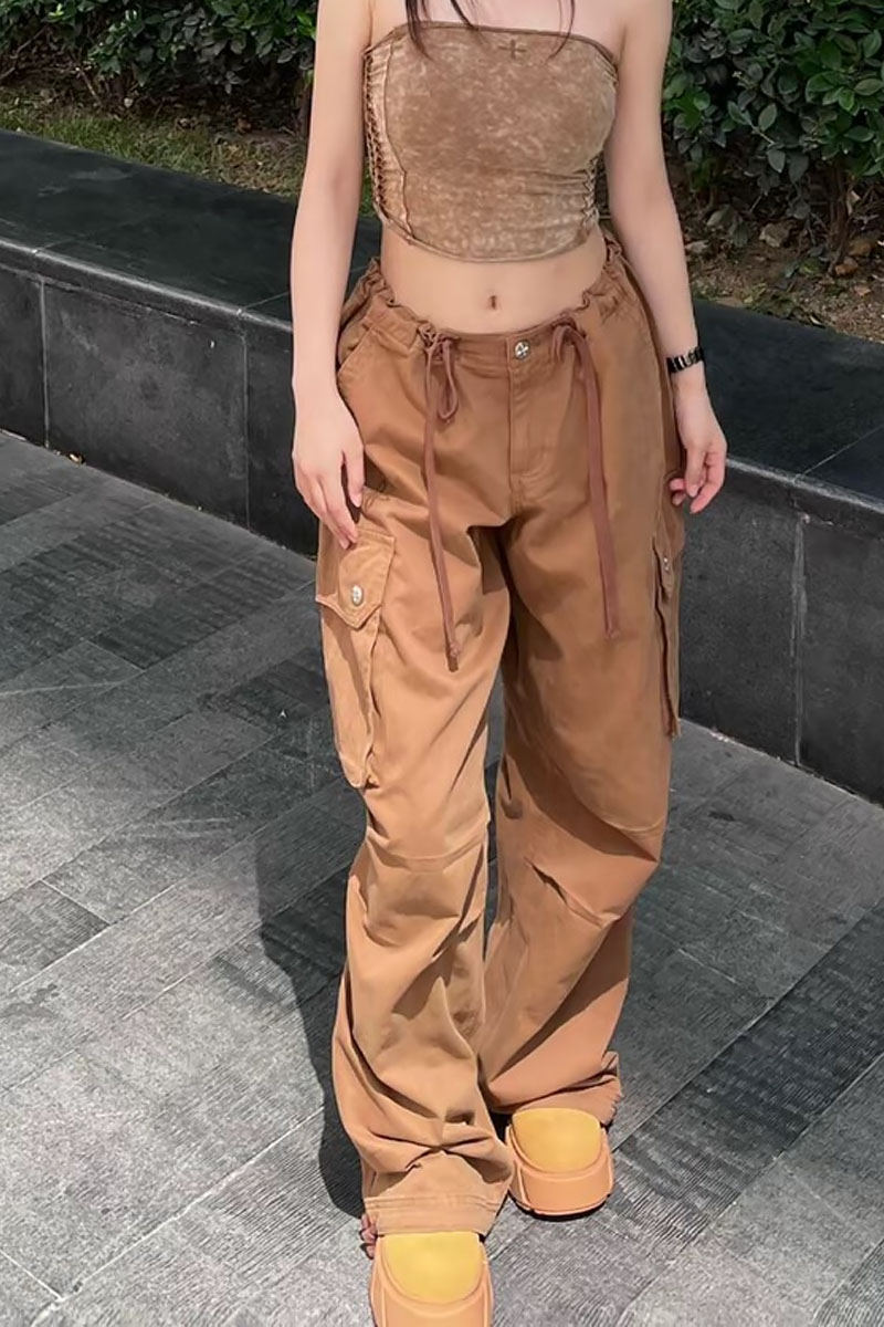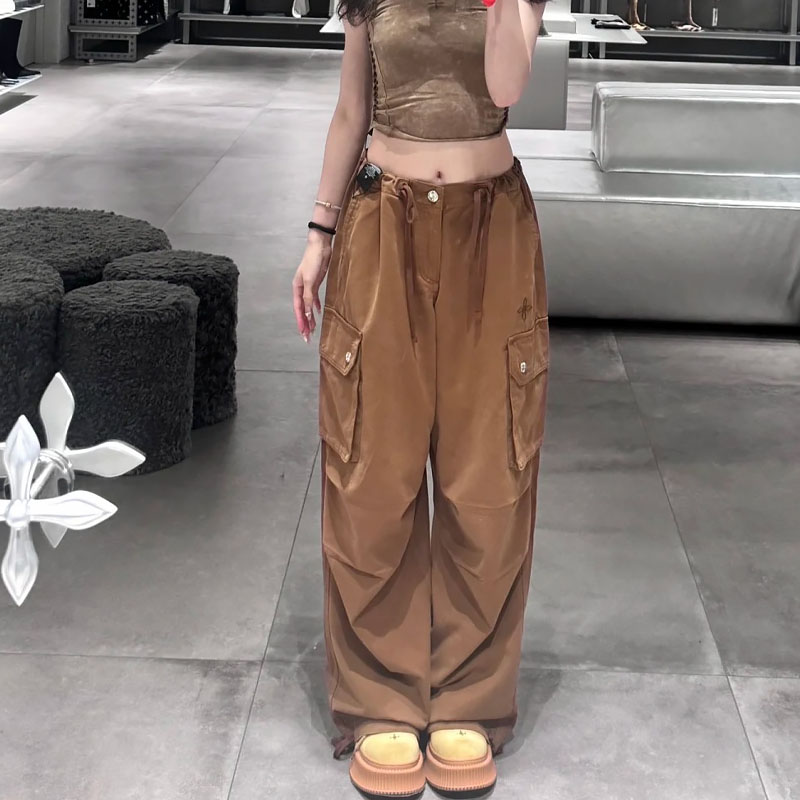 十字花復古繖兵褲棕色抽繩可調節褶皺工裝濶腿褲沙漠色休閒褲