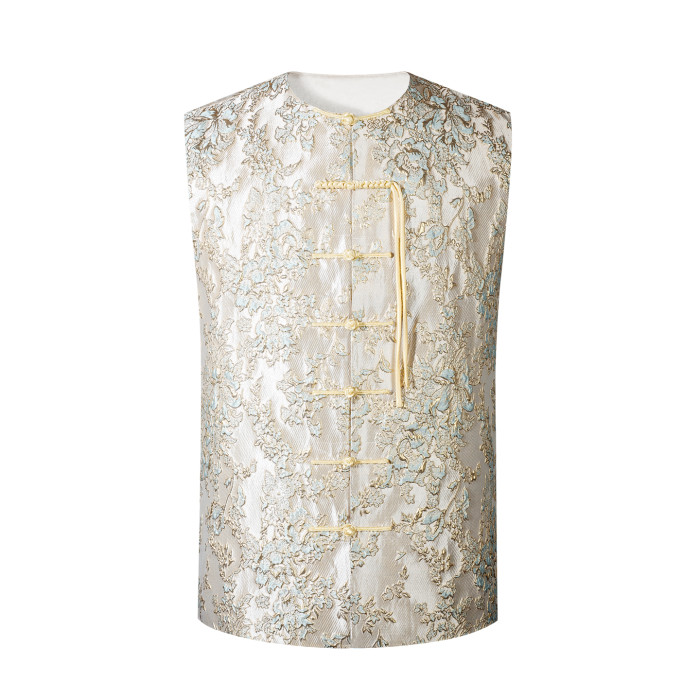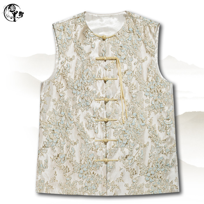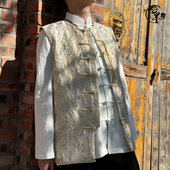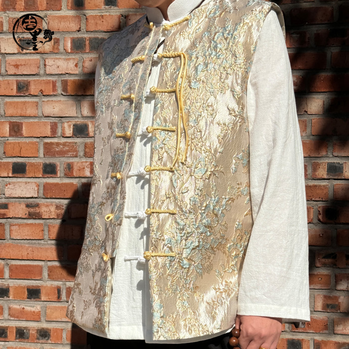 【小碎花】中式馬甲男無領金色浮雕提花緞面對襟馬夾上衣坎肩春秋