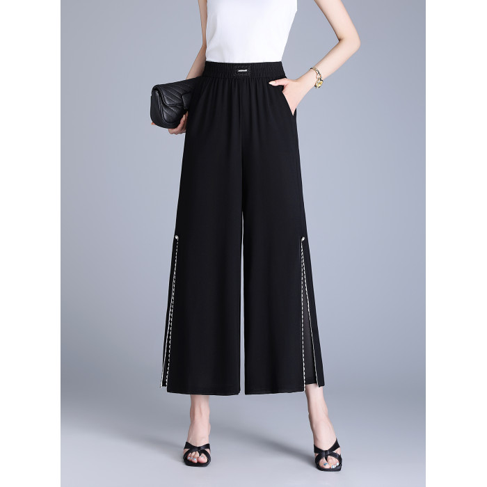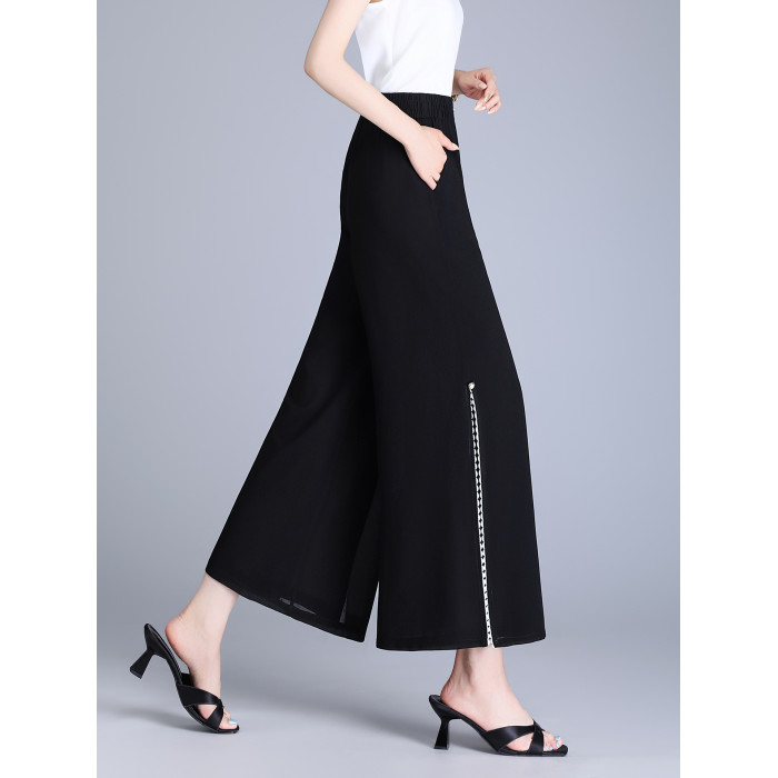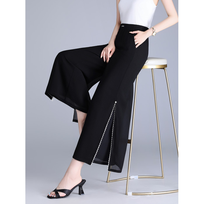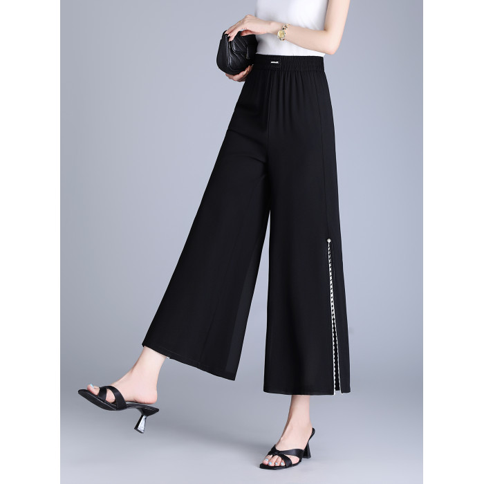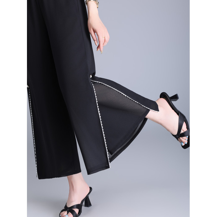 垂感雪紡濶腿褲女夏薄款高腰小個子媽媽褲九分國風花邊開叉直筒褲