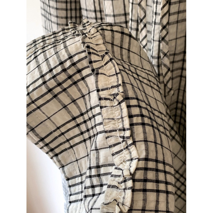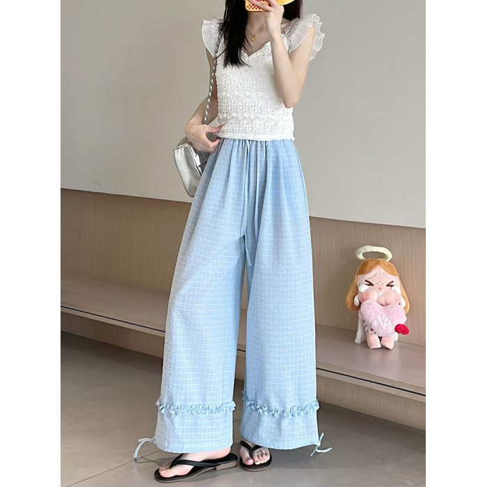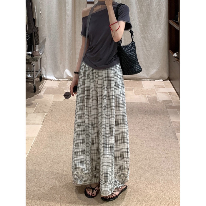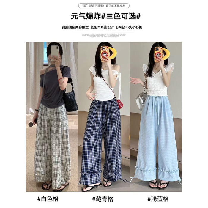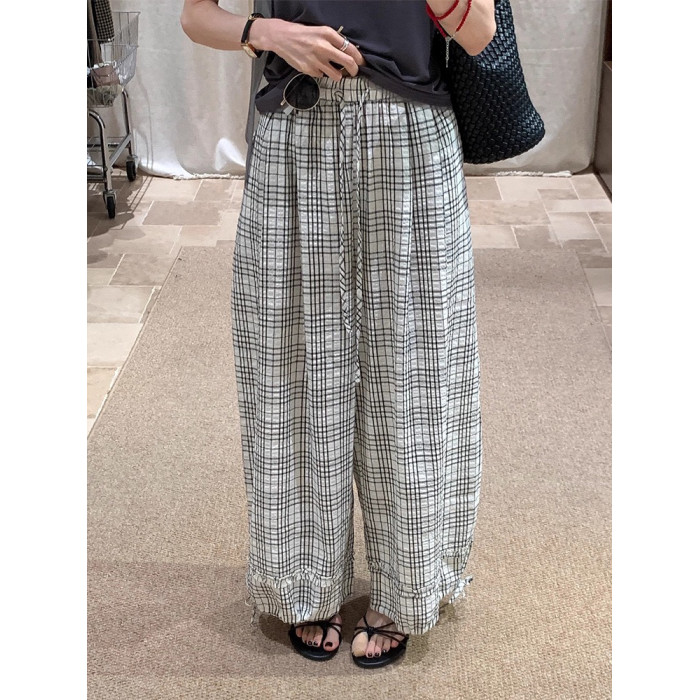 木耳邊格子濶腿褲女夏季薄款2025新款復古高腰寬松休閒直筒山本褲