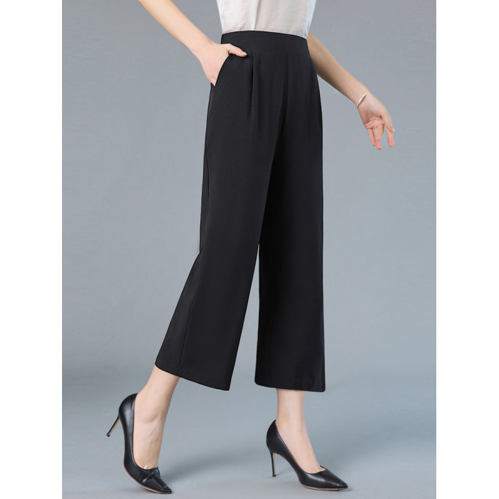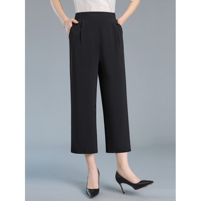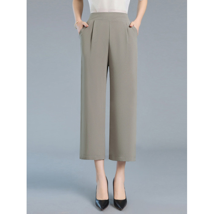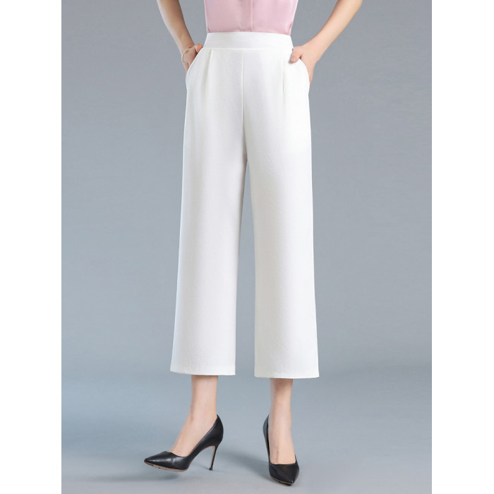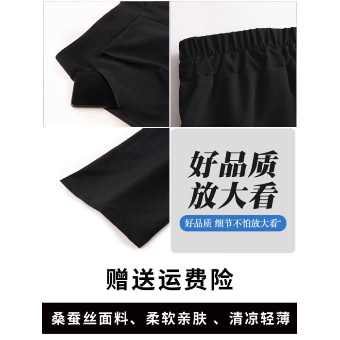 嫣芙真絲女褲夏季薄款高腰濶腿褲中老年直筒褲桑蠶絲九分褲休閒褲