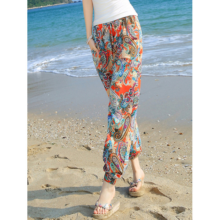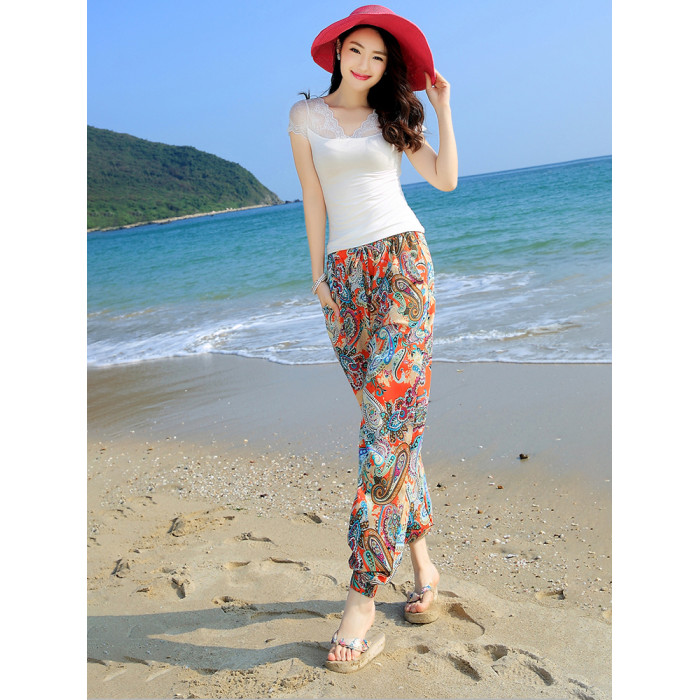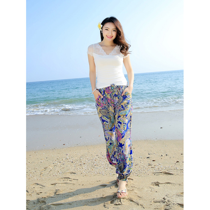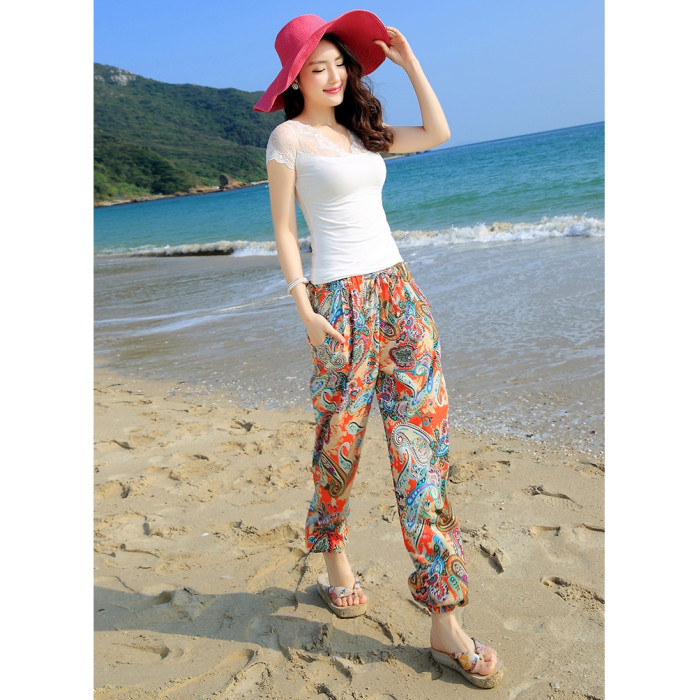 媽媽濶腿褲女夏季薄款花褲子雪紡休閒寬松束腳燈籠褲冰絲沙灘褲
