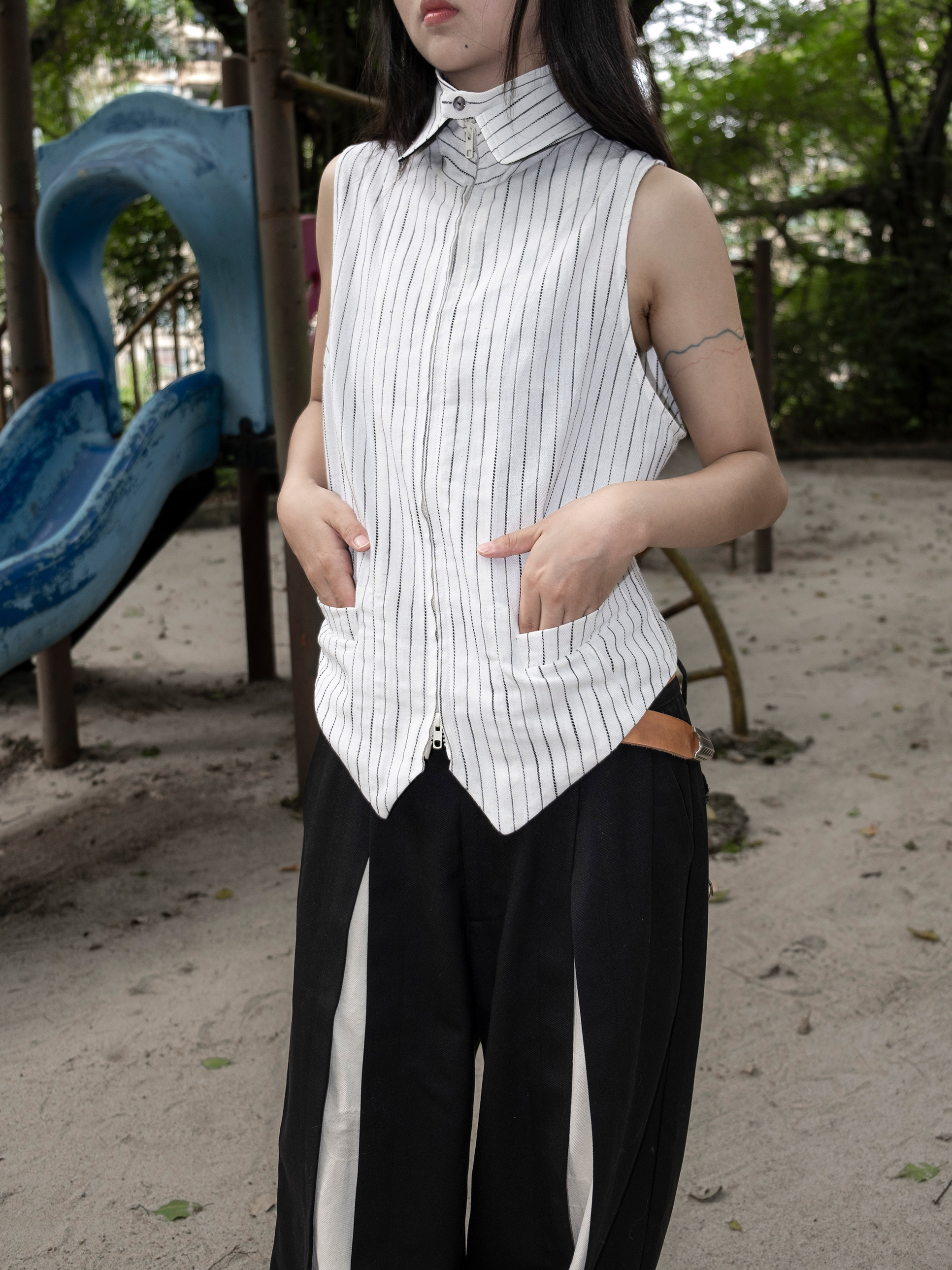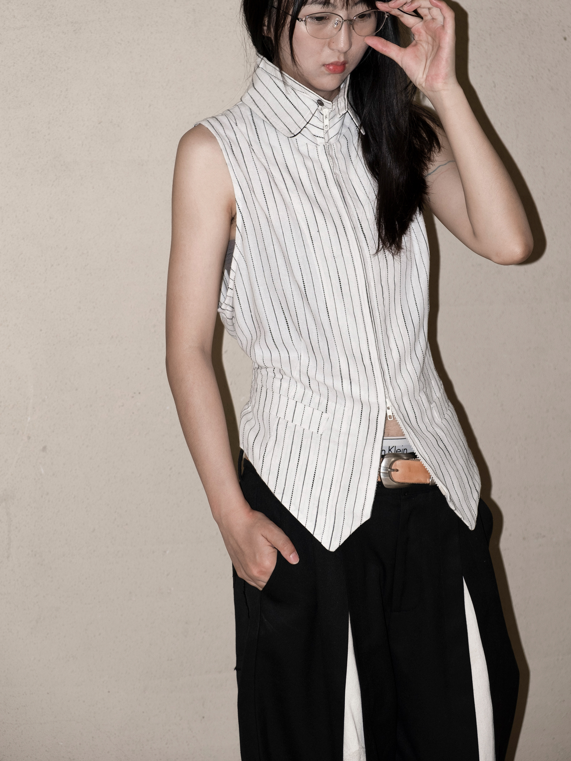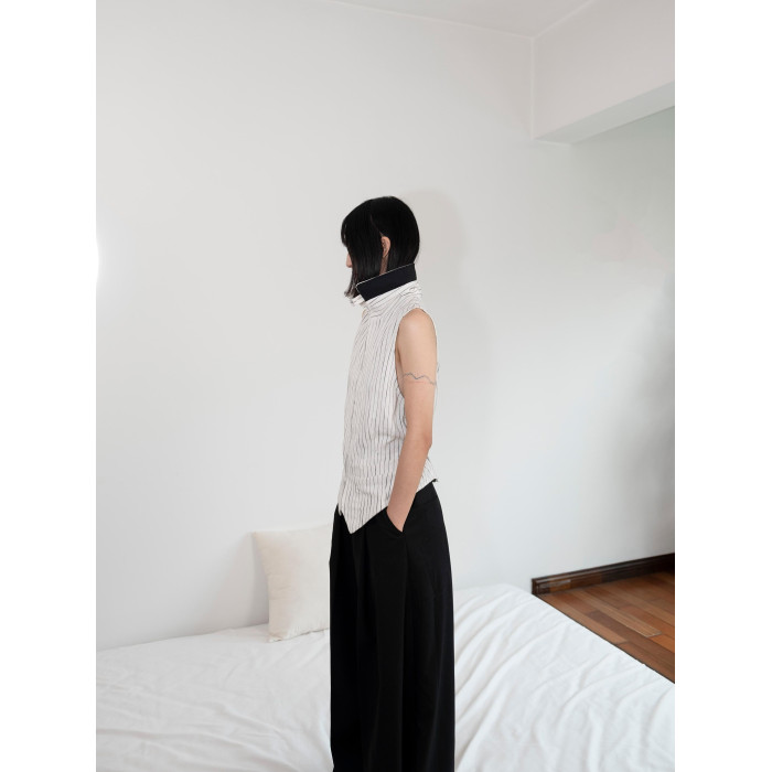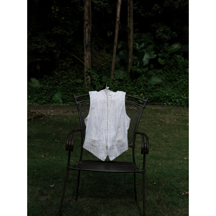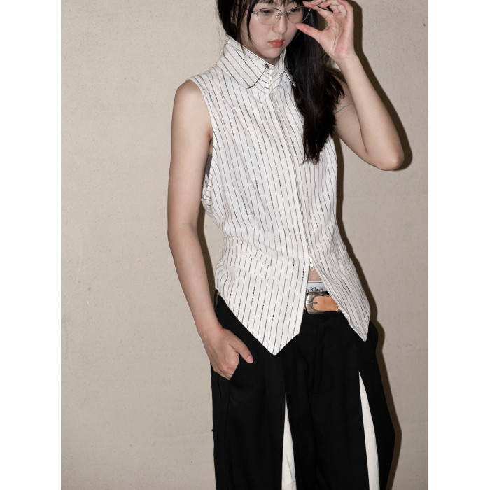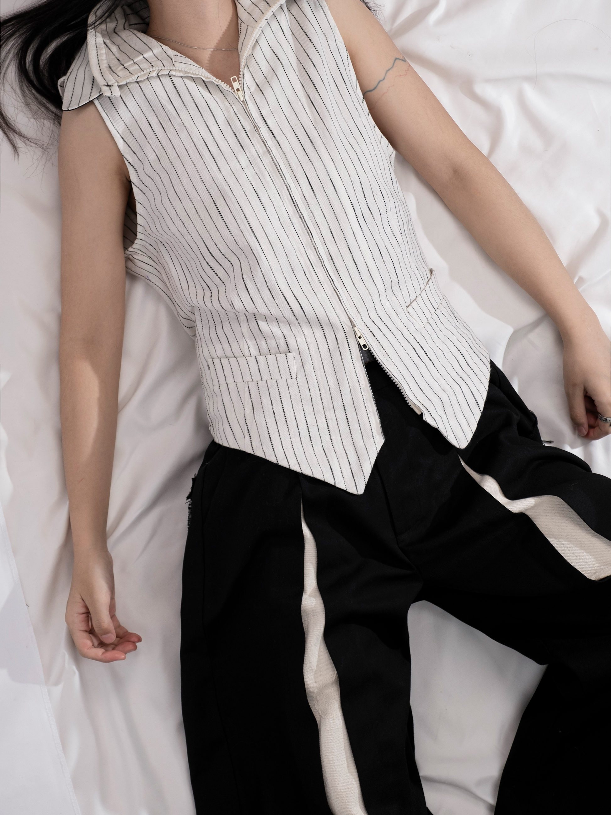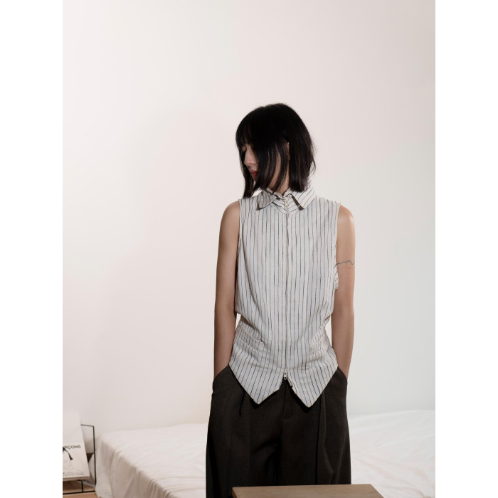 DeadOnArrival "悉達多" 雙開拉鍊馬甲 中性亞麻條紋拼接翻領馬甲