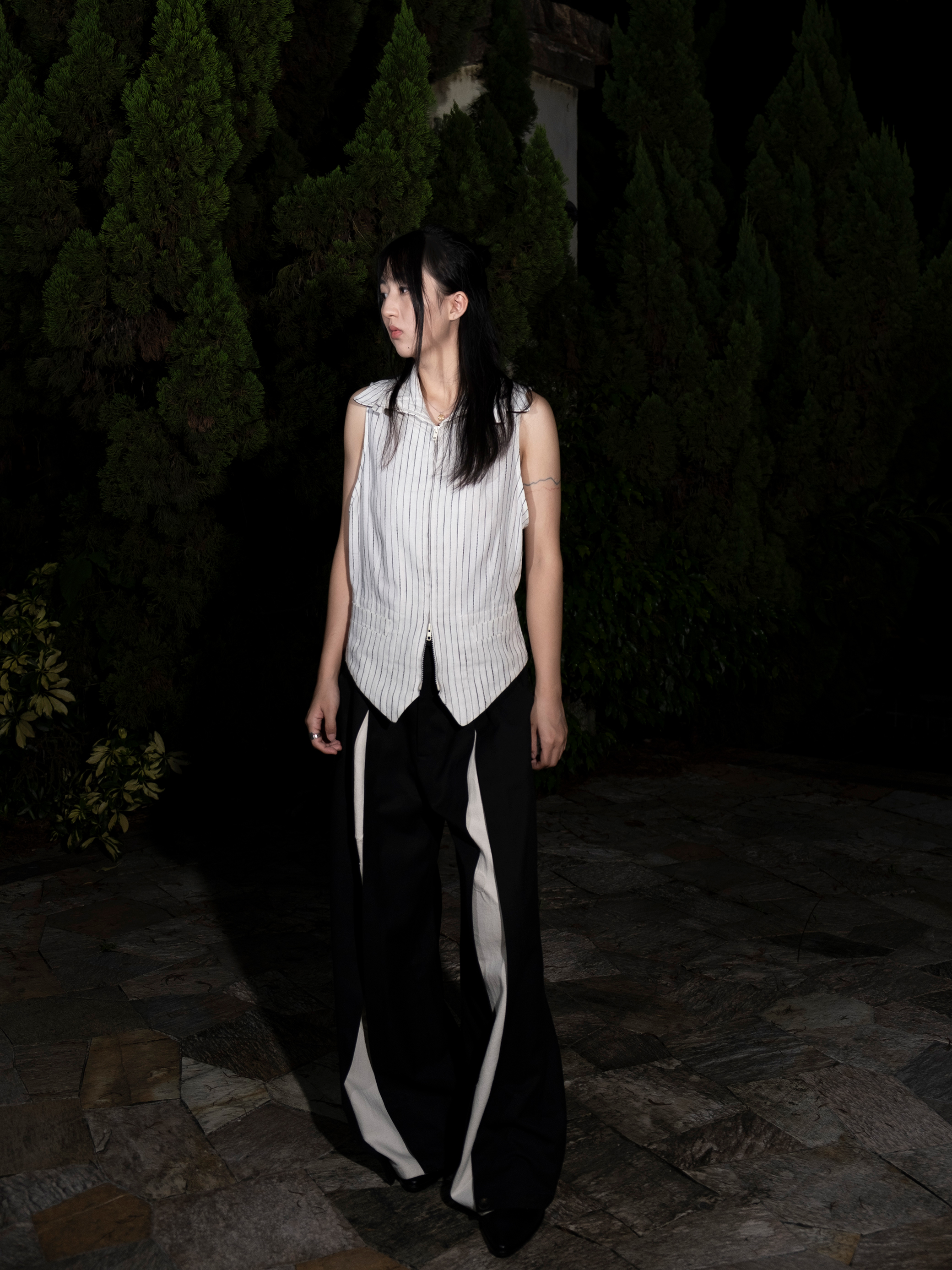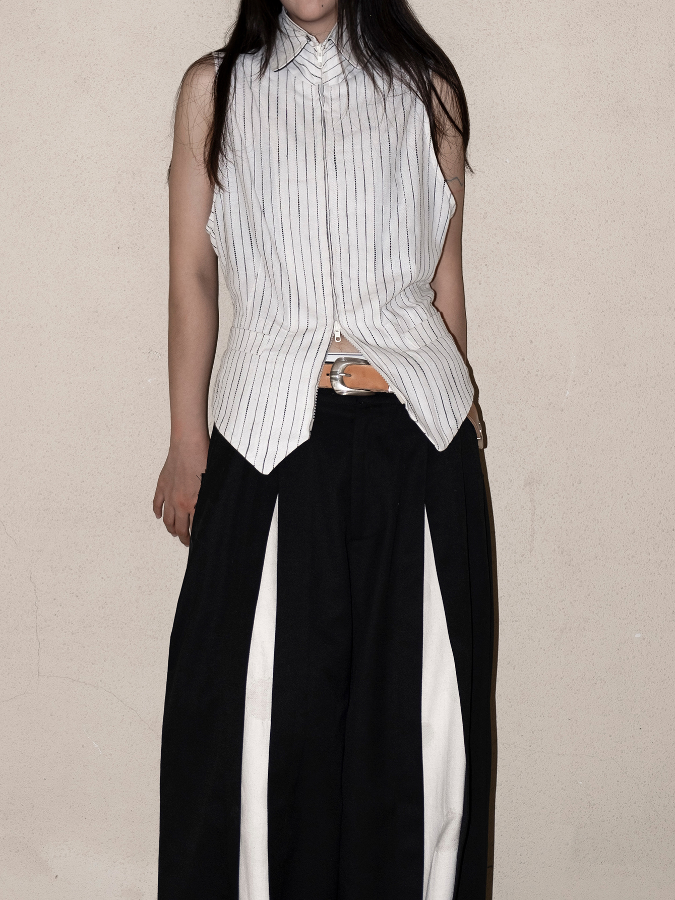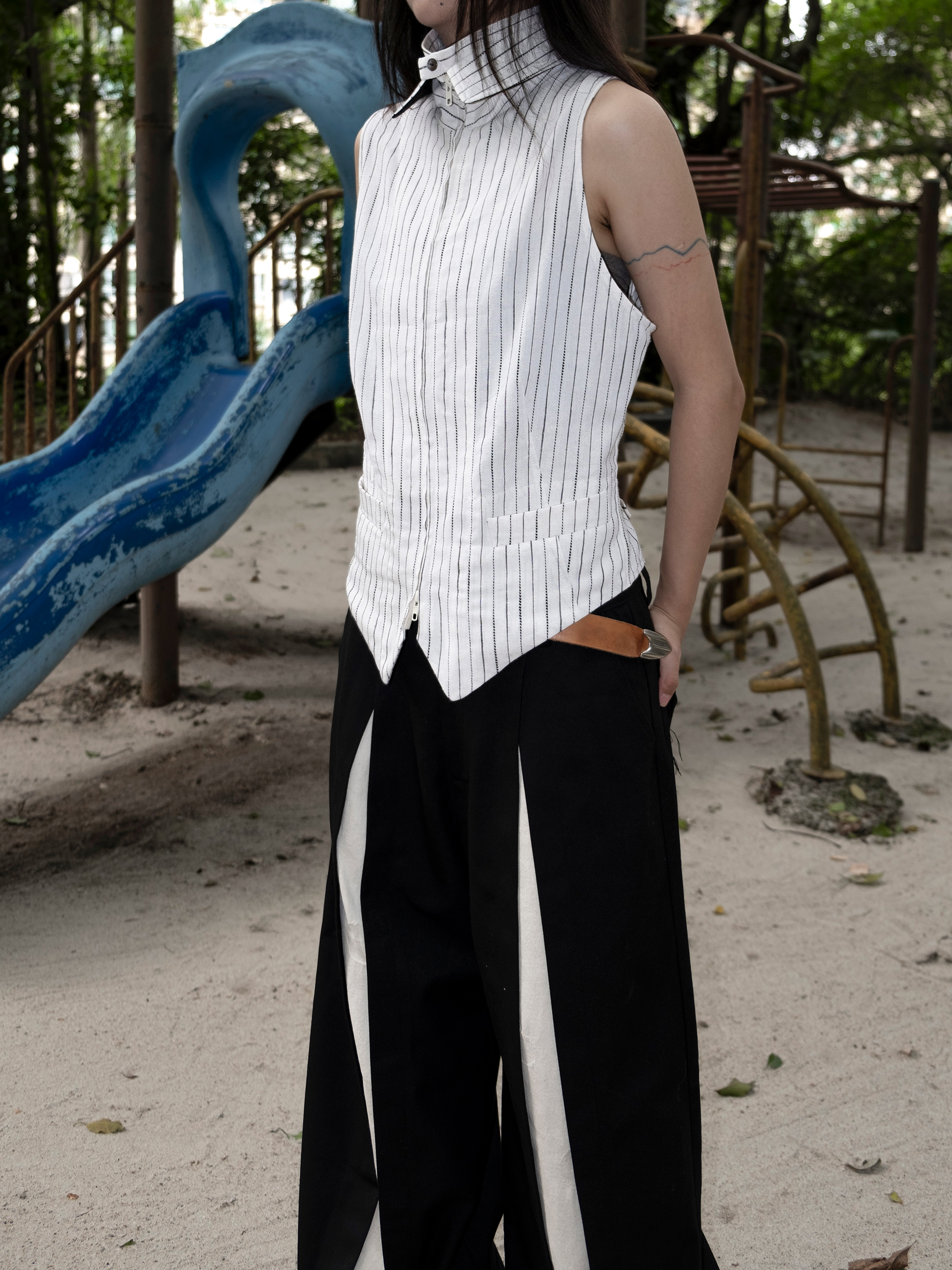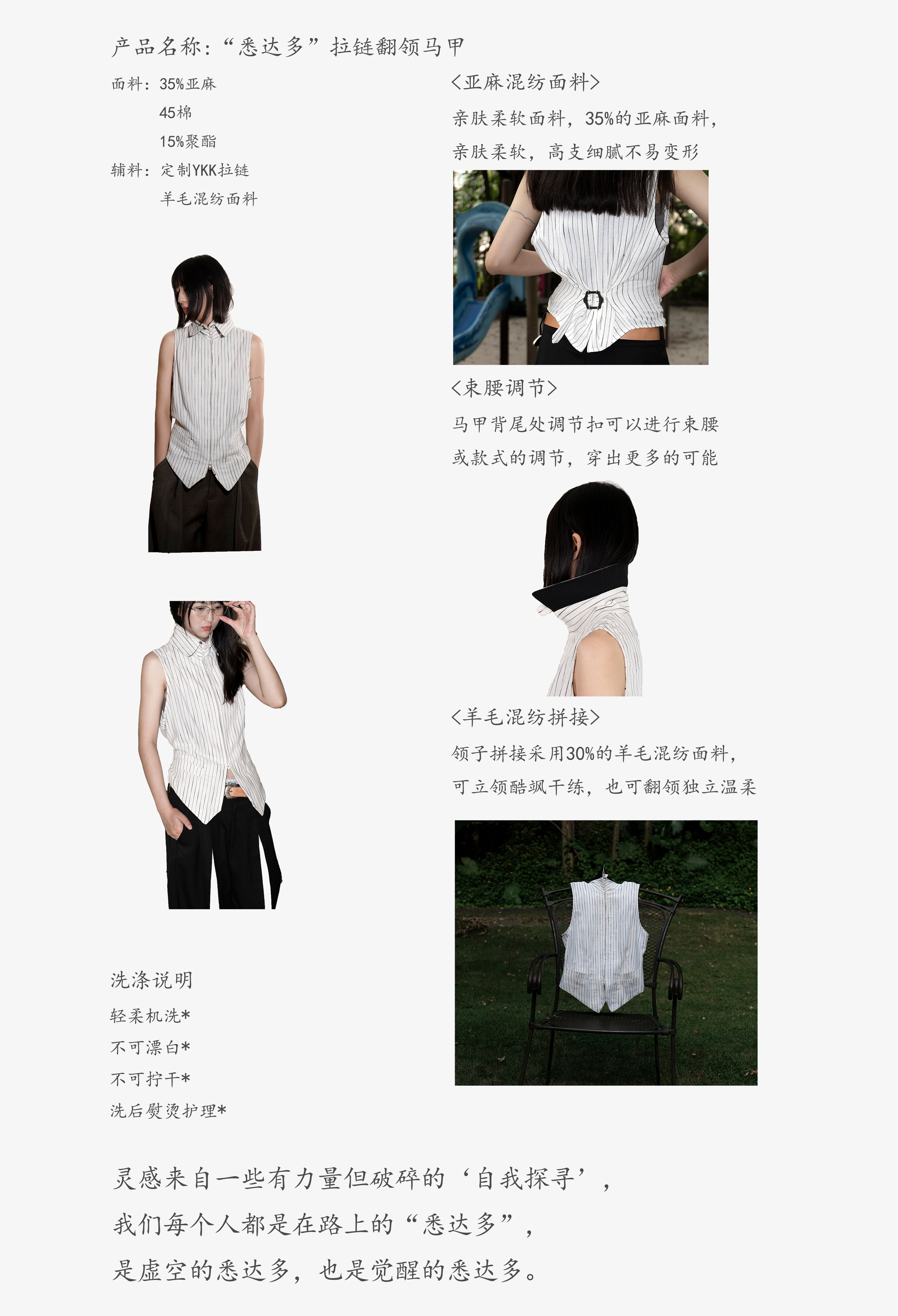 DeadOnArrival "悉達多" 雙開拉鍊馬甲 中性亞麻條紋拼接翻領馬甲
