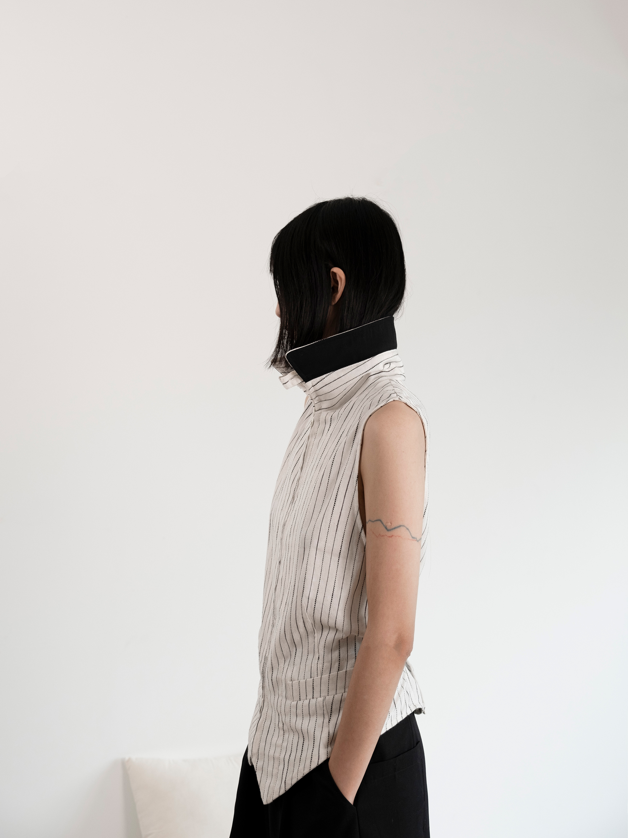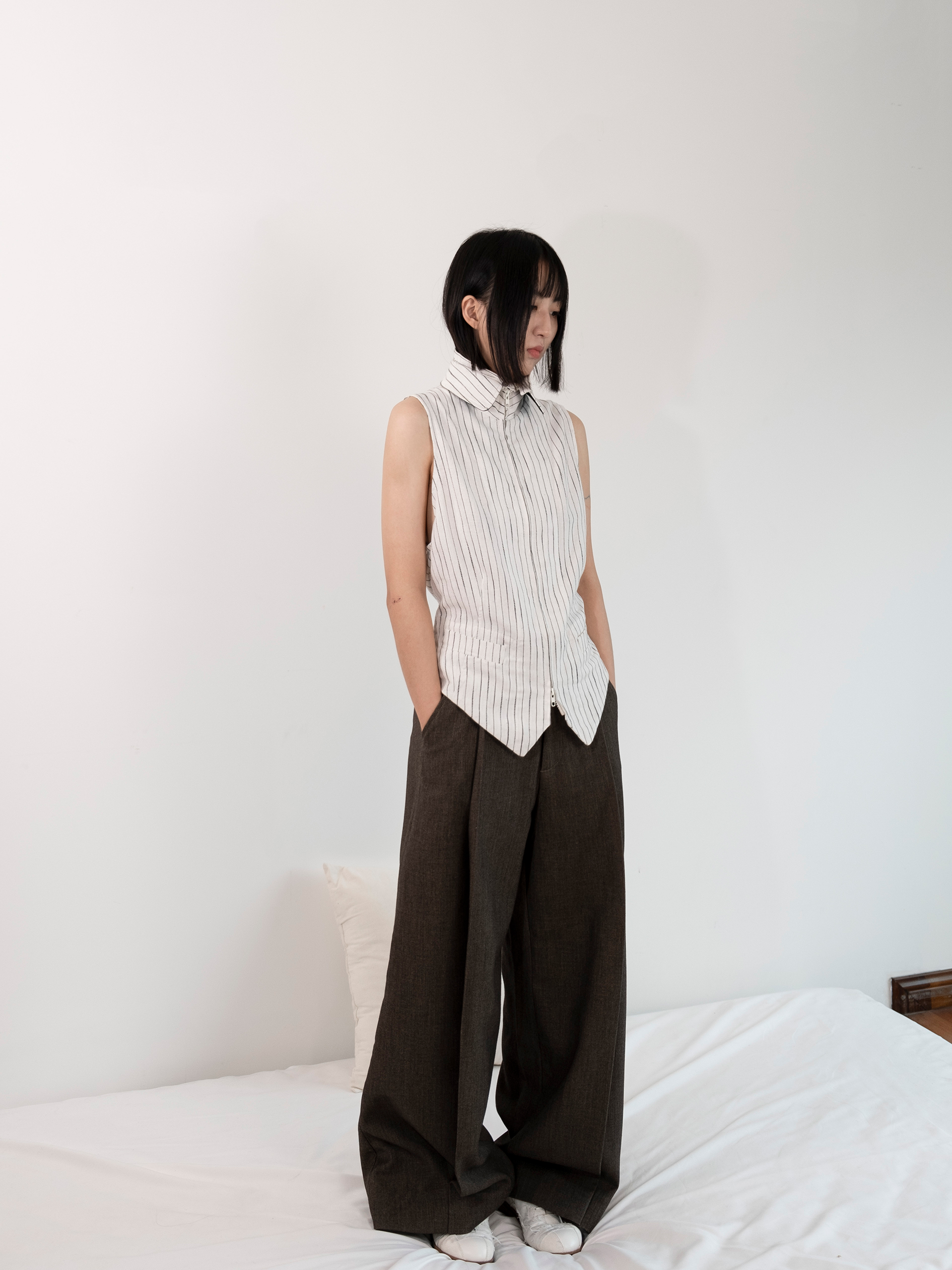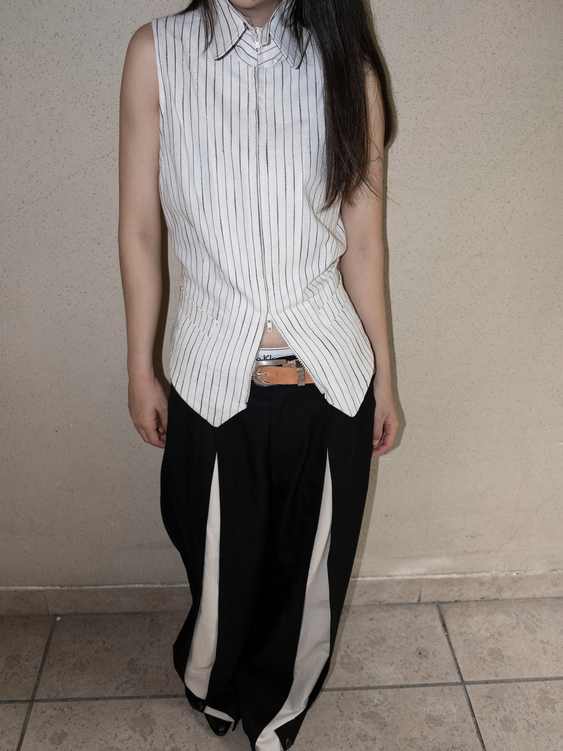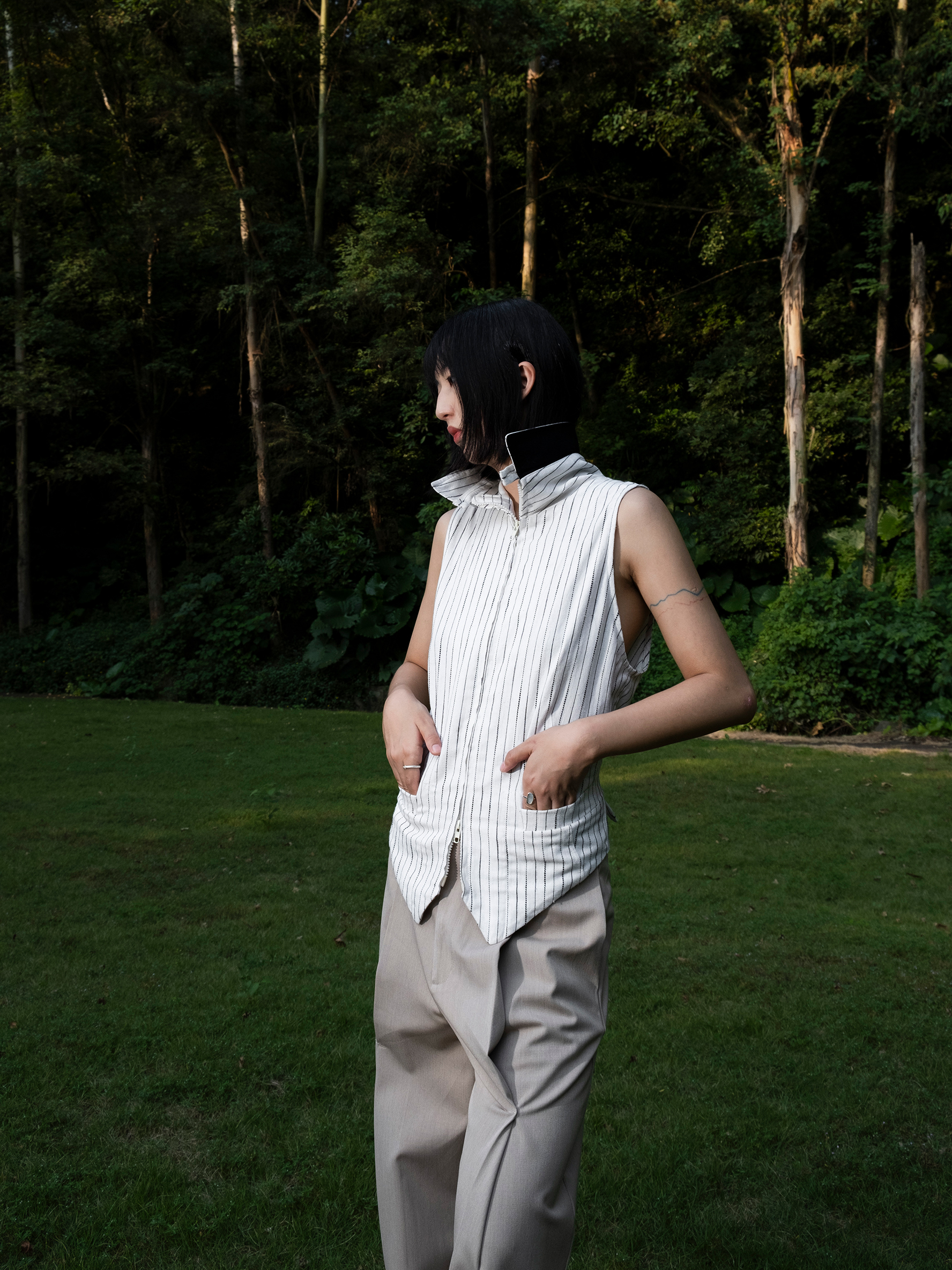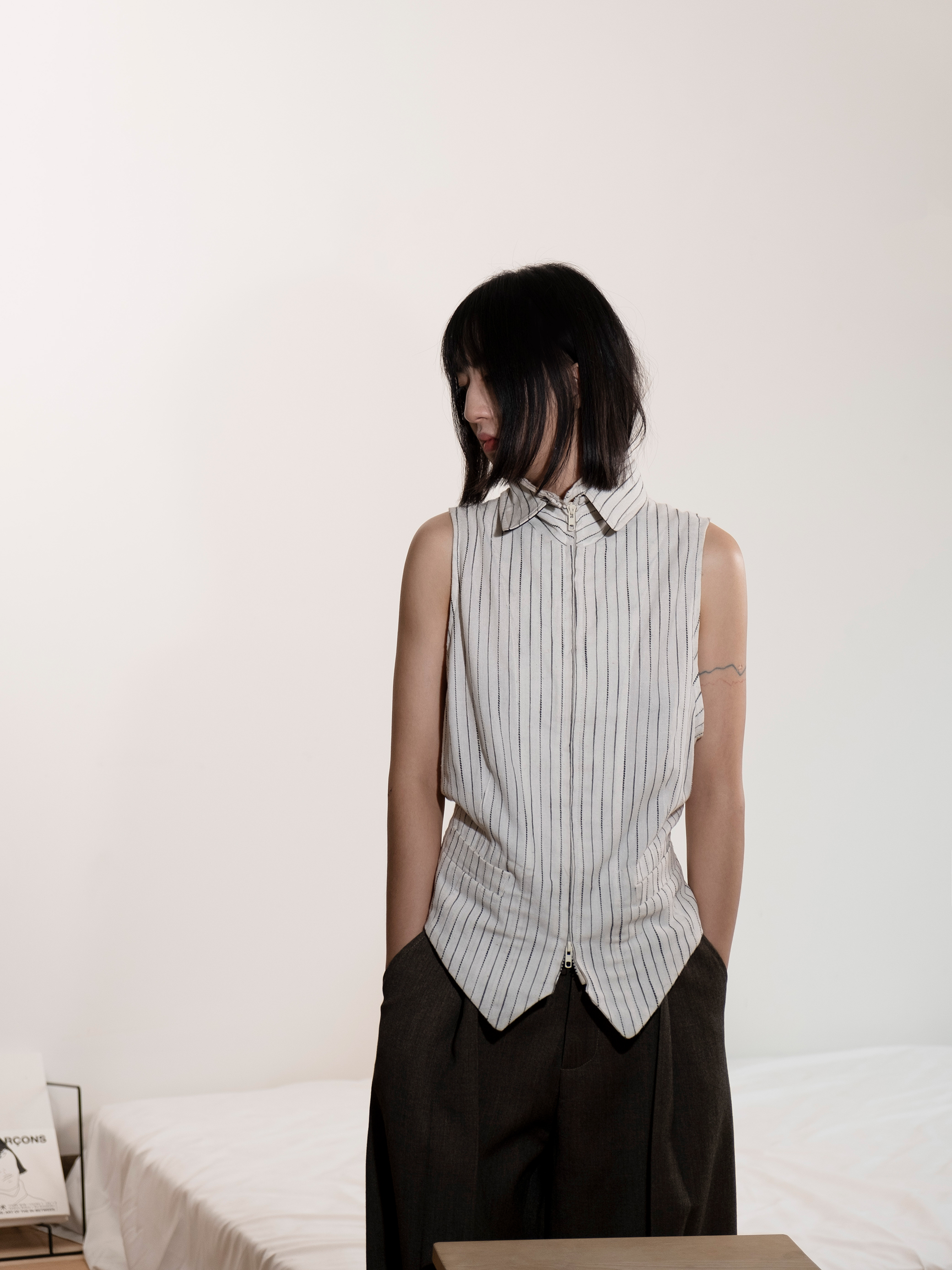 DeadOnArrival "悉達多" 雙開拉鍊馬甲 中性亞麻條紋拼接翻領馬甲