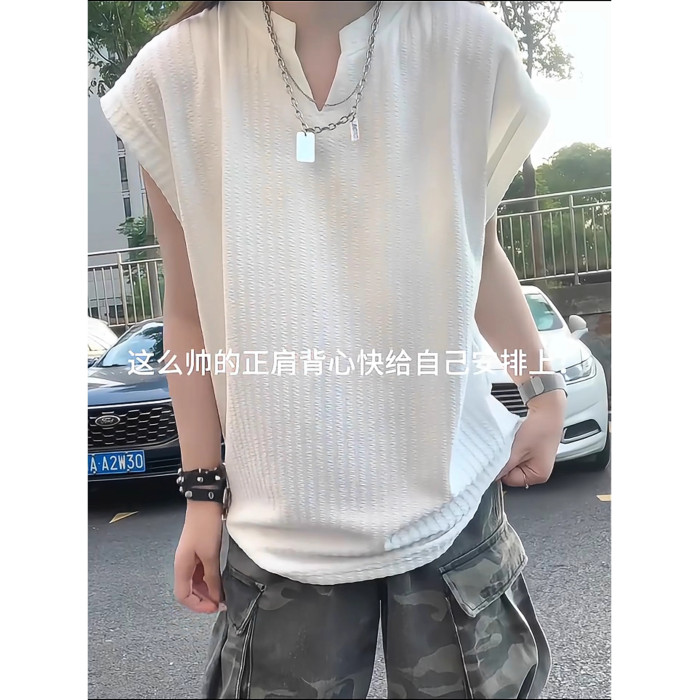白色肌理感冰絲v領背心男女夏季薄款速乾運動汗衫無袖t恤美式坎肩