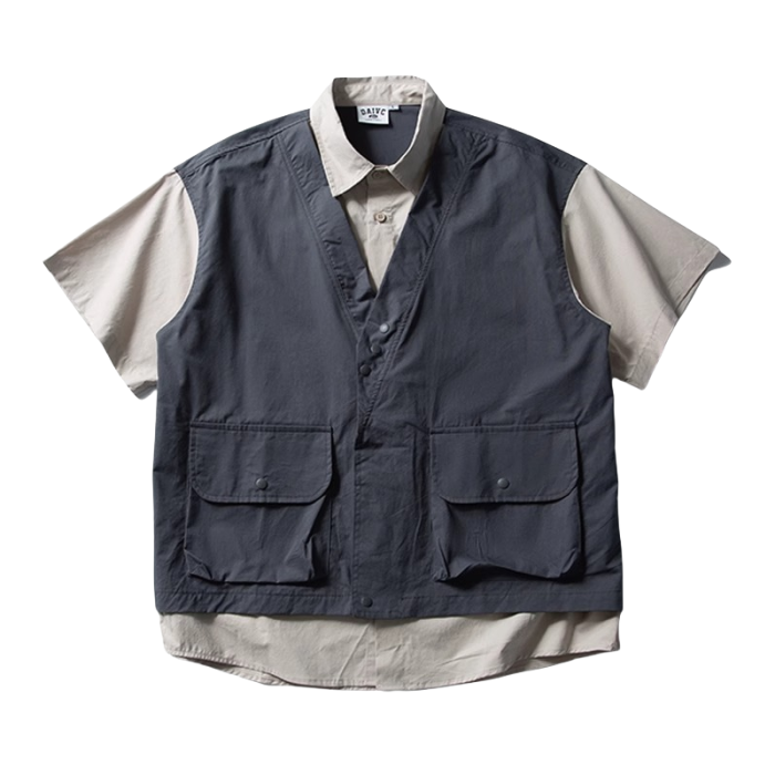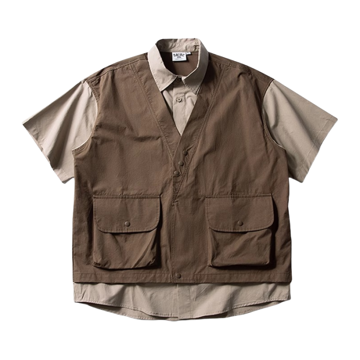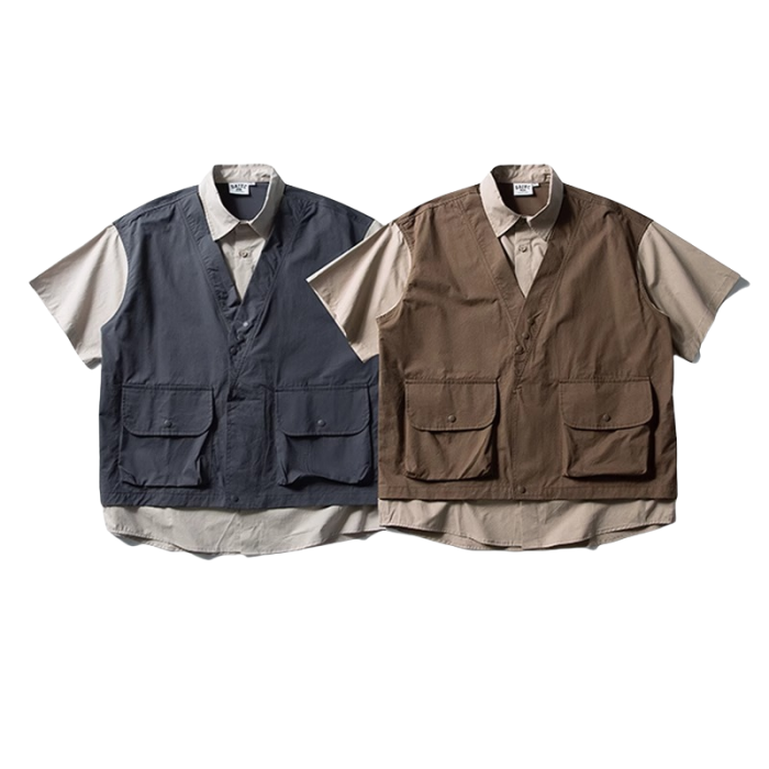 WHISPER小衆潮牌聯名古撞色拼接假兩件休閒工裝馬甲短袖襯