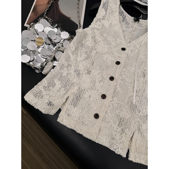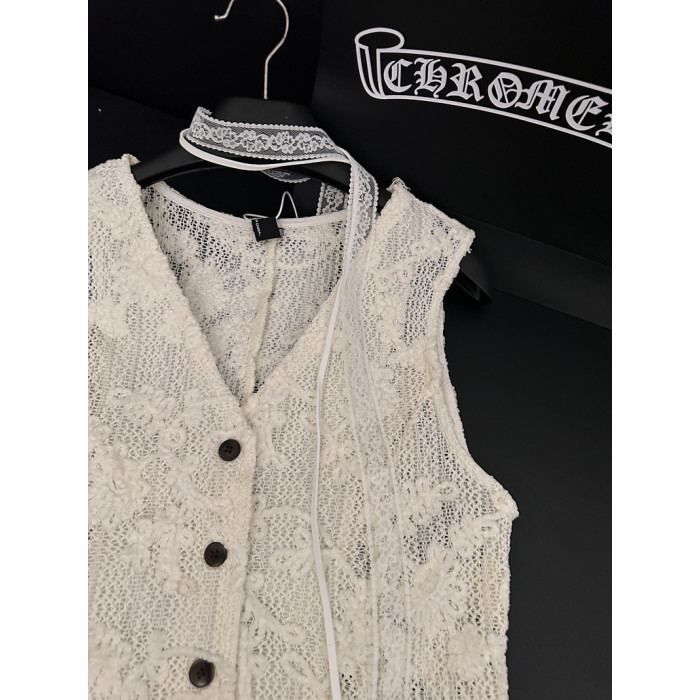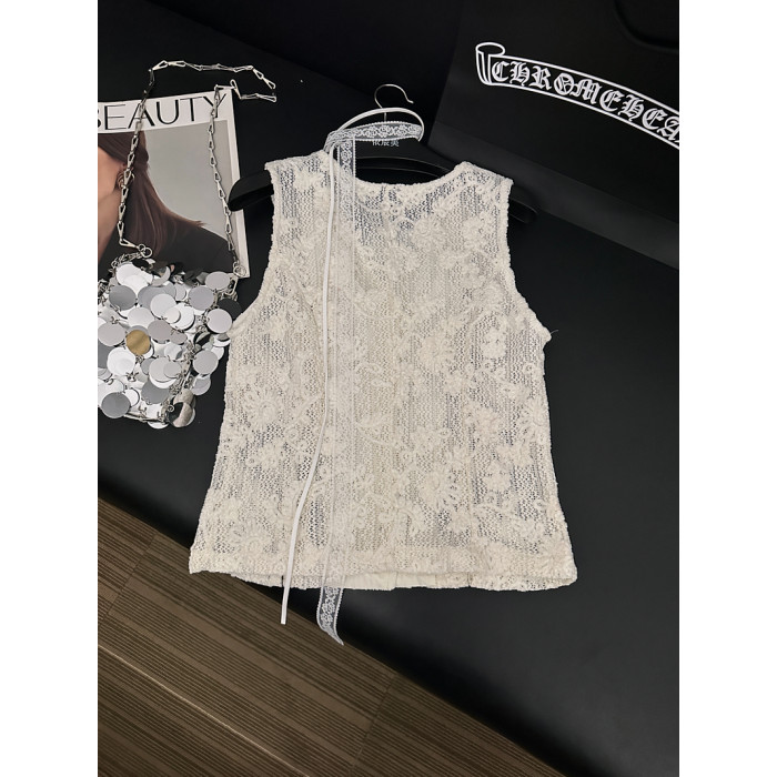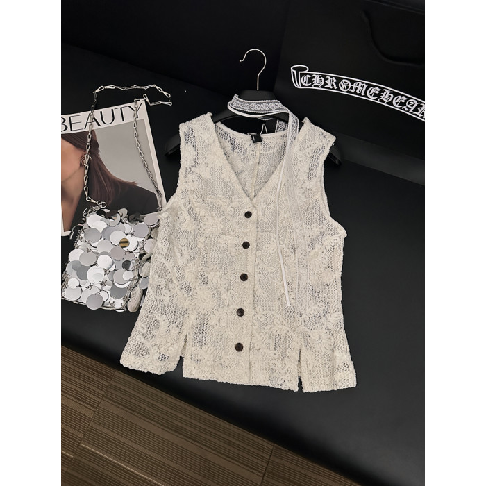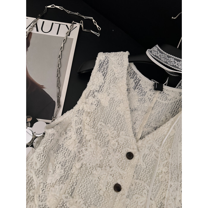 一慄莎子~法式v領鉤花飄帶蕾絲馬甲女夏新款獨特別致坎肩馬夾上衣