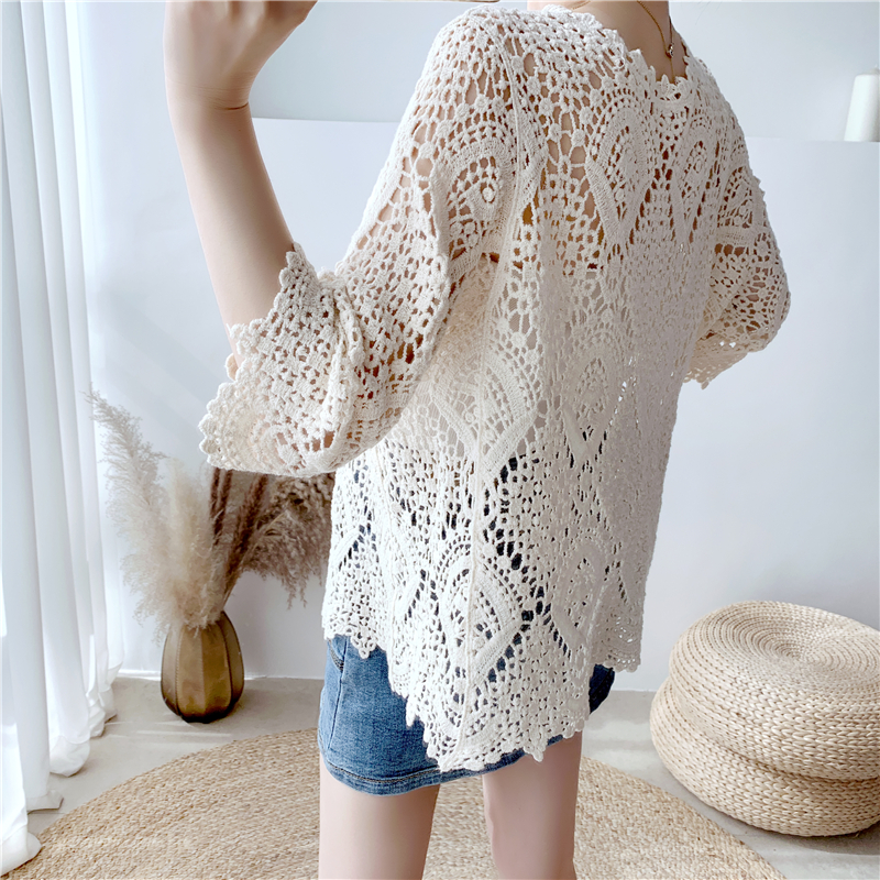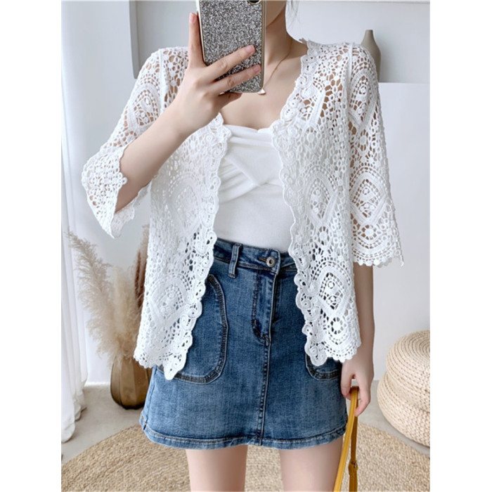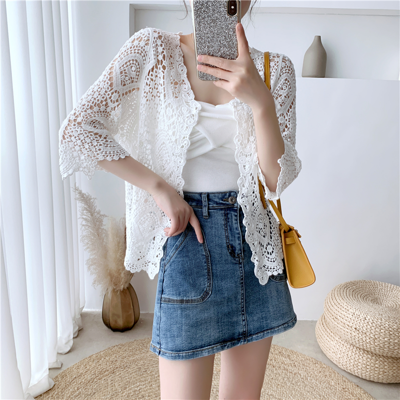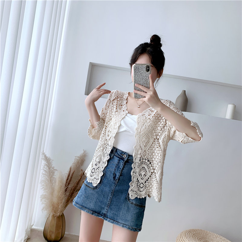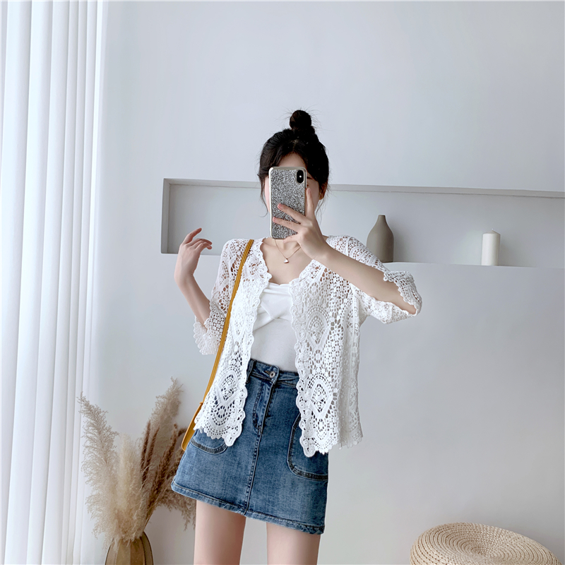 韓版夏季蕾絲坎肩薄款七分袖披肩外搭新款外套女裝開衫鏤空防曬衣