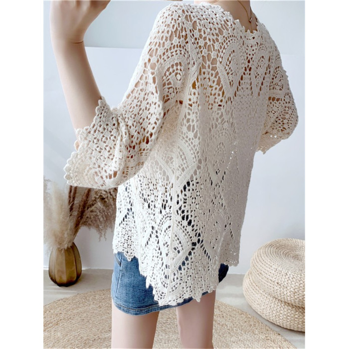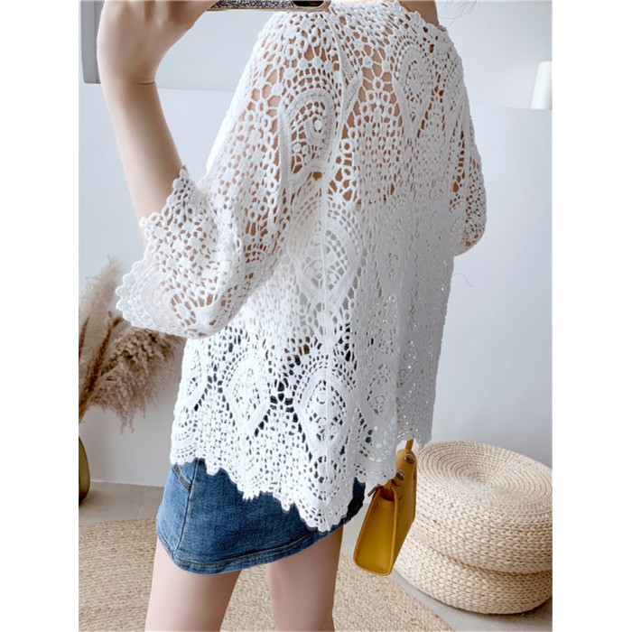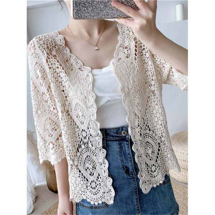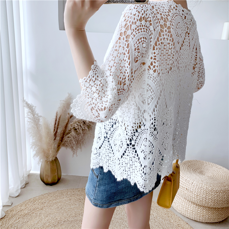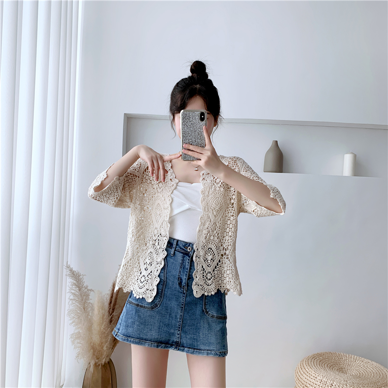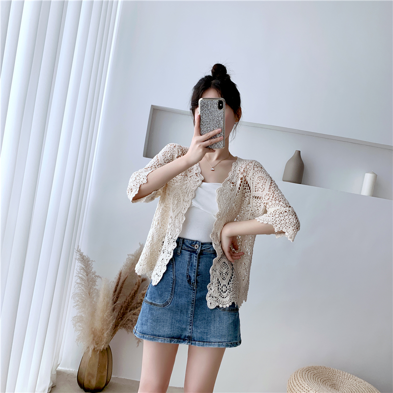 韓版夏季蕾絲坎肩薄款七分袖披肩外搭新款外套女裝開衫鏤空防曬衣