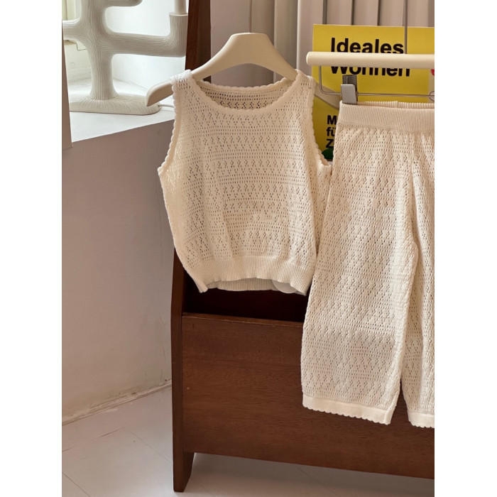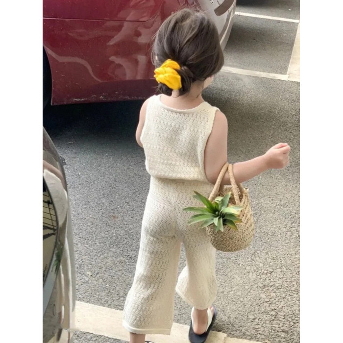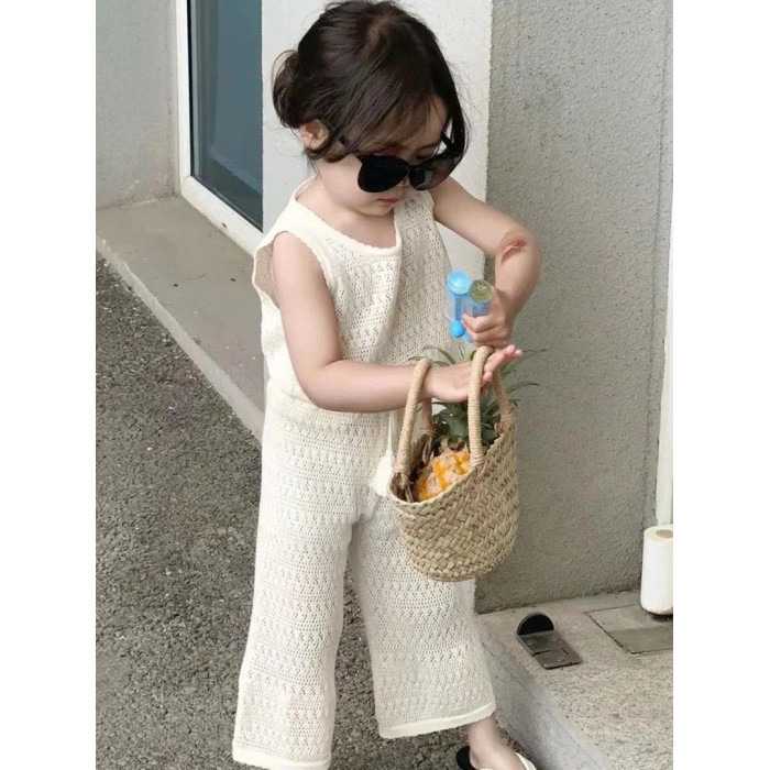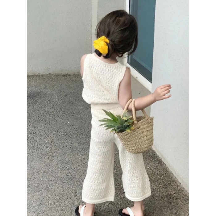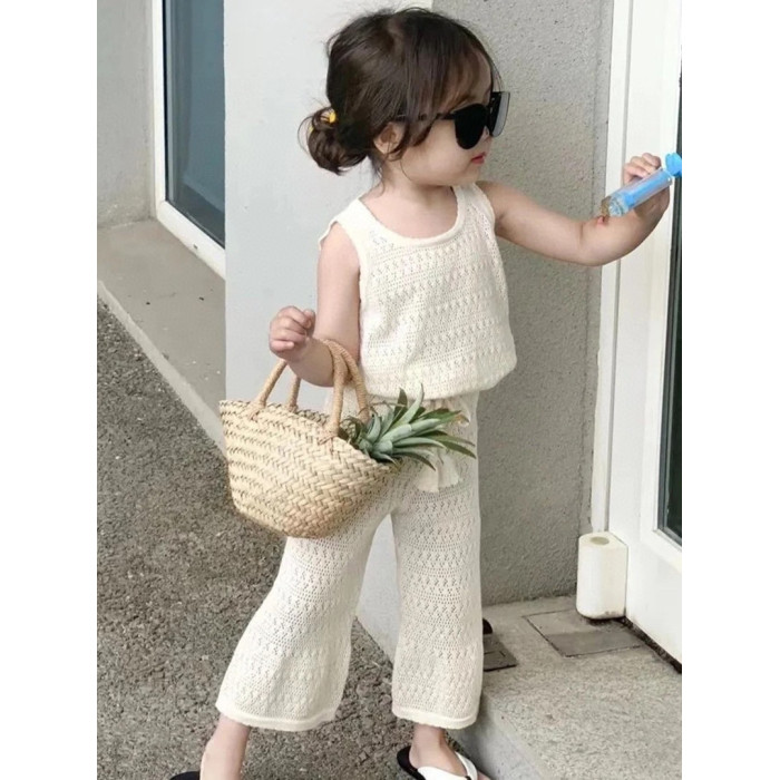 女童背心套裝夏2023鏤空上衣喇叭褲2件套兒童針織冰絲無袖T恤長褲