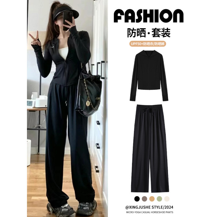 黑色冰絲防曬衣女夏季薄款修身顯瘦防紫外線套裝速乾運動褲濶腿褲